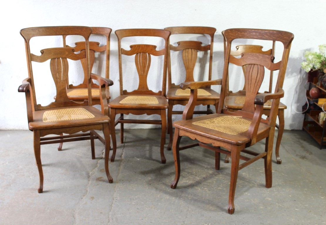 Set Of 6 Balloon Back Wood And Cane Dining Chairs