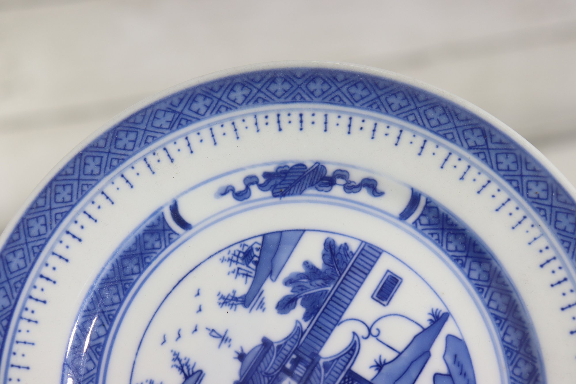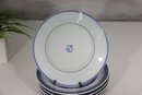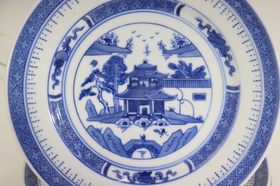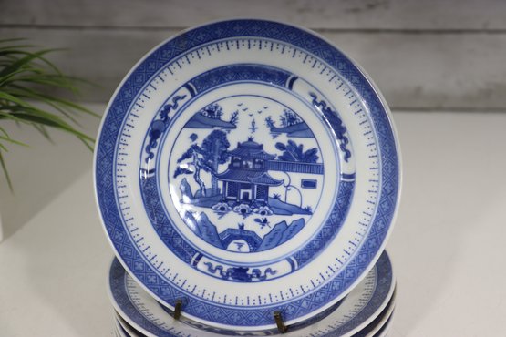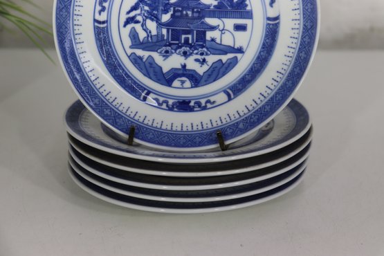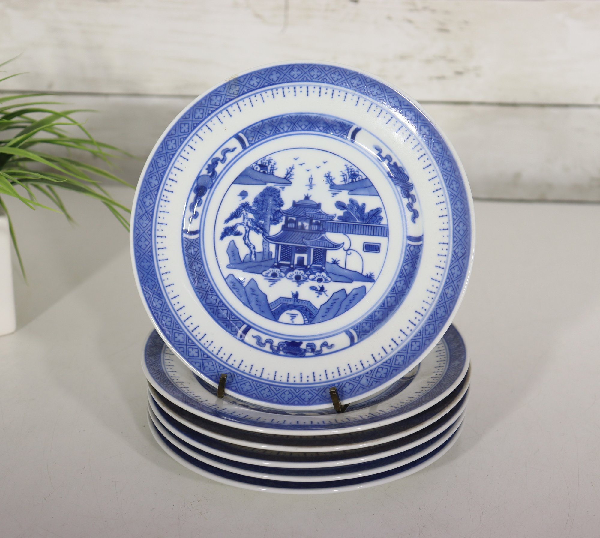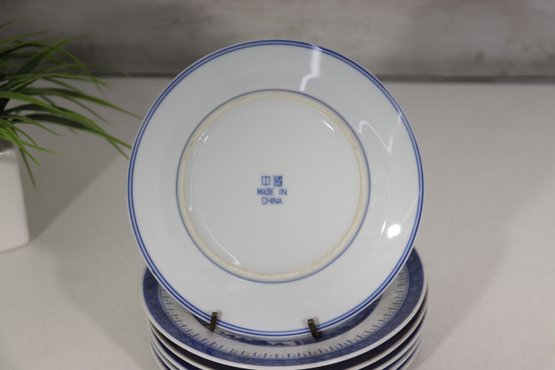 Classic and elegant, this set of 6 blue and white porcelain plates features a timeless Asian landscape scene with pagodas, trees, and bridges surrounded by intricate geometric and scroll borders. Each plate measures approximately 7 inches round, perfect for salad, dessert, or display use.