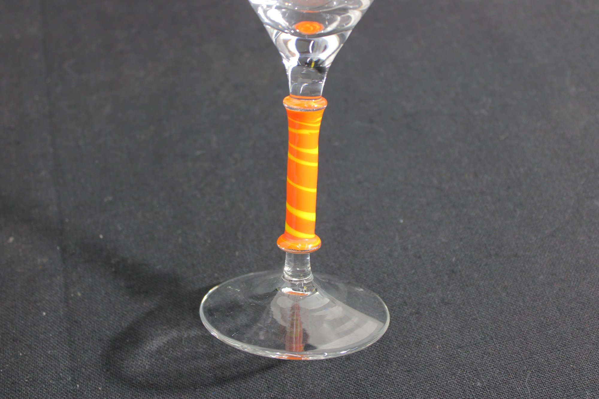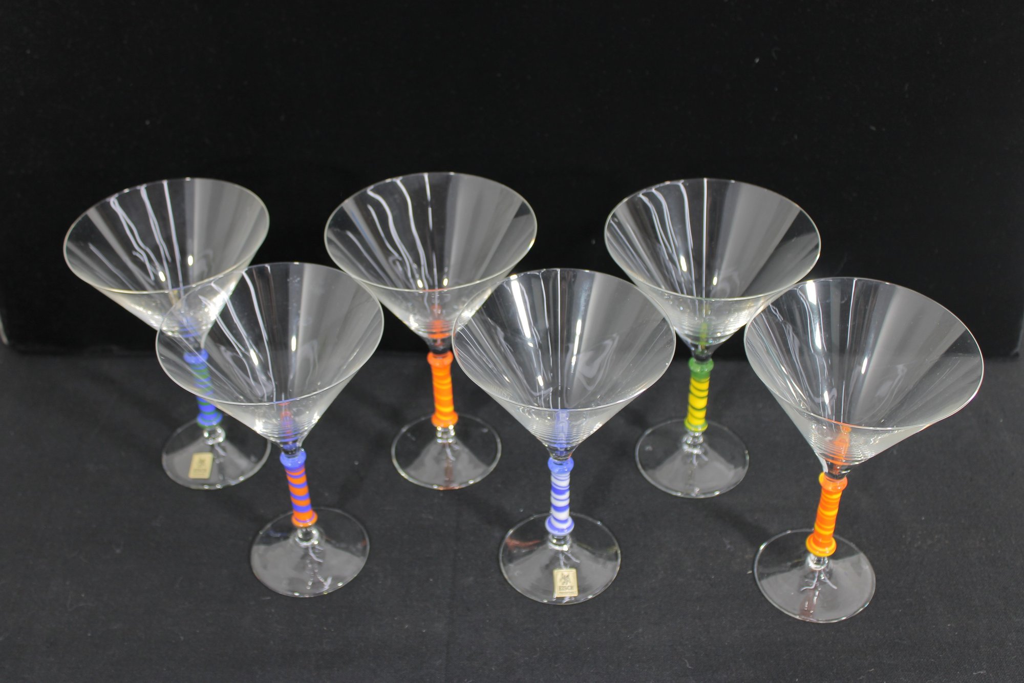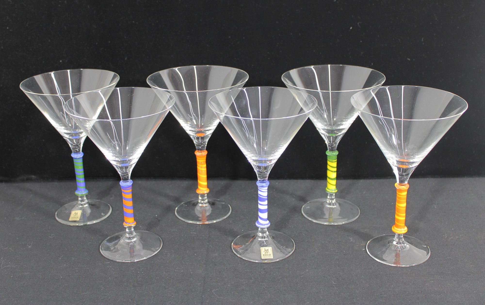 Vibrant set of six Eisch “Handarbeit” (handmade) martini glasses, each featuring a clear conical bowl paired with a uniquely colored and striped art glass stem. The bold stems in hues of orange, blue, green, and yellow create a playful yet sophisticated look, perfect for entertaining.