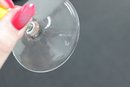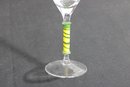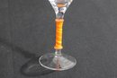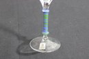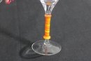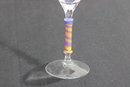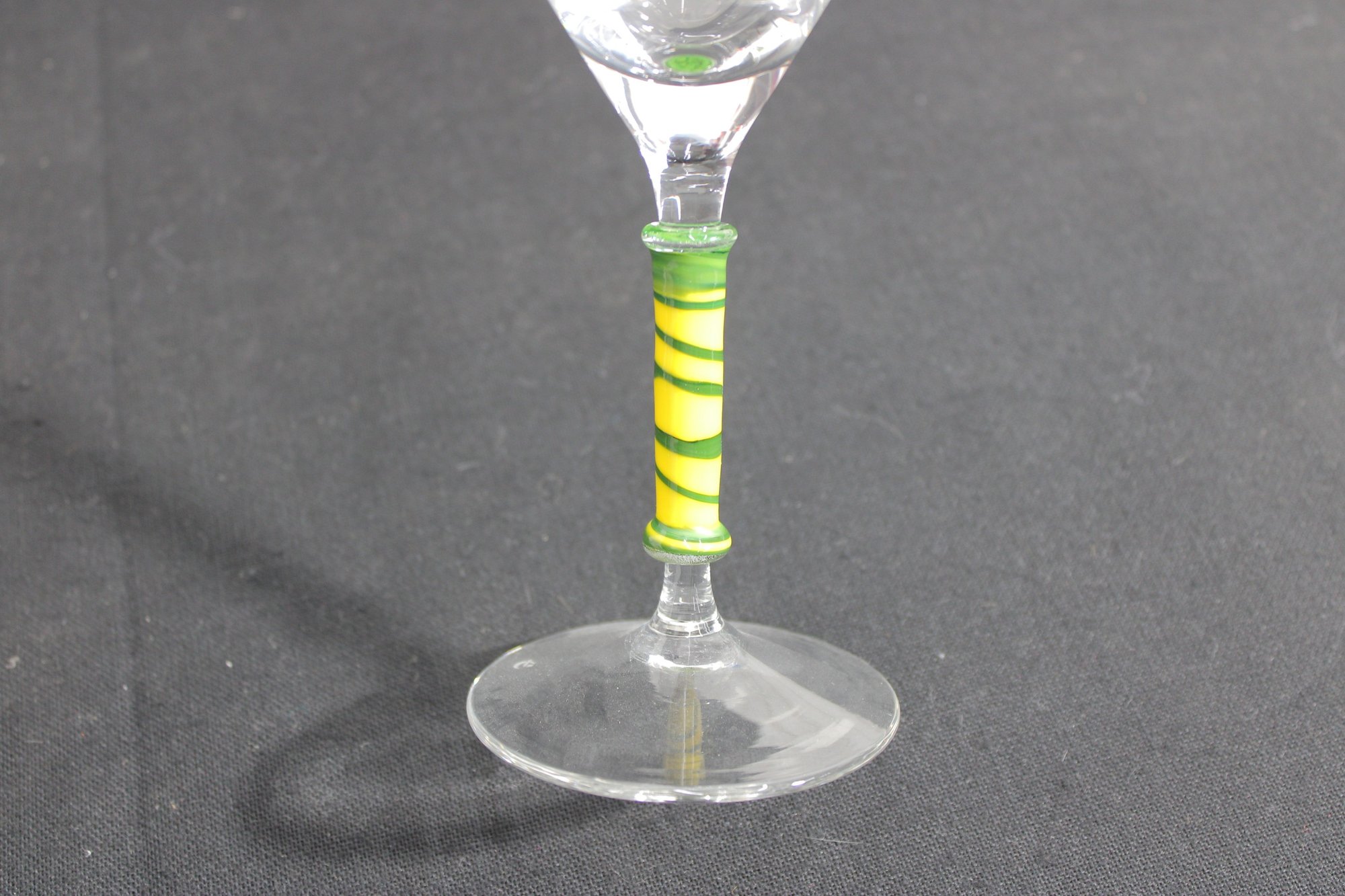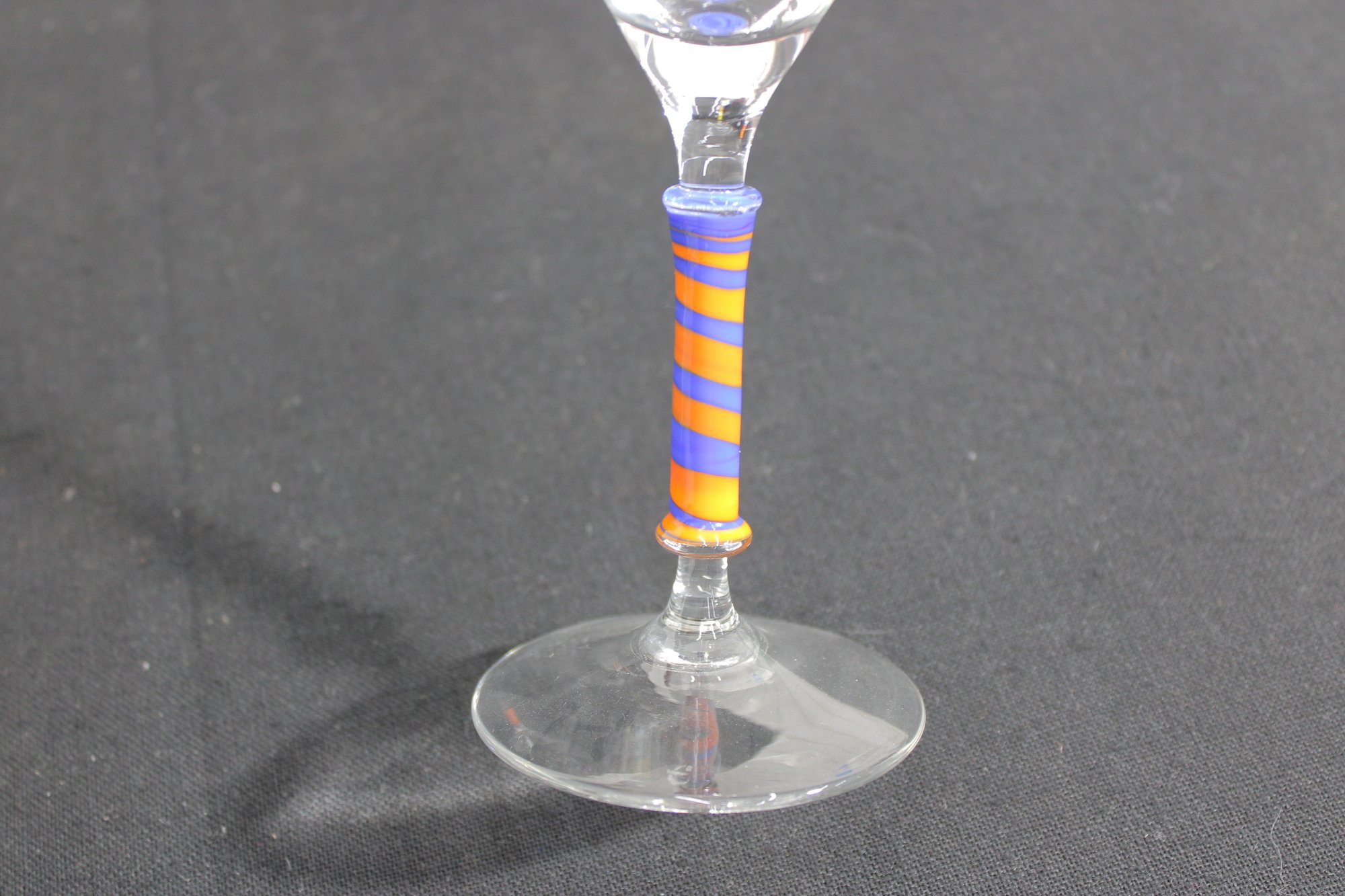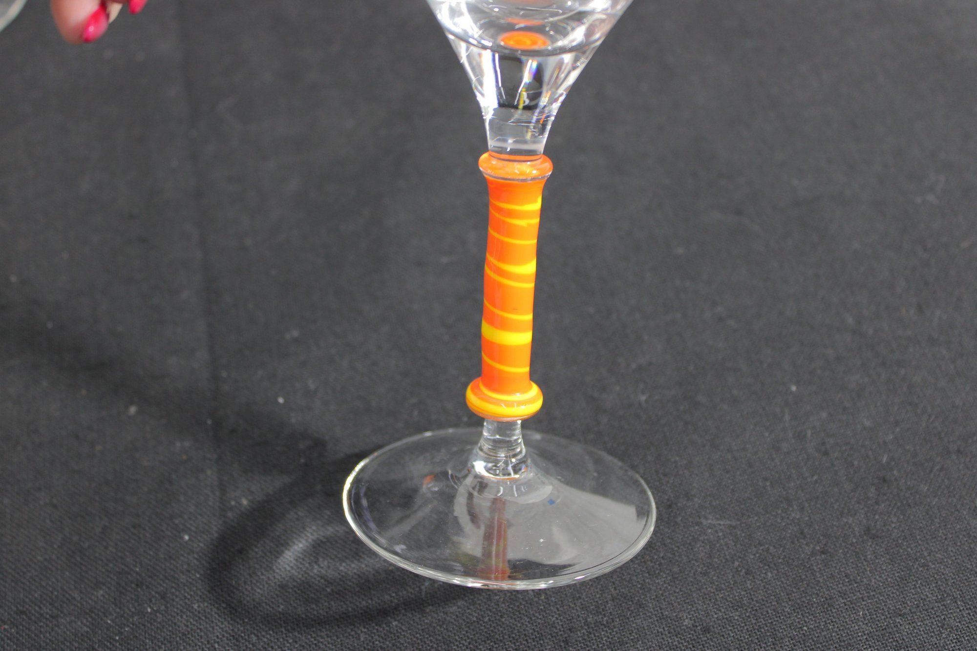 Vibrant set of six Eisch “Handarbeit” (handmade) martini glasses, each featuring a clear conical bowl paired with a uniquely colored and striped art glass stem. The bold stems in hues of orange, blue, green, and yellow create a playful yet sophisticated look, perfect for entertaining.