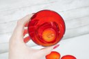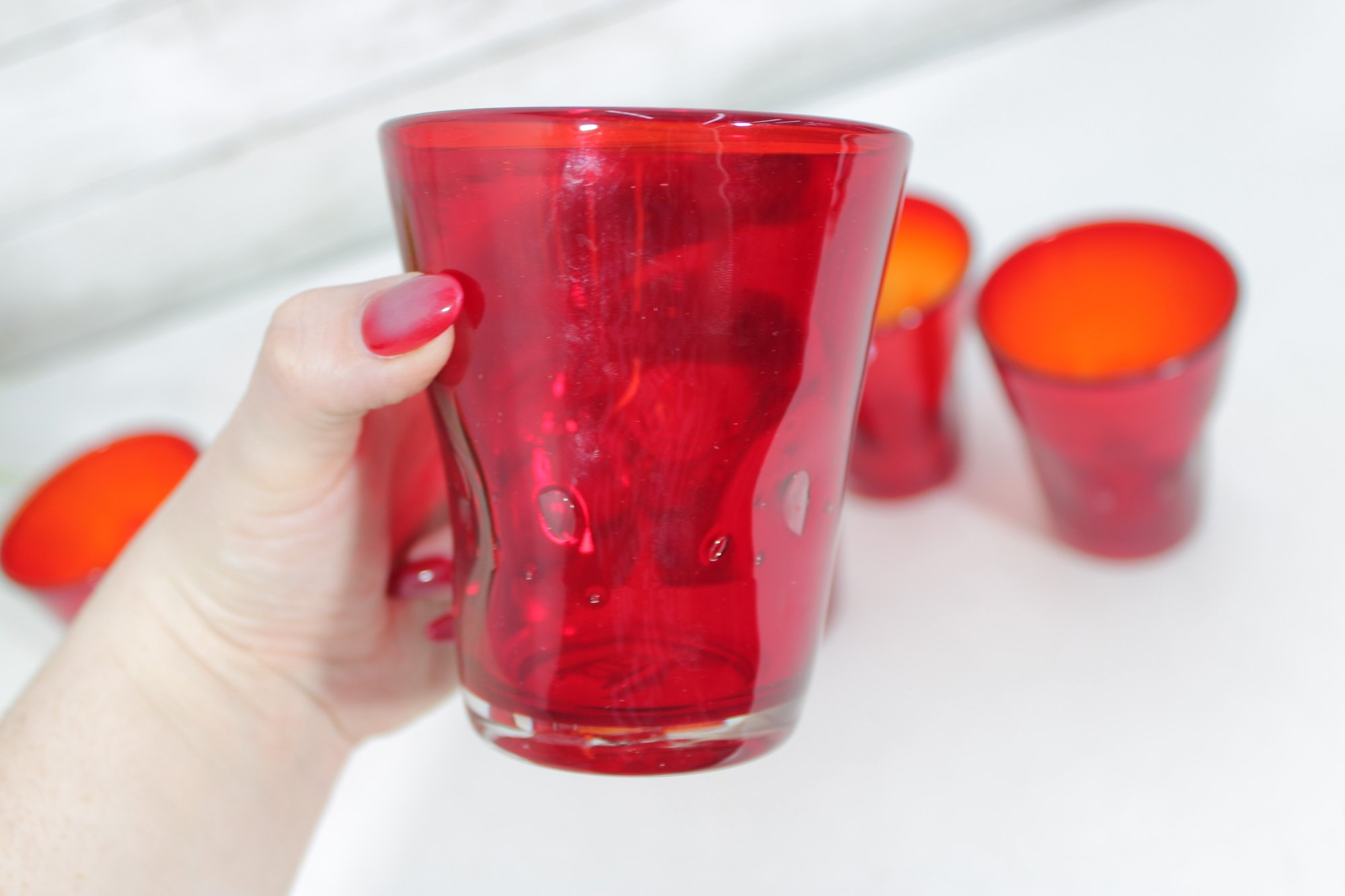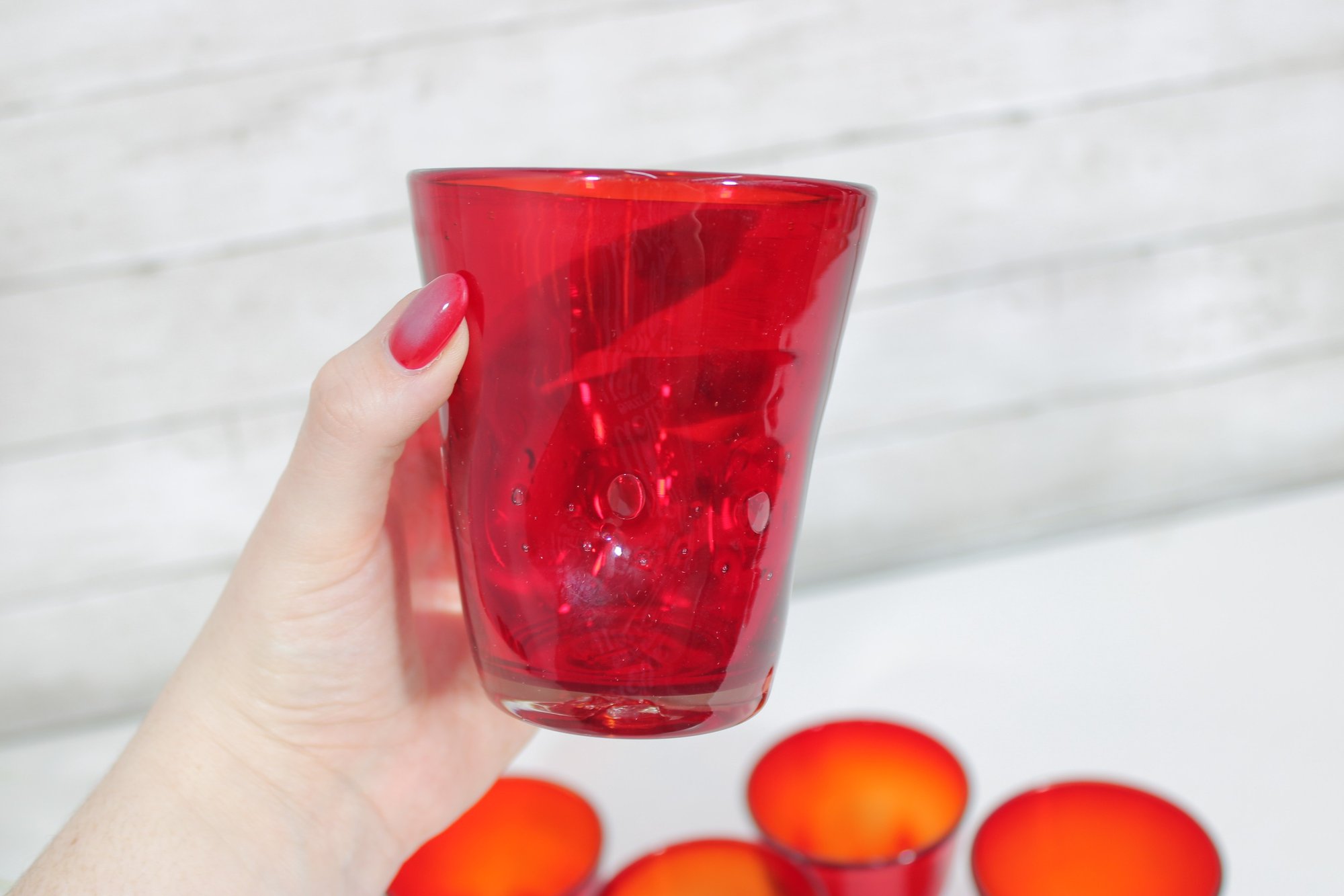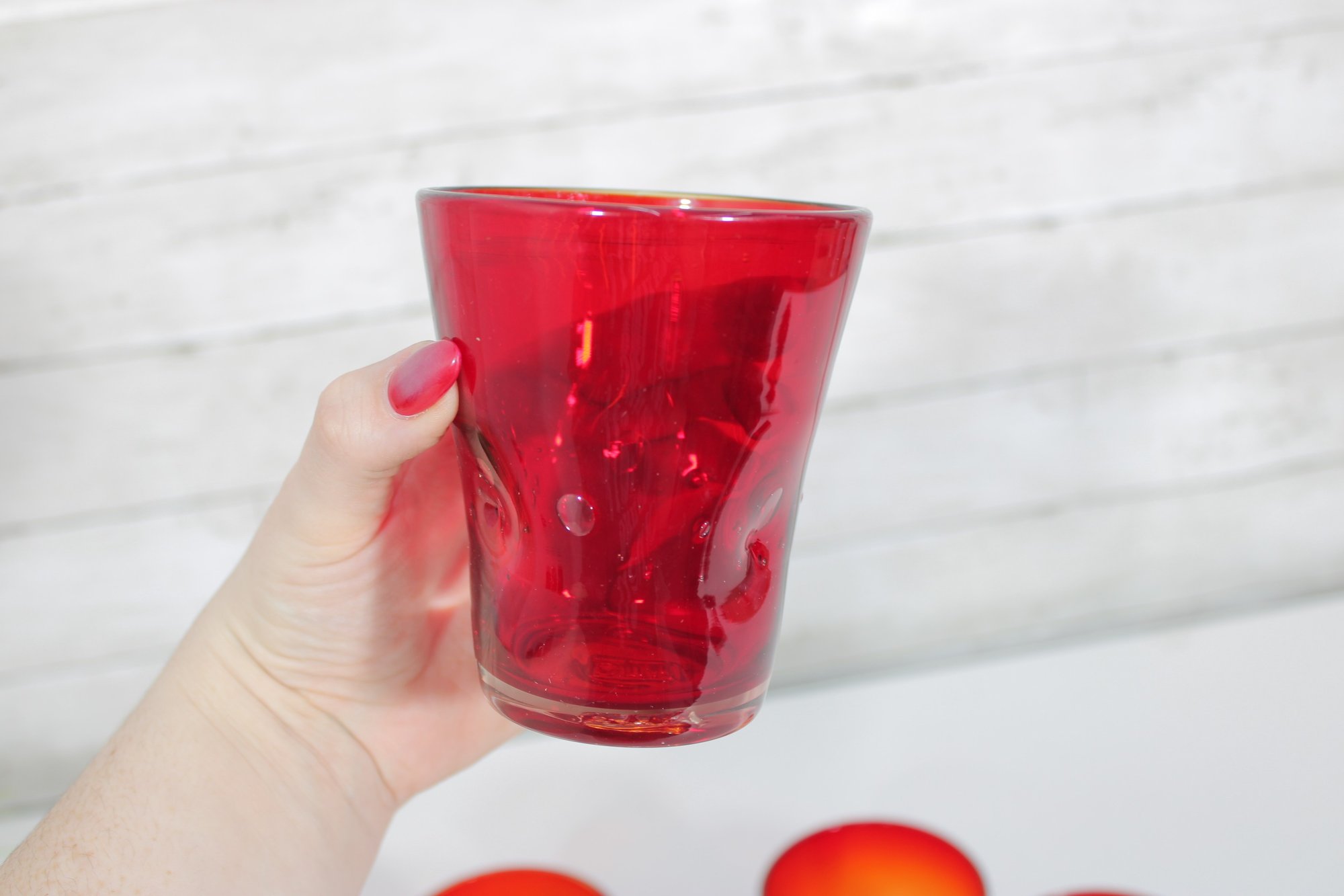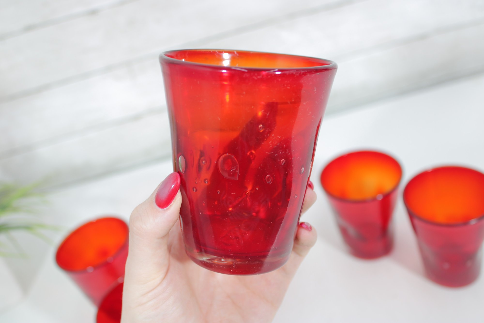 Each glass measures approximately 4” tall, making them perfect for serving water, juice, cocktails, or everyday beverages. The luminous red color adds a bold pop to any table setting or barware collection.