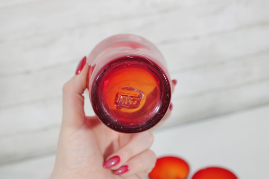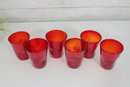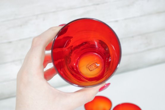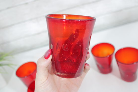 set of six red Henri glass tumblers, featuring a rich ruby tone with a warm amber glow toward the base. These glasses have a clean, slightly flared shape with subtle molded detailing, giving them a classic yet modern vintage appeal.