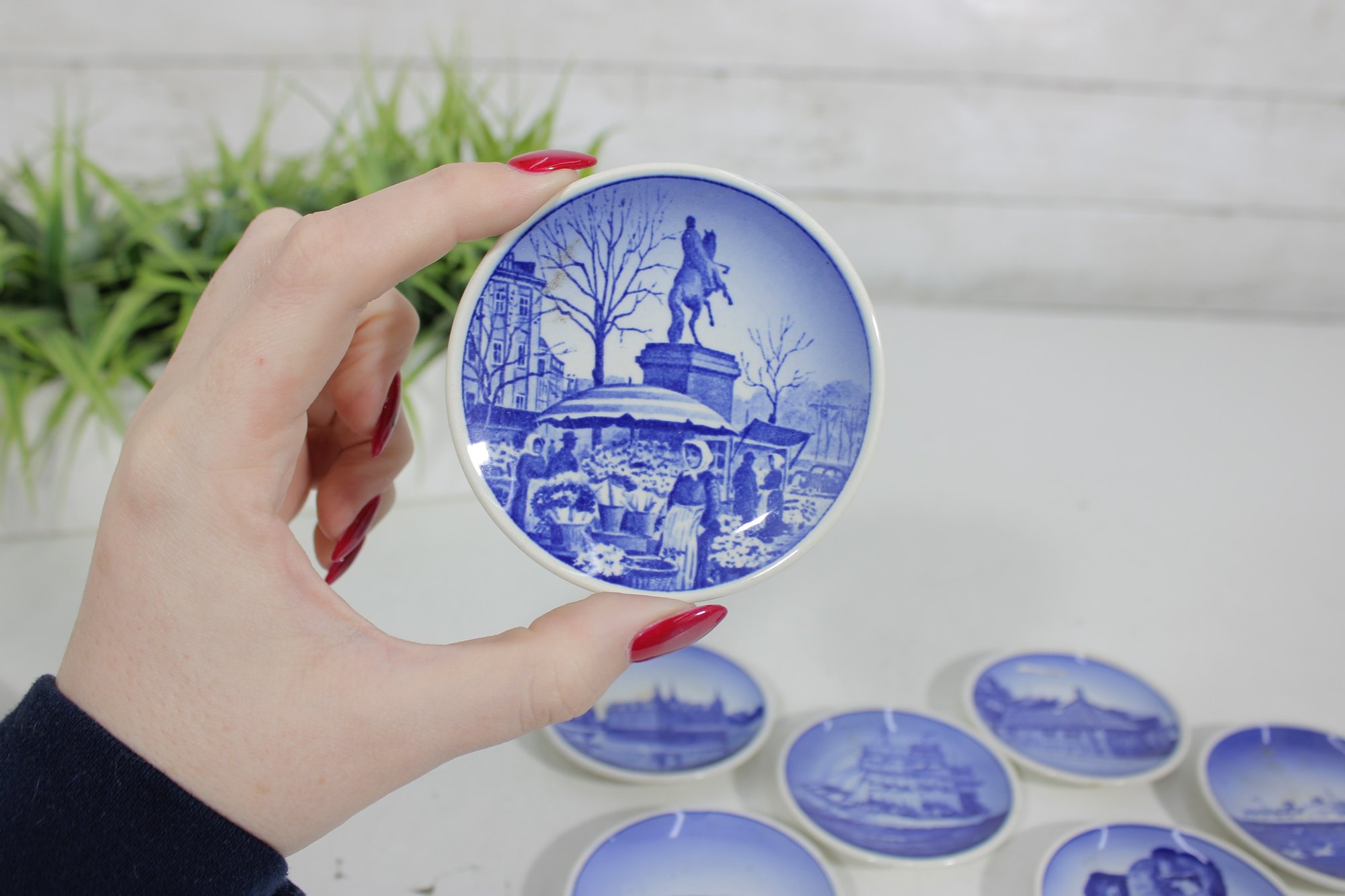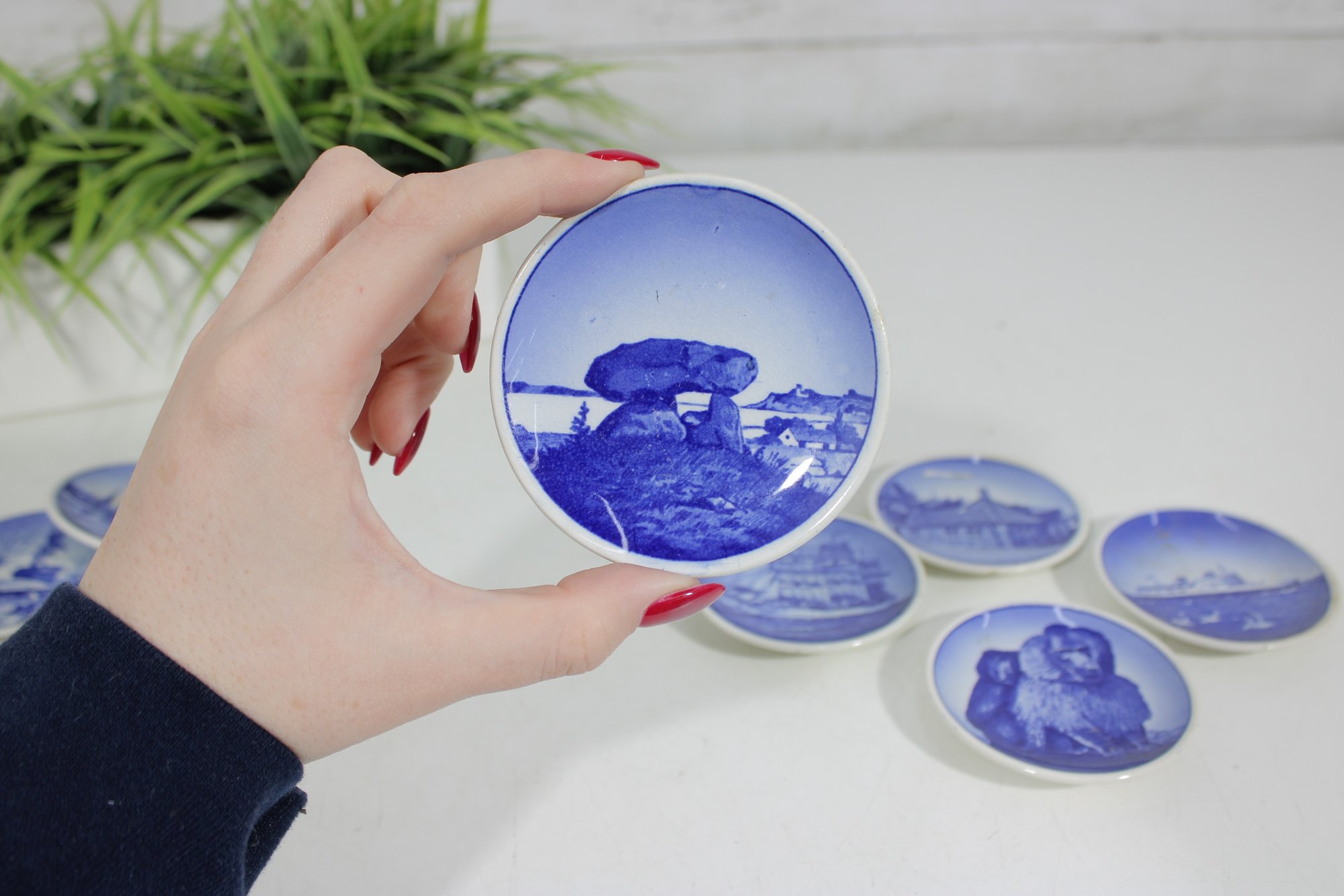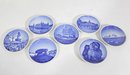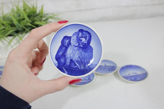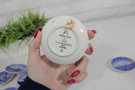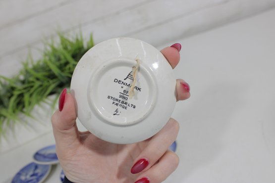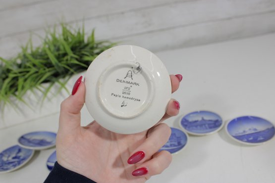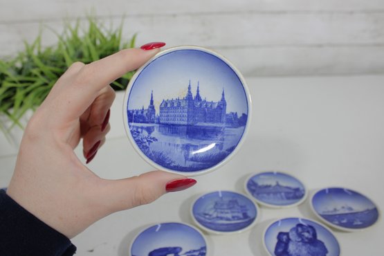 set of 6 Royal Copenhagen porcelain mini plates, each measuring approximately 3 inches in diameter. These beautifully crafted pieces feature classic blue and white designs depicting scenic landscapes, architecture, wildlife, and maritime imagery.