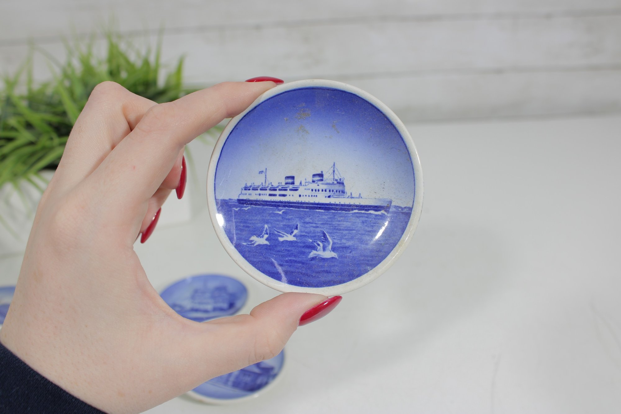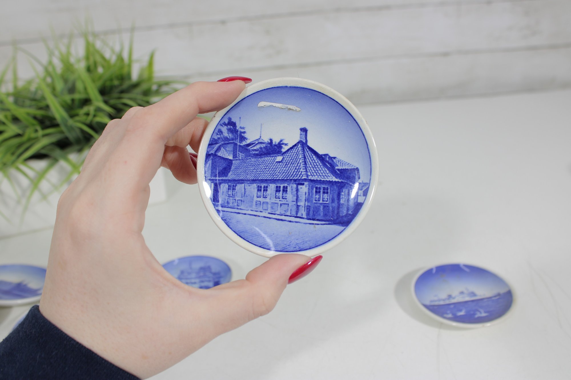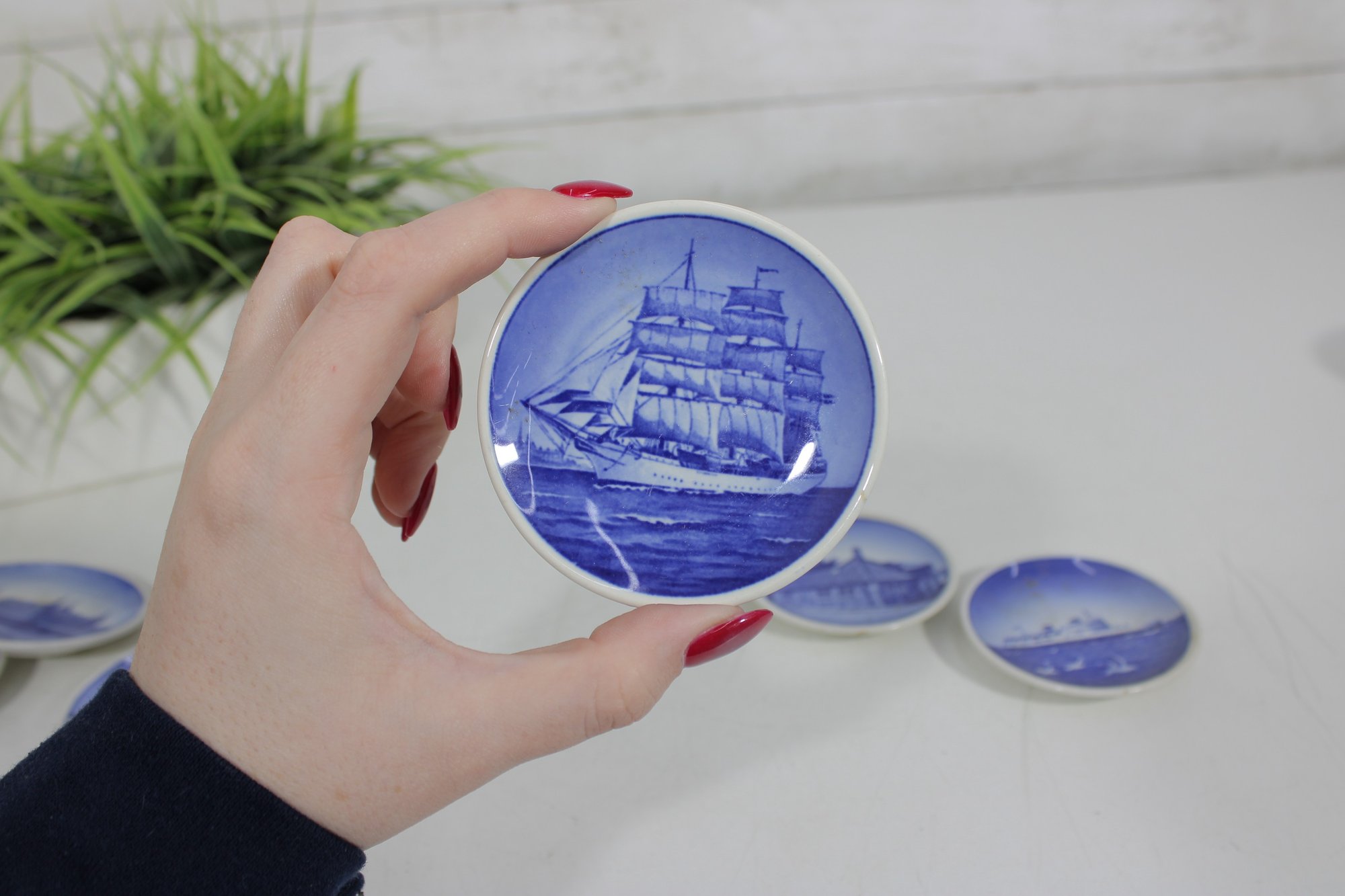 set of 6 Royal Copenhagen porcelain mini plates, each measuring approximately 3 inches in diameter. These beautifully crafted pieces feature classic blue and white designs depicting scenic landscapes, architecture, wildlife, and maritime imagery.