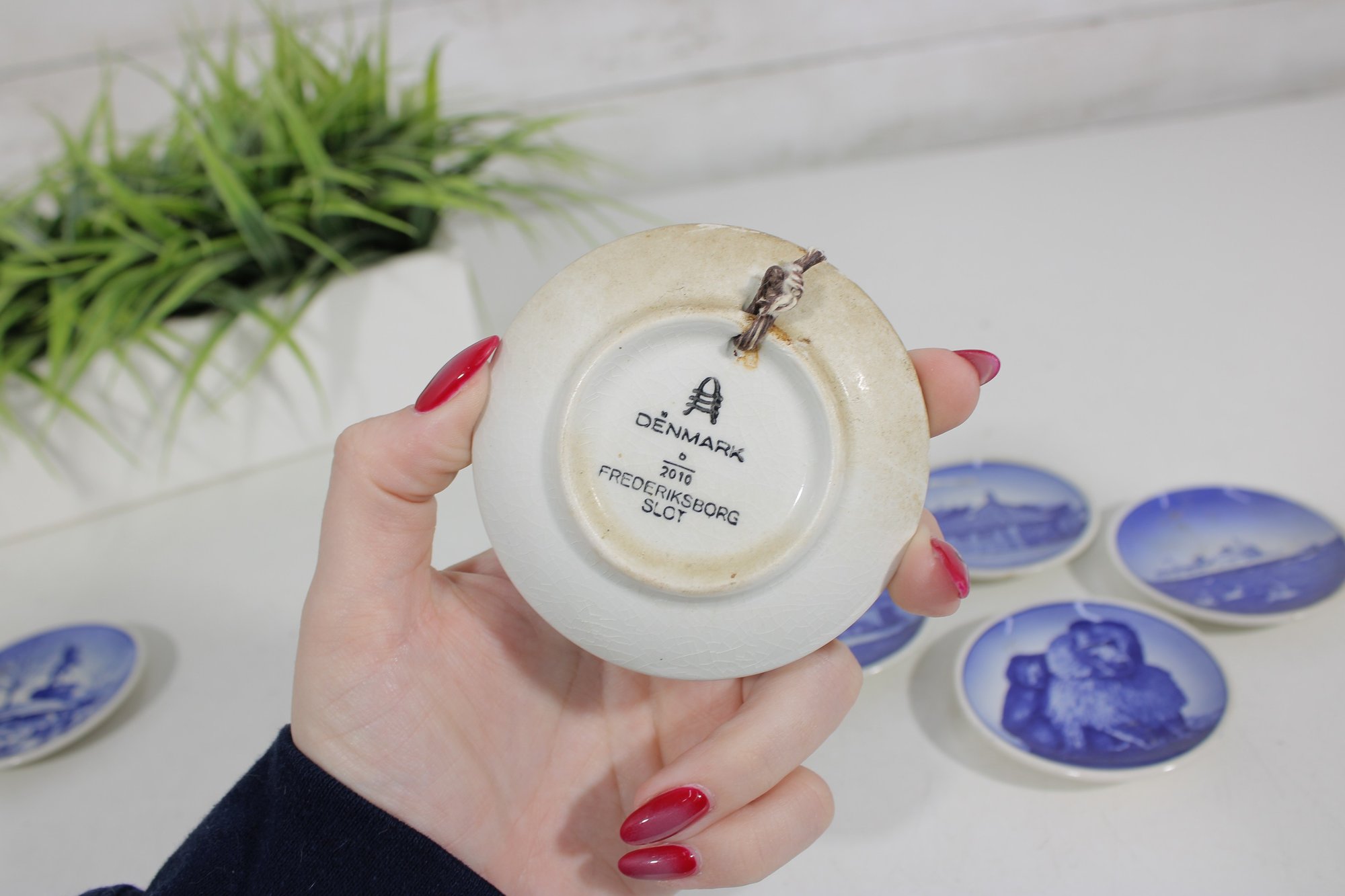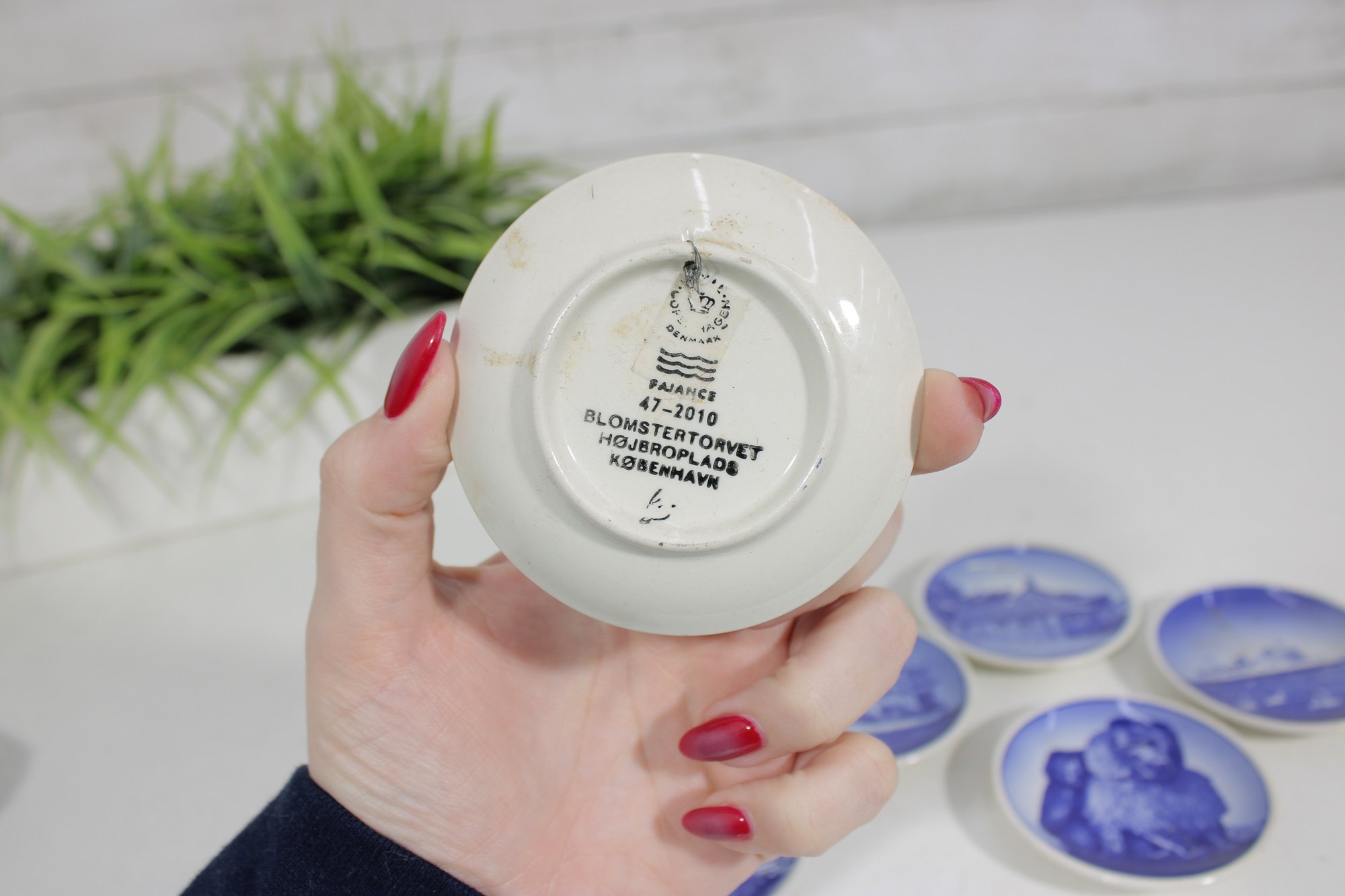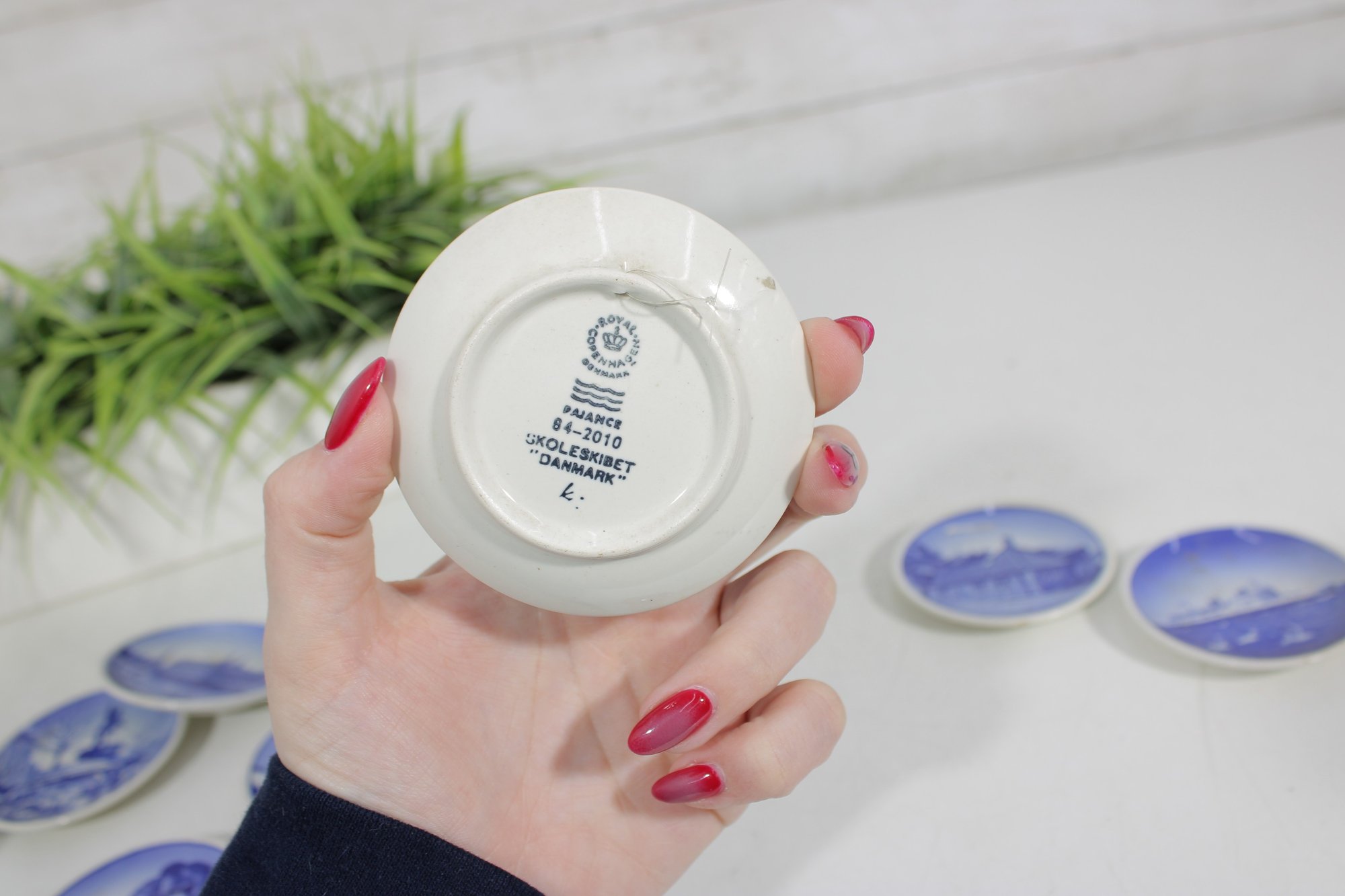 Each plate is finely detailed in the traditional Danish style, showcasing the timeless elegance and craftsmanship Royal Copenhagen is known for. The backs are marked with the Royal Copenhagen hallmark and identification numbers, confirming their authenticity.
