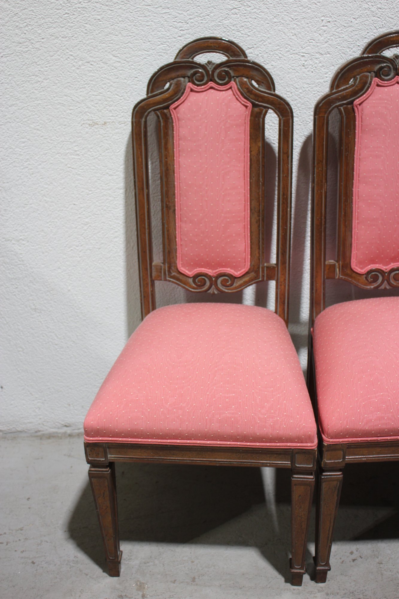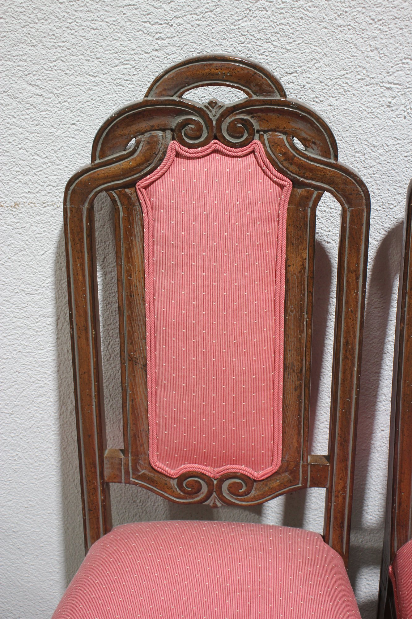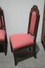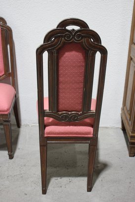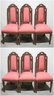 set of six vintage dining chairs features intricately carved wooden frames with a distinctive arched and scrolled backrest design, adding a refined touch to any dining space.