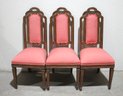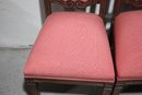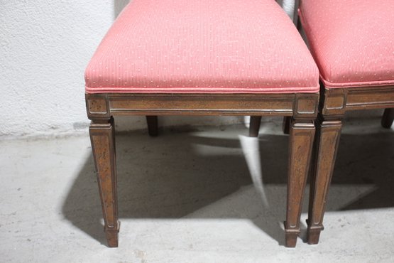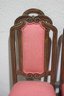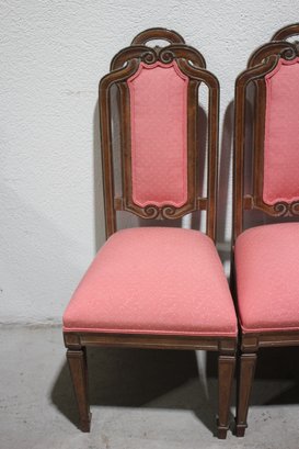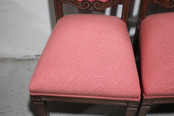 Each chair is upholstered in a soft pink fabric with subtle patterns, offering a charming contrast to the warm wood tones. The padded seats ensure comfortable seating, while the sturdy construction provides durability.