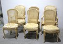 dd a touch of French Provincial elegance to your dining room with this set of six vintage dining chairs. Each chair features a classic cane back and carved wooden frame with curvaceous cabriole legs, exuding old-world charm. The chairs include four side chairs and two armchairs, each with upholstered seats in a vintage golden patterned fabric, which shows some wear and tear, making them perfect candidates for upholstery to match your decor. Some cane backs show signs of wear and may require repair. These beautiful chairs are ideal for restoration or as-is for a rustic, time-worn aesthetic.