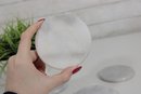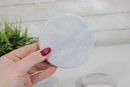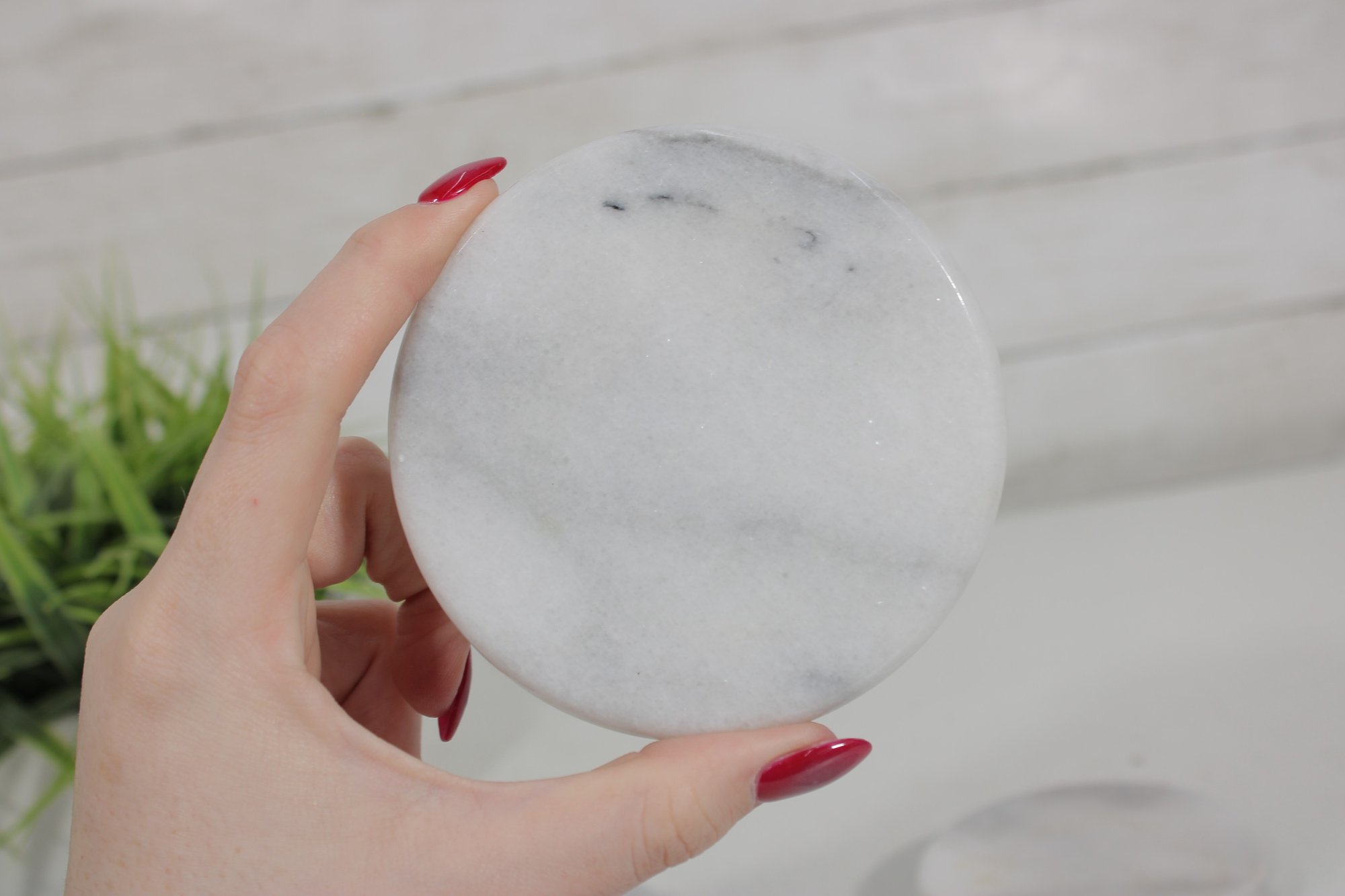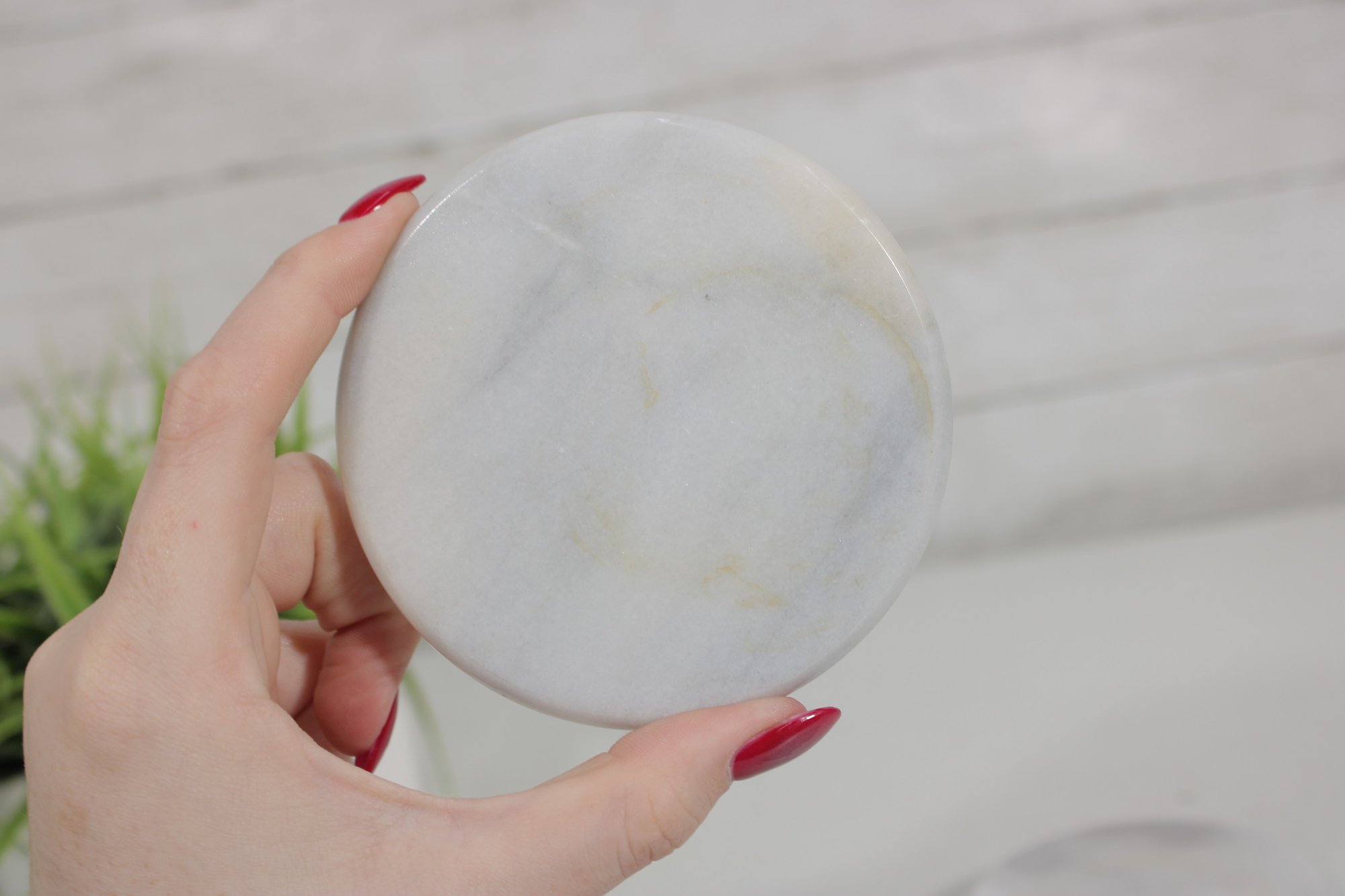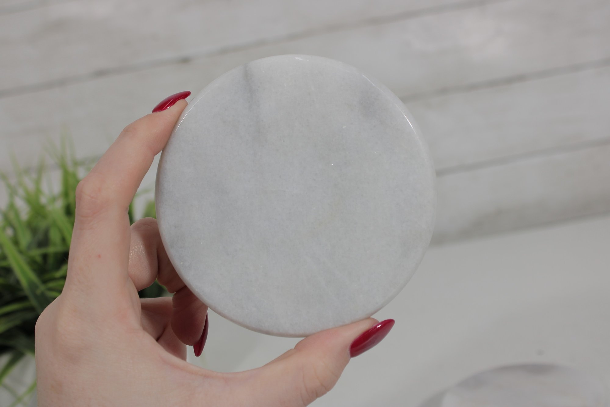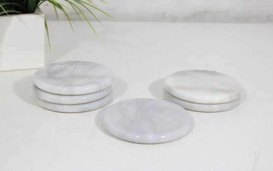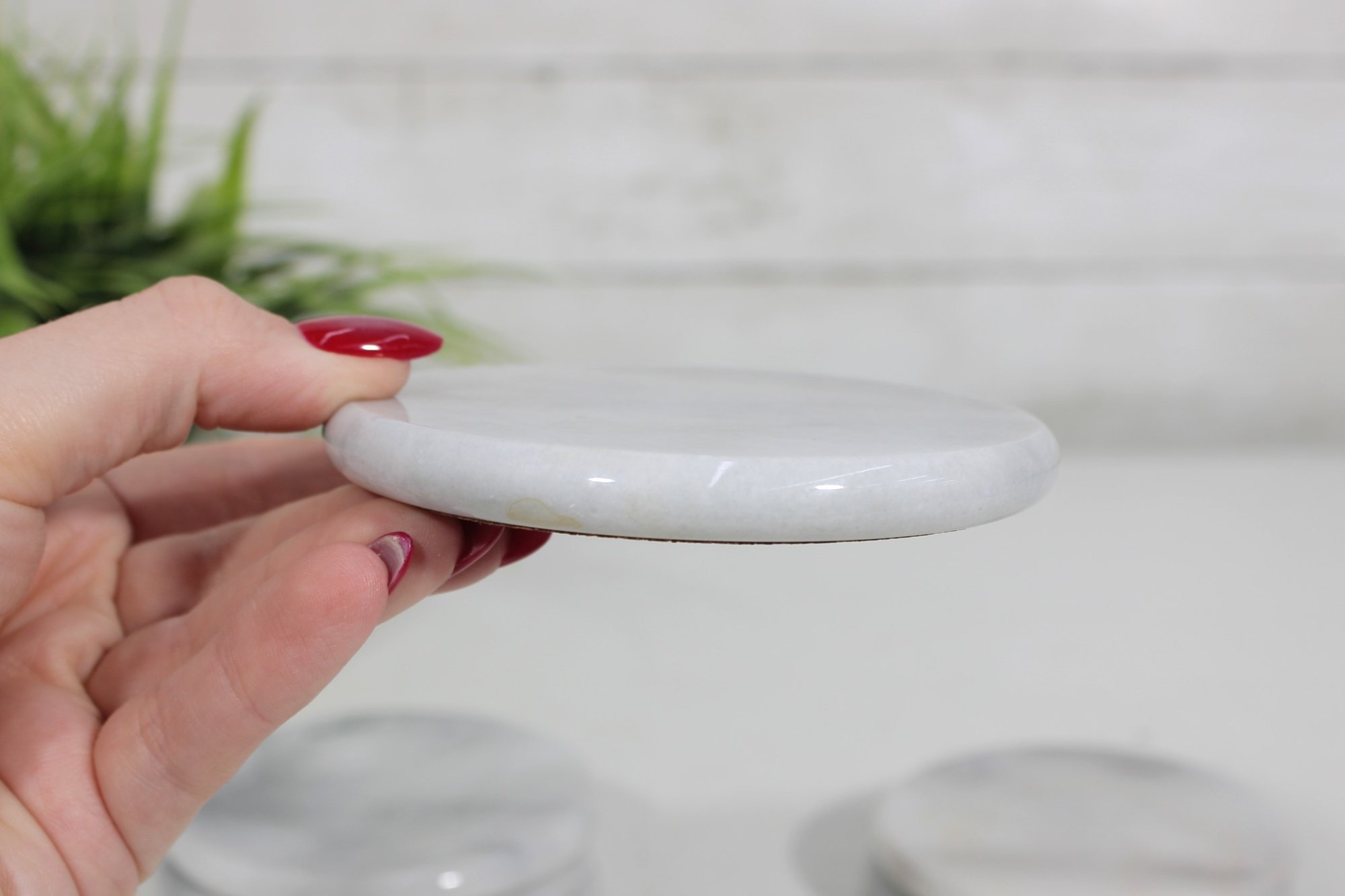 set of 6 white marble coasters. Each coaster measures approximately 3.5 inches in diameter and features a smooth, polished marble surface with subtle natural veining, giving every piece a unique look.
