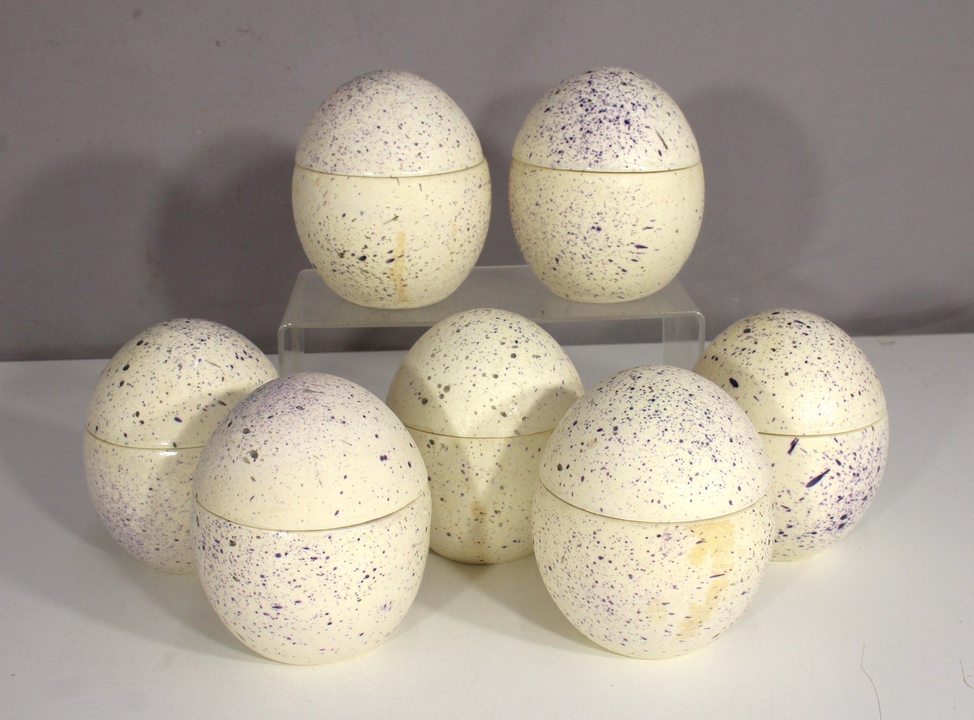 Get ready for spring and Easter celebrations with this delightful set of 7 hand-painted ceramic egg boxes, signed by artist for Caviar Direct. Each egg is beautifully crafted in a creamy off-white glaze with speckled purple and black accents, mimicking the look of natural bird eggs. These lidded containers open at the center, making them perfect for storing treats, trinkets, or Easter surprises!