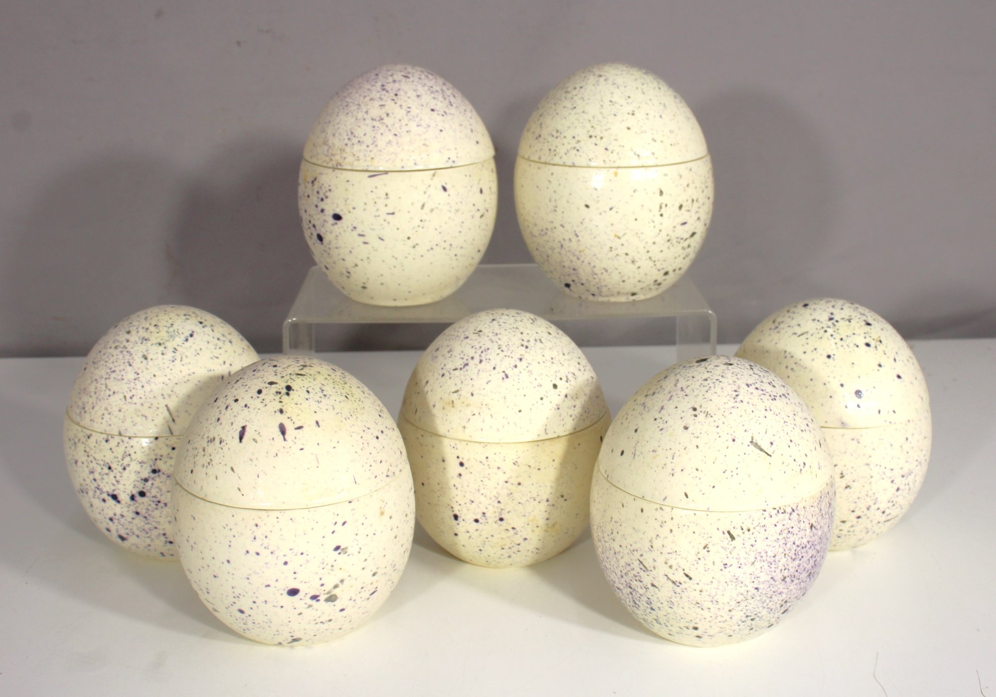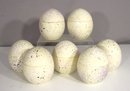 Get ready for spring and Easter celebrations with this delightful set of 7 hand-painted ceramic egg boxes, signed by artist for Caviar Direct. Each egg is beautifully crafted in a creamy off-white glaze with speckled purple and black accents, mimicking the look of natural bird eggs. These lidded containers open at the center, making them perfect for storing treats, trinkets, or Easter surprises!