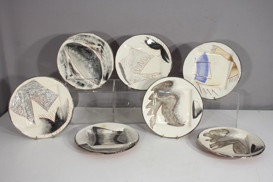 a remarkable set of seven (7) hand-painted ceramic plates by artist Loughran, each signed and dated 1984. These 9-inch round plates are excellent examples of 1980s modernist studio pottery, featuring bold abstract forms, dynamic lines, and gestural brushwork in a palette of black, white, and occasional color accents.