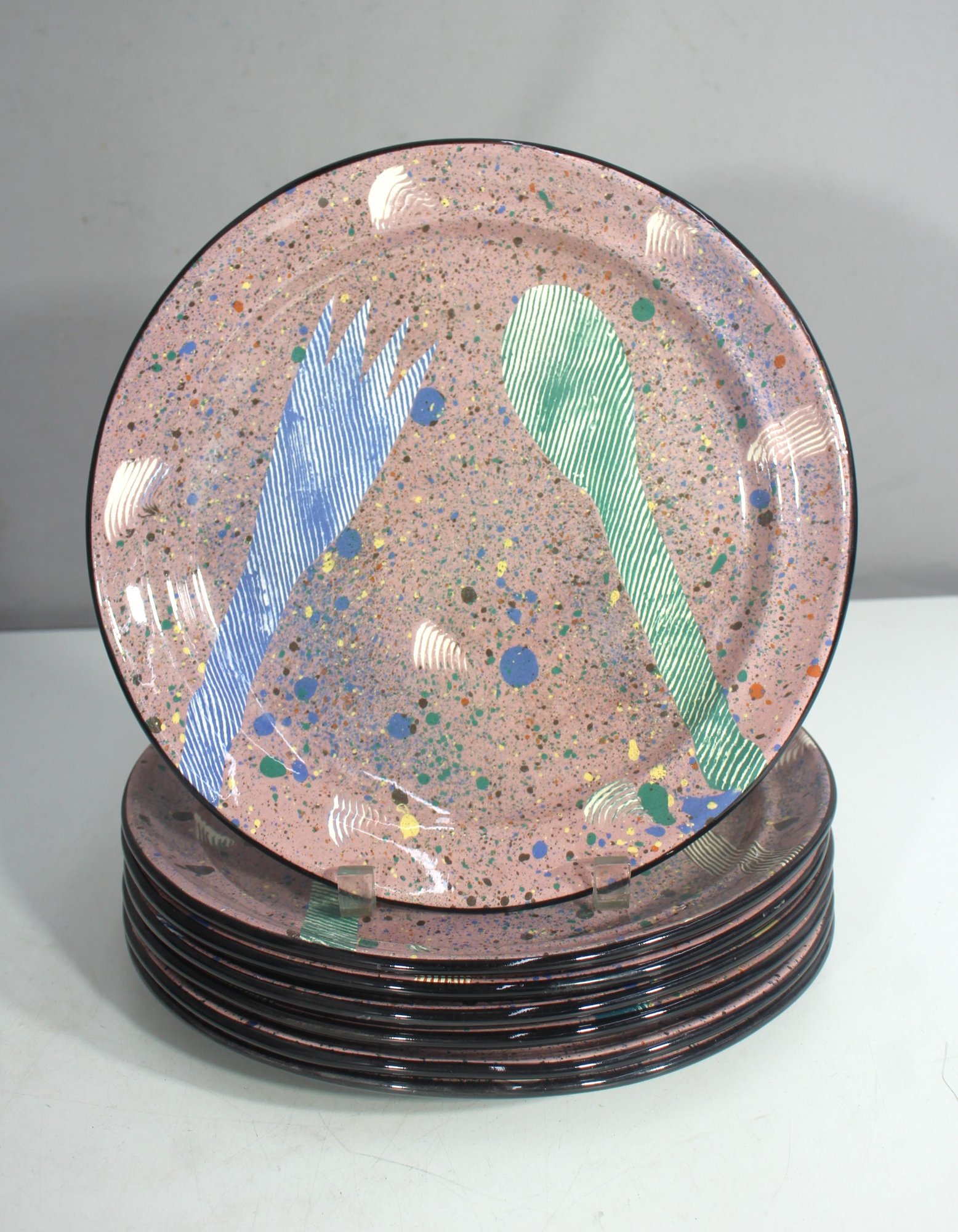Bring bold postmodern flair to your table with this set of seven (7) vintage 1980s dinner plates by designer Claudia Reese. Measuring 11 inches in diameter, each plate features a whimsical cutlery silhouette design in blue and green, set against a speckled pink and multicolor splatter background—an iconic nod to the Memphis and New Wave design movements.
