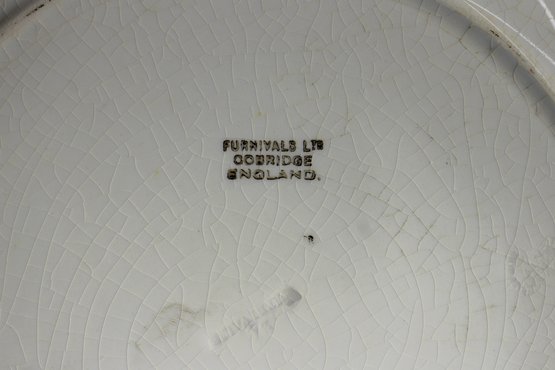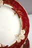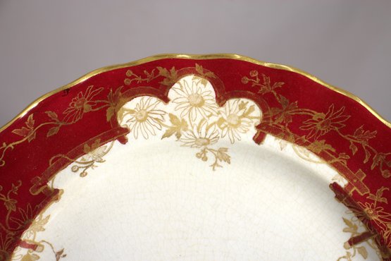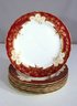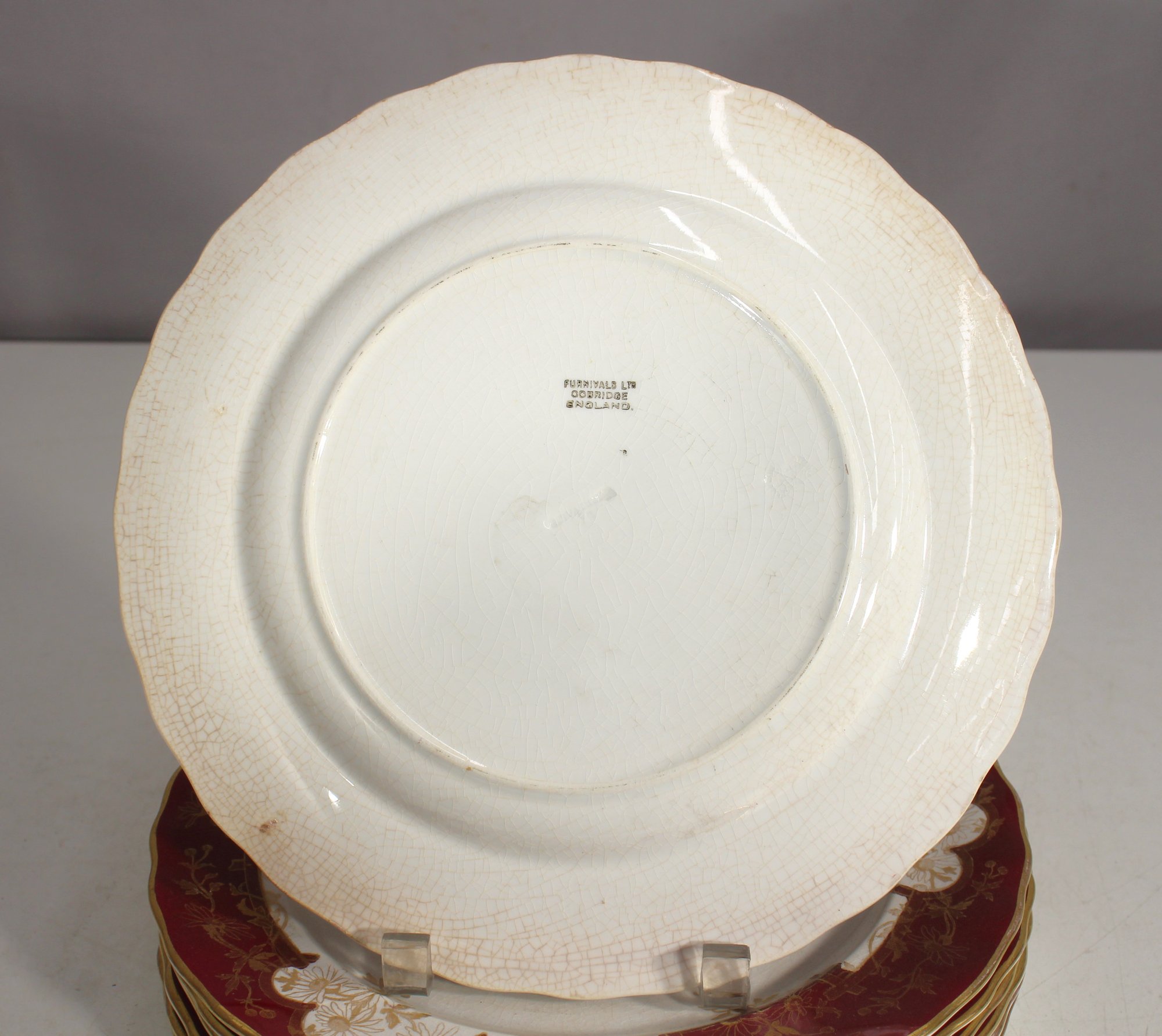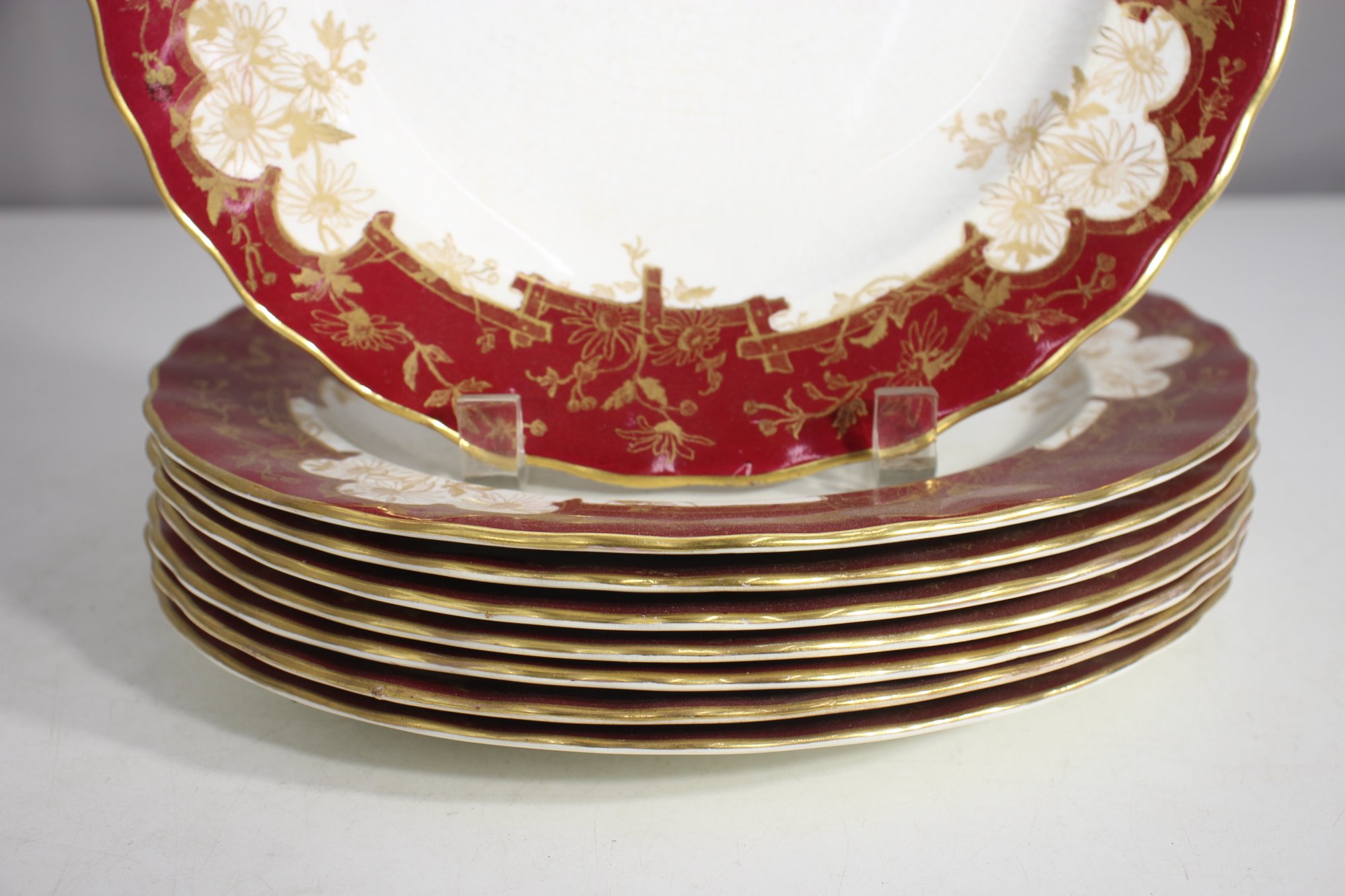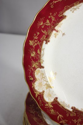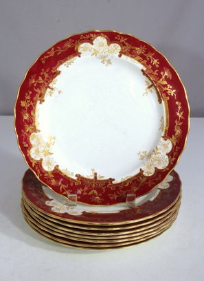 set of 8 antique 10.5-inch dinner plates by Furnivals Ltd, England, showcases an elegant red and gold floral design with a scalloped gold-trimmed edge. These plates embody timeless sophistication, making them a perfect addition to any fine china collection or vintage table setting.