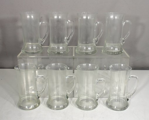 Set Of 8 Clear Glass Beer Mugs 6" Tall Sturdy Handle & Base