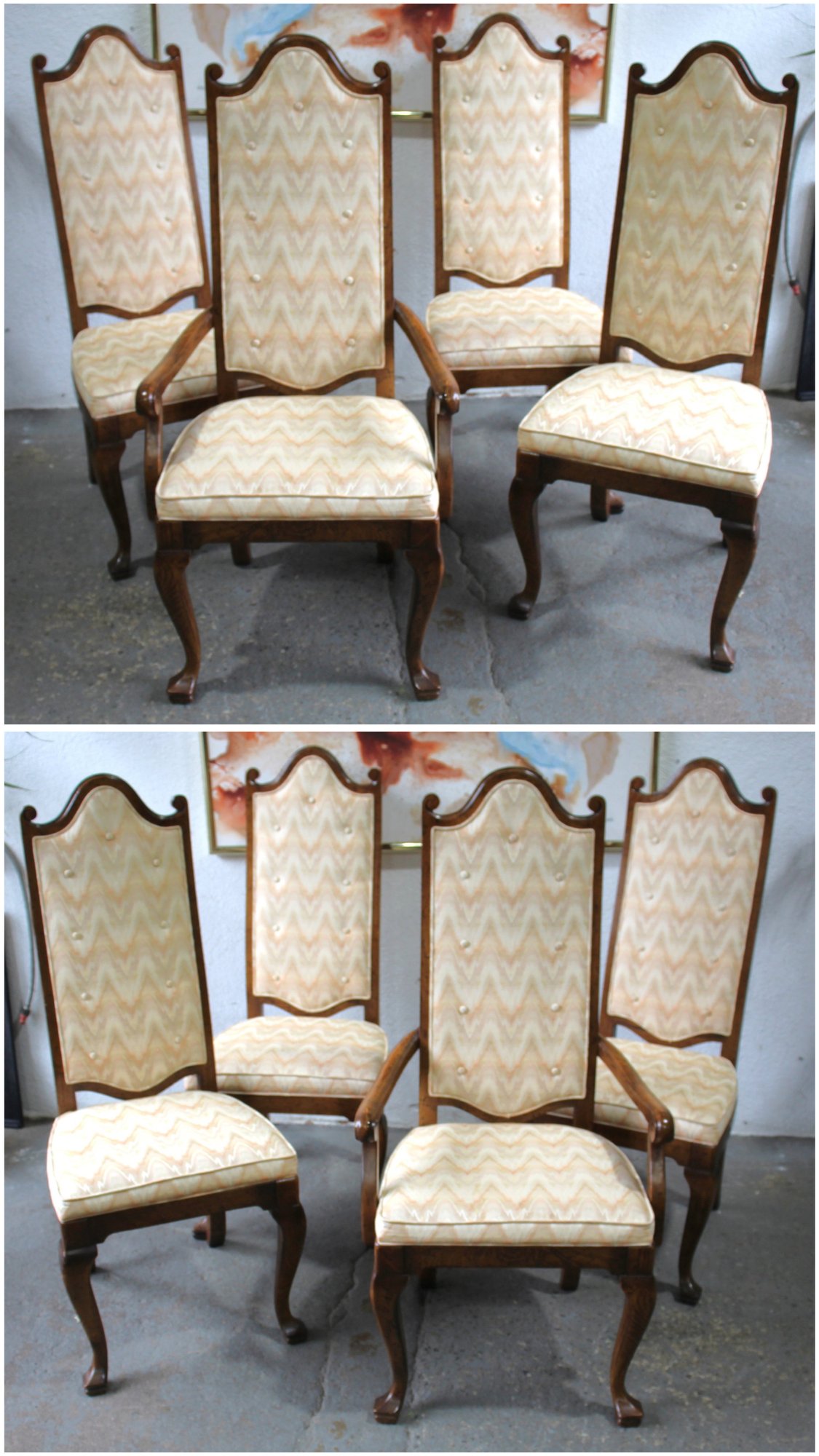 Elevate your dining experience with this exquisite set of 8 vintage dining chairs, featuring a classic wood finish and stylish chevron-patterned upholstery. These chairs are designed to blend seamlessly with both traditional and contemporary dining room decor