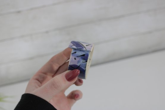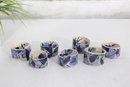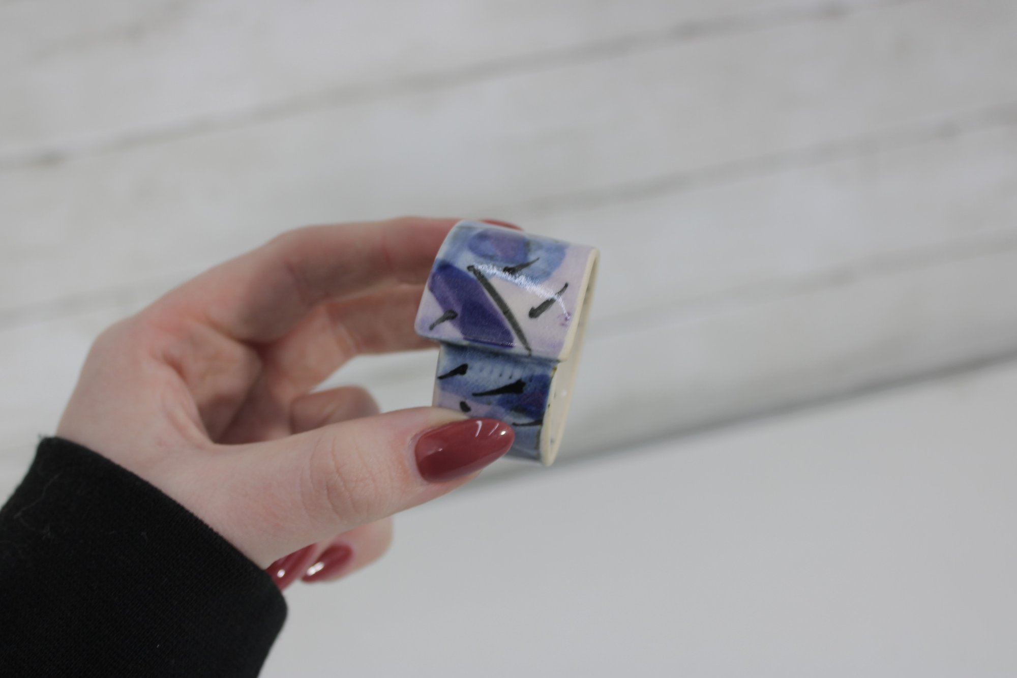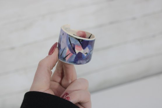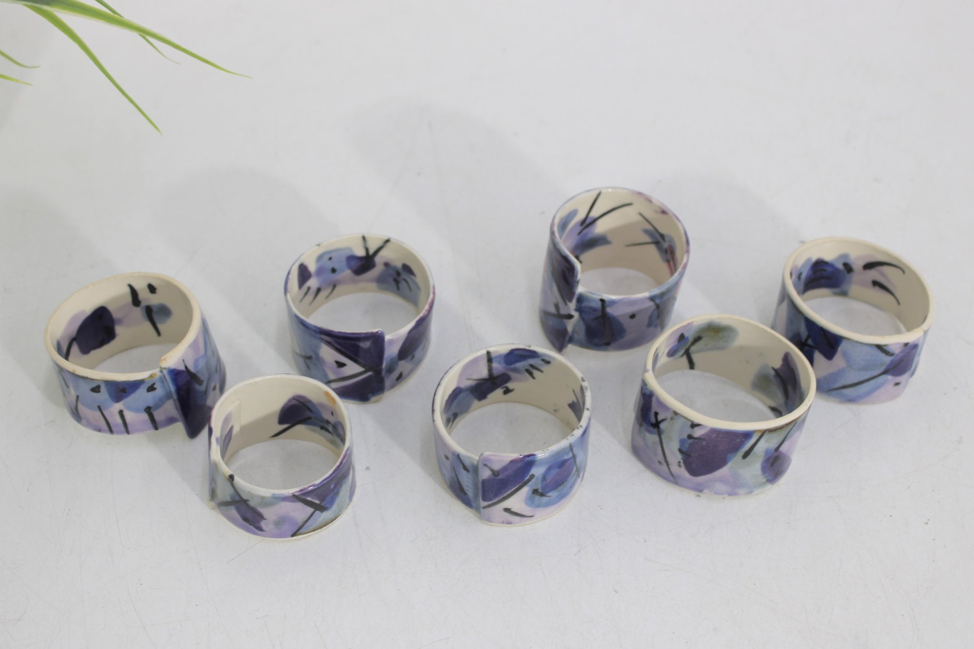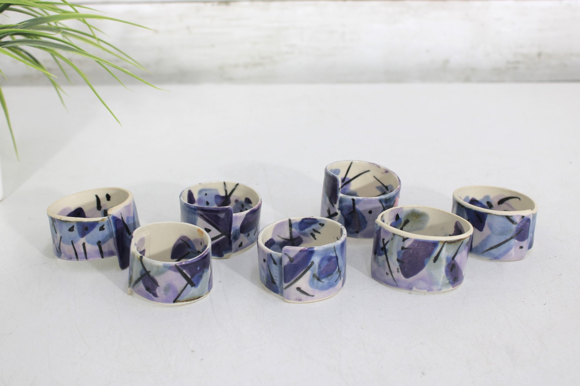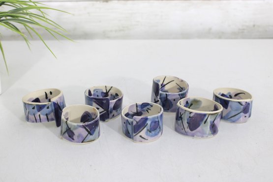 Set of eight hand-painted ceramic napkin rings featuring a beautiful abstract design in shades of purple, lavender, blue, and cream. The geometric brushstroke pattern gives them a modern, artistic look that will elevate any table setting.