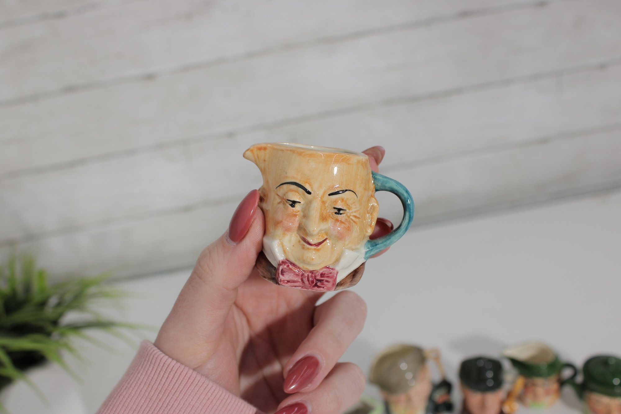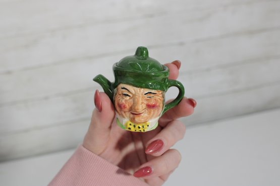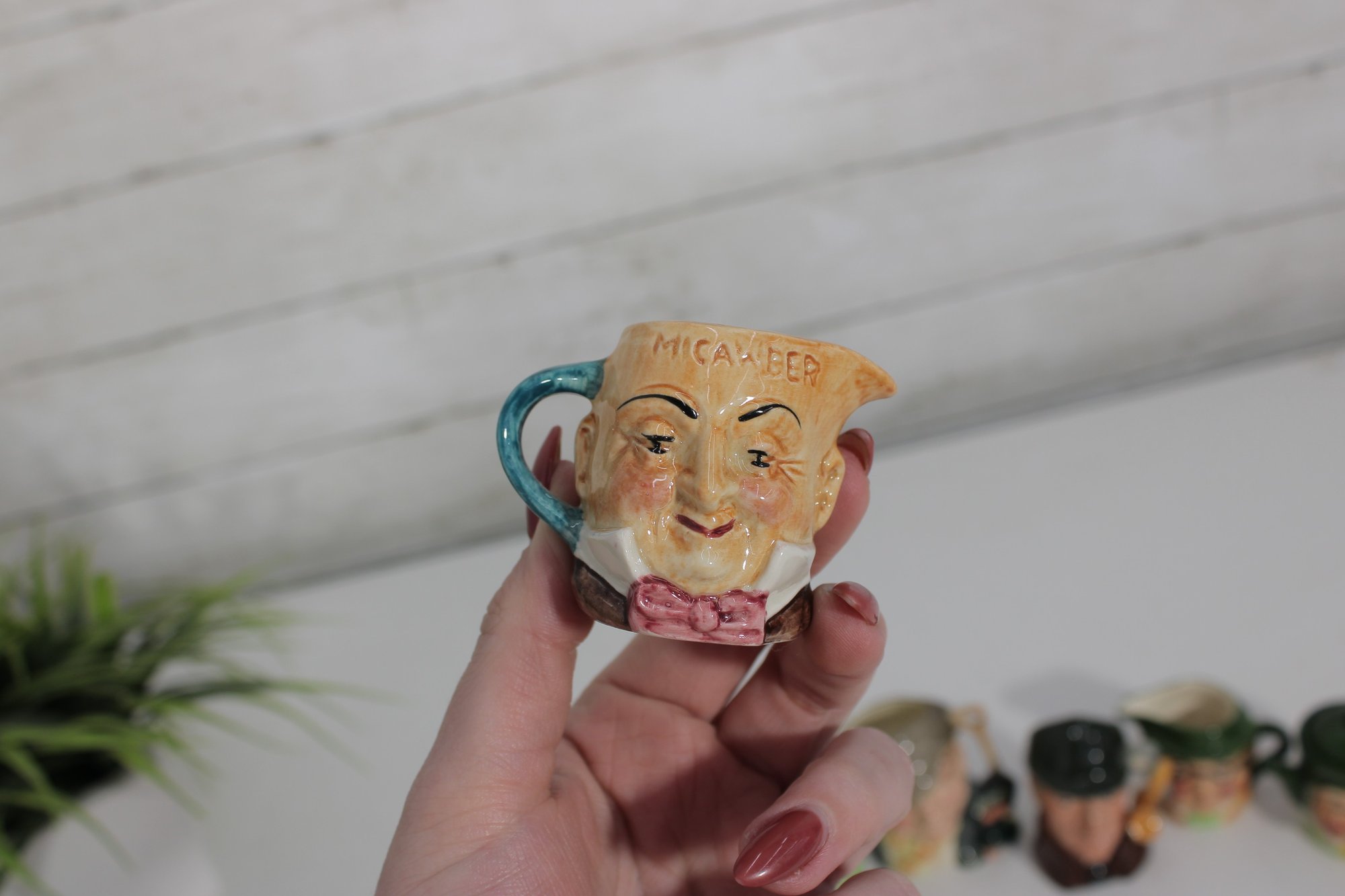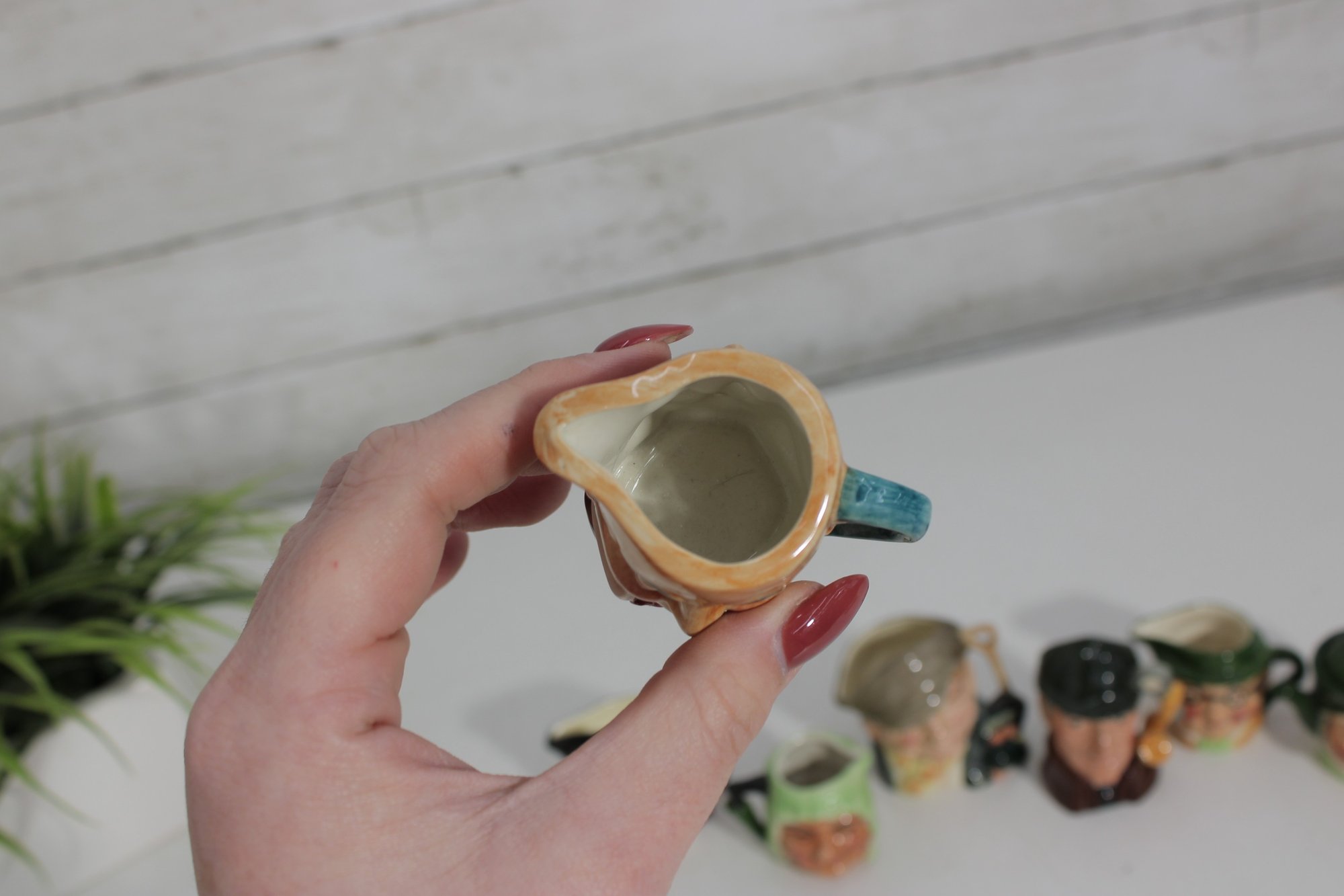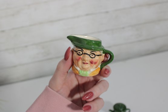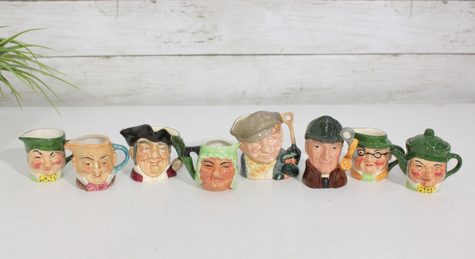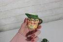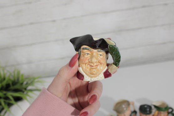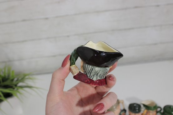 a charming set of nine hand-painted figural face mugs, each featuring a distinct character with expressive detail and personality. These miniature mugs are crafted in the classic Toby-style tradition, with raised facial features, period hats, and carefully applied paintwork that gives every piece its own unique character.