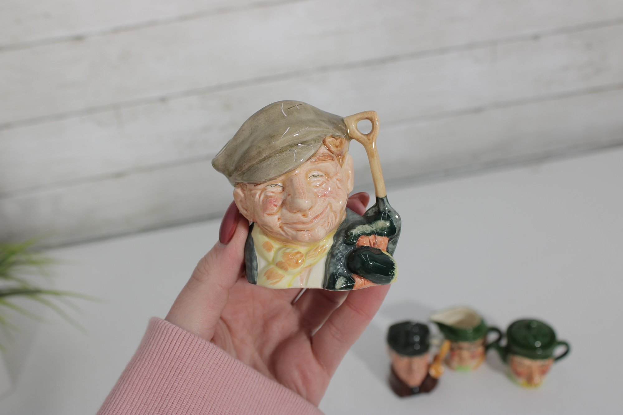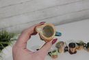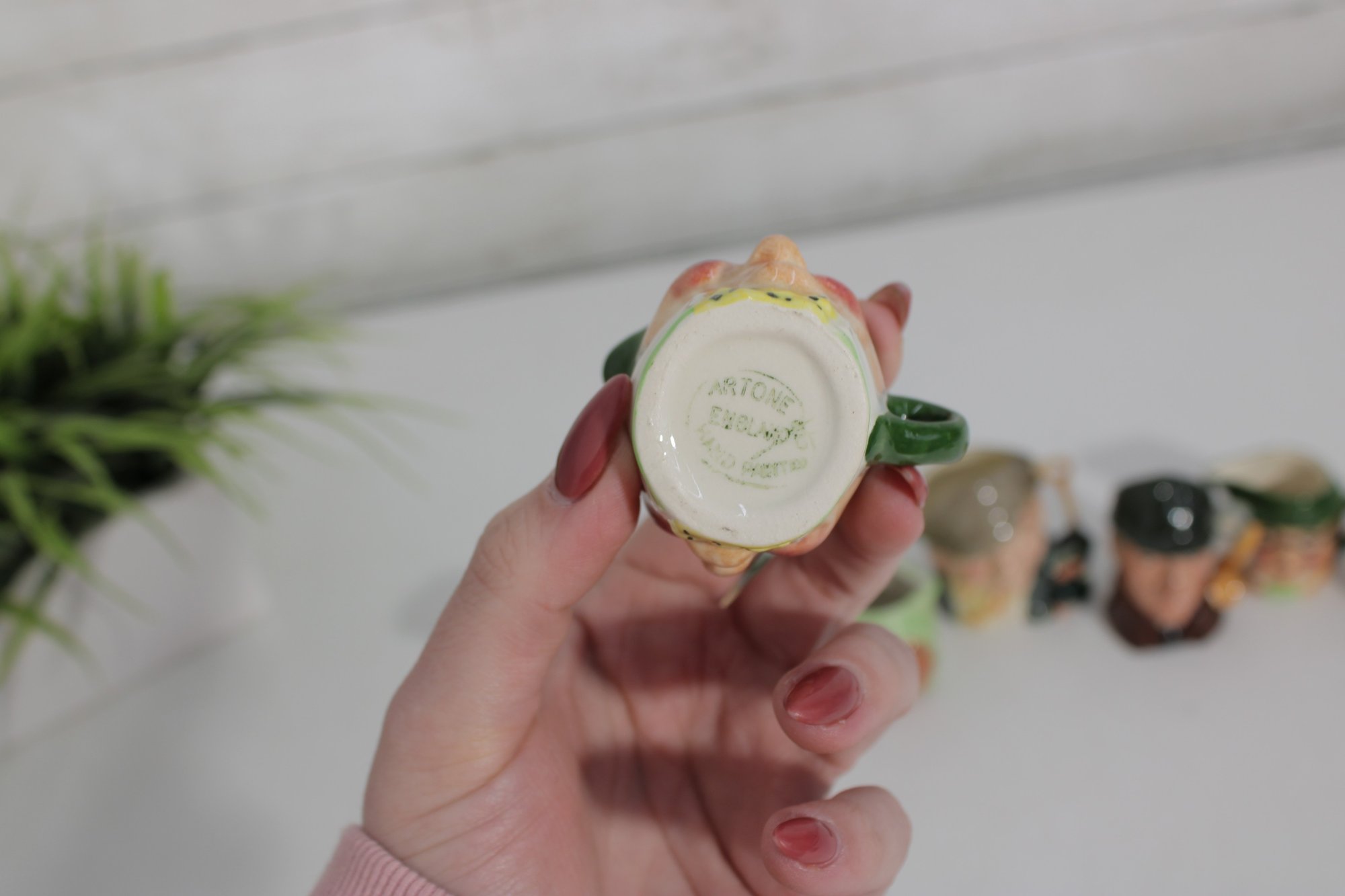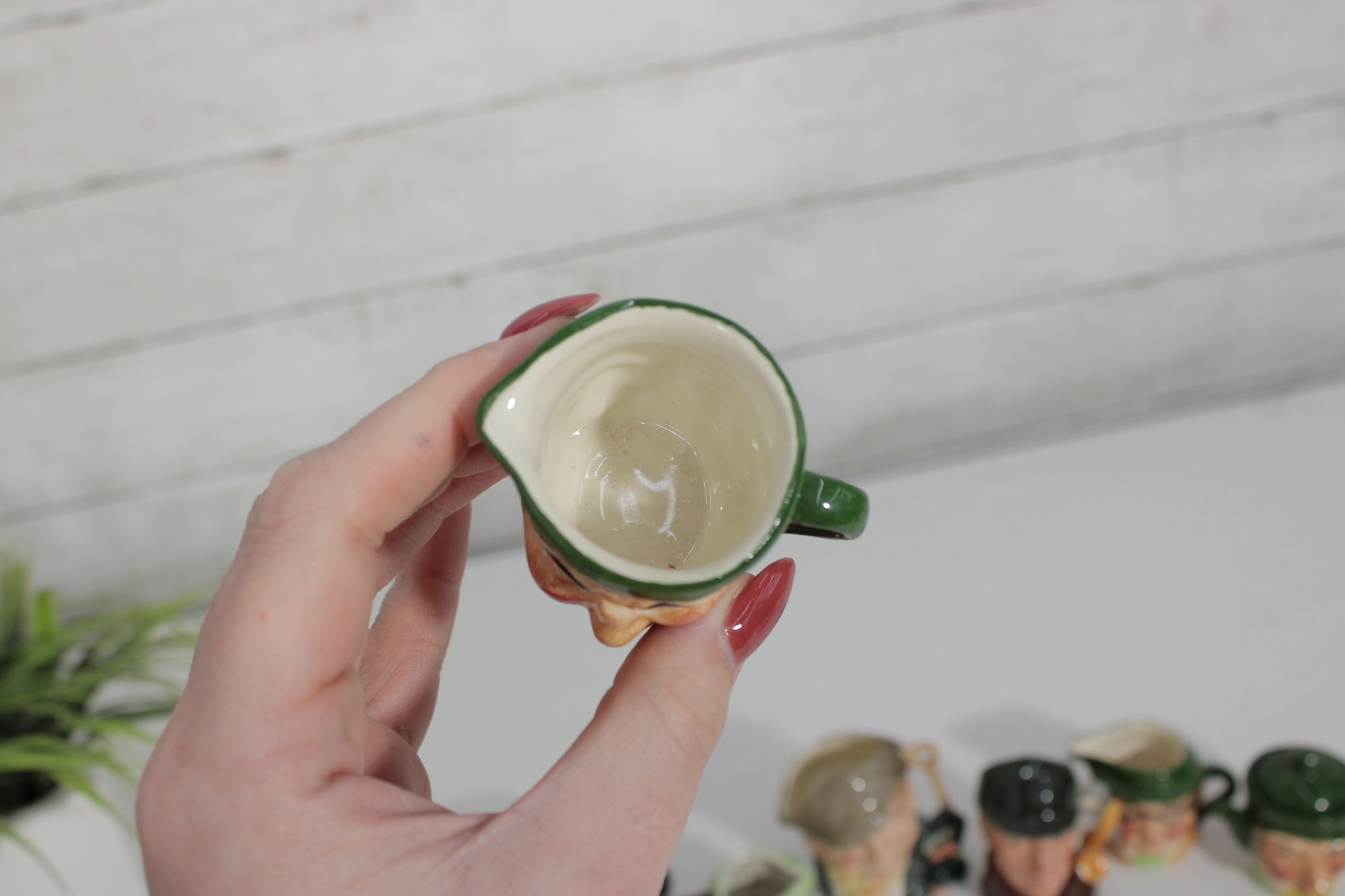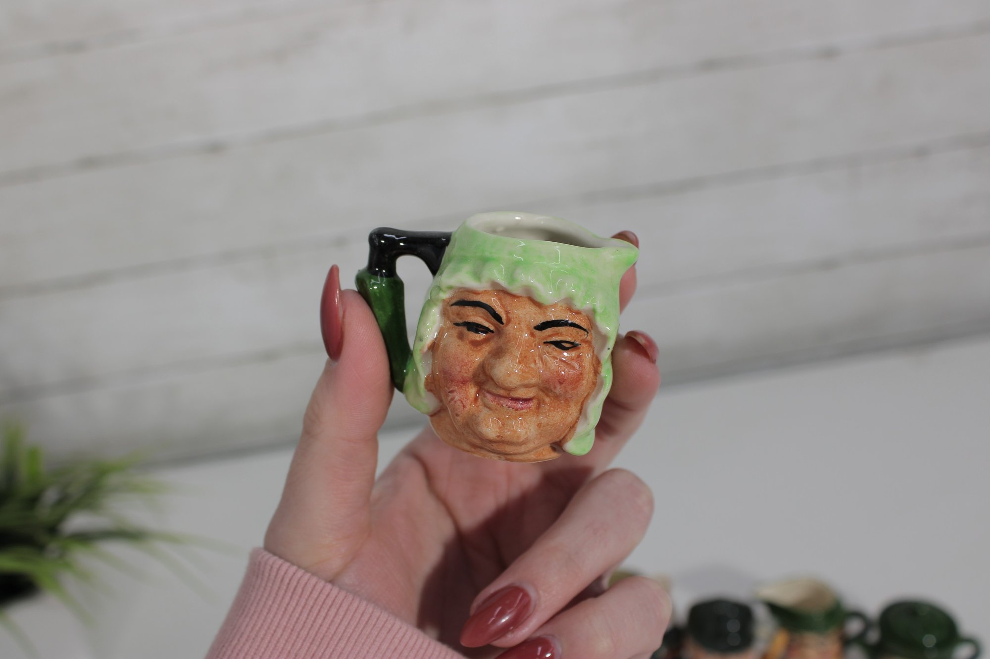 a charming set of nine hand-painted figural face mugs, each featuring a distinct character with expressive detail and personality. These miniature mugs are crafted in the classic Toby-style tradition, with raised facial features, period hats, and carefully applied paintwork that gives every piece its own unique character.