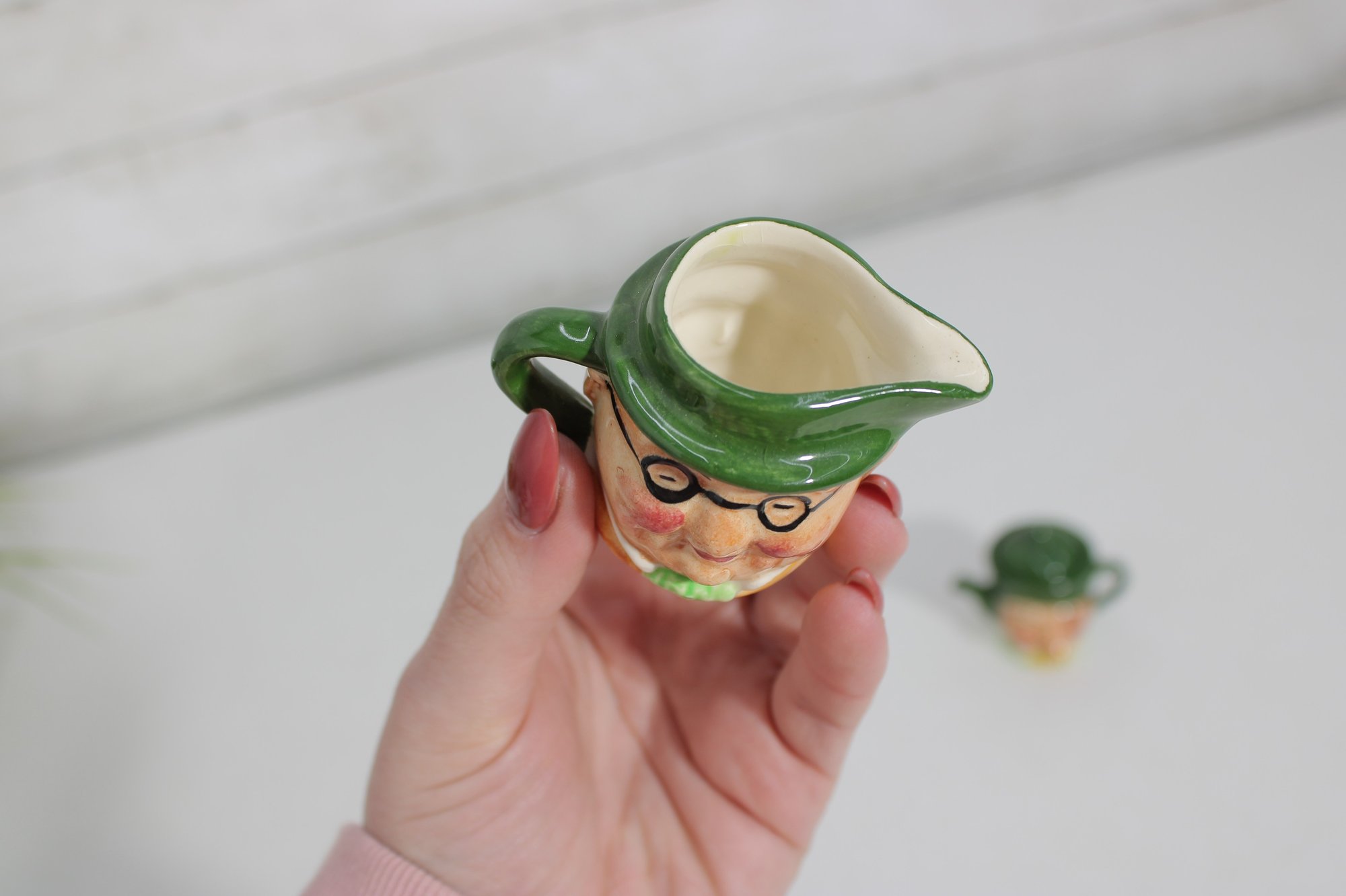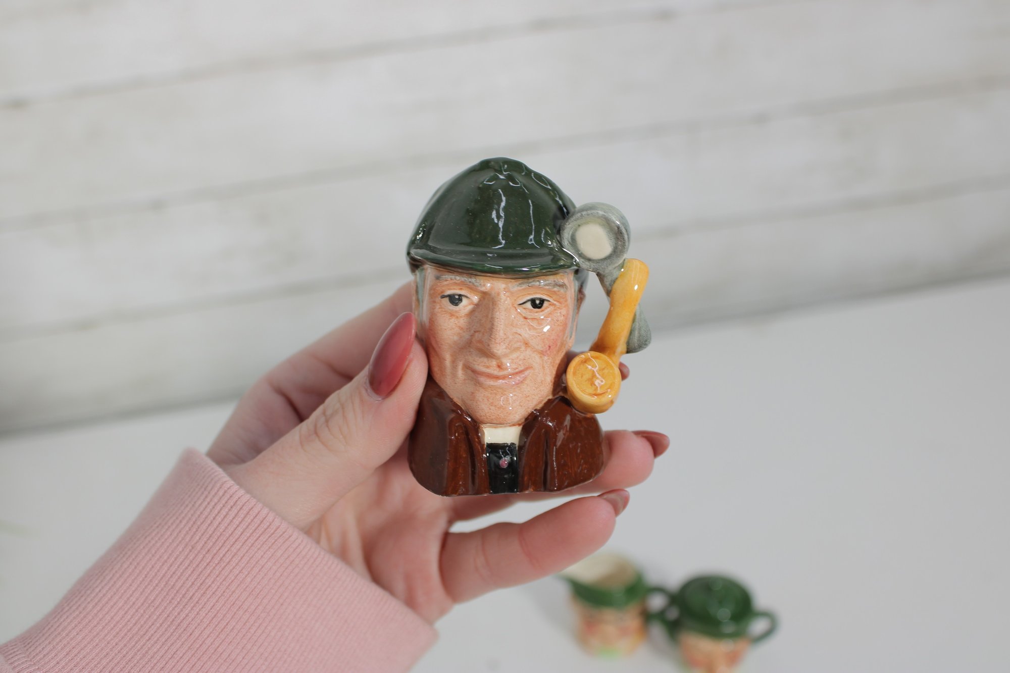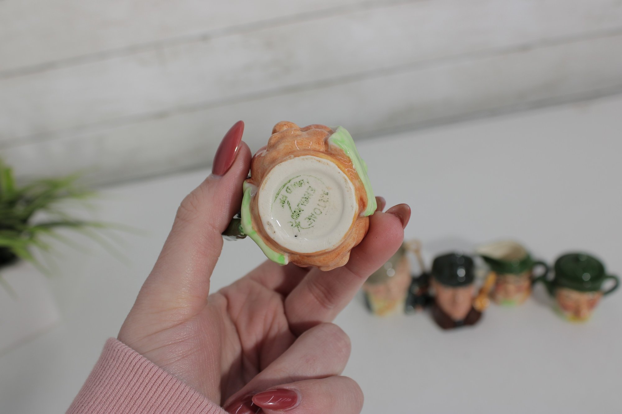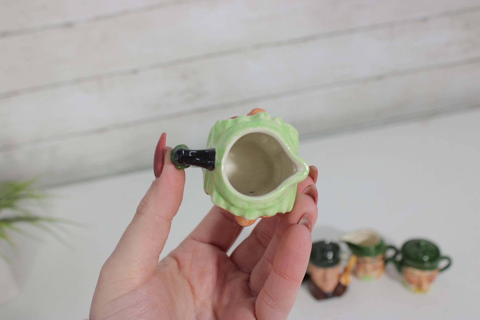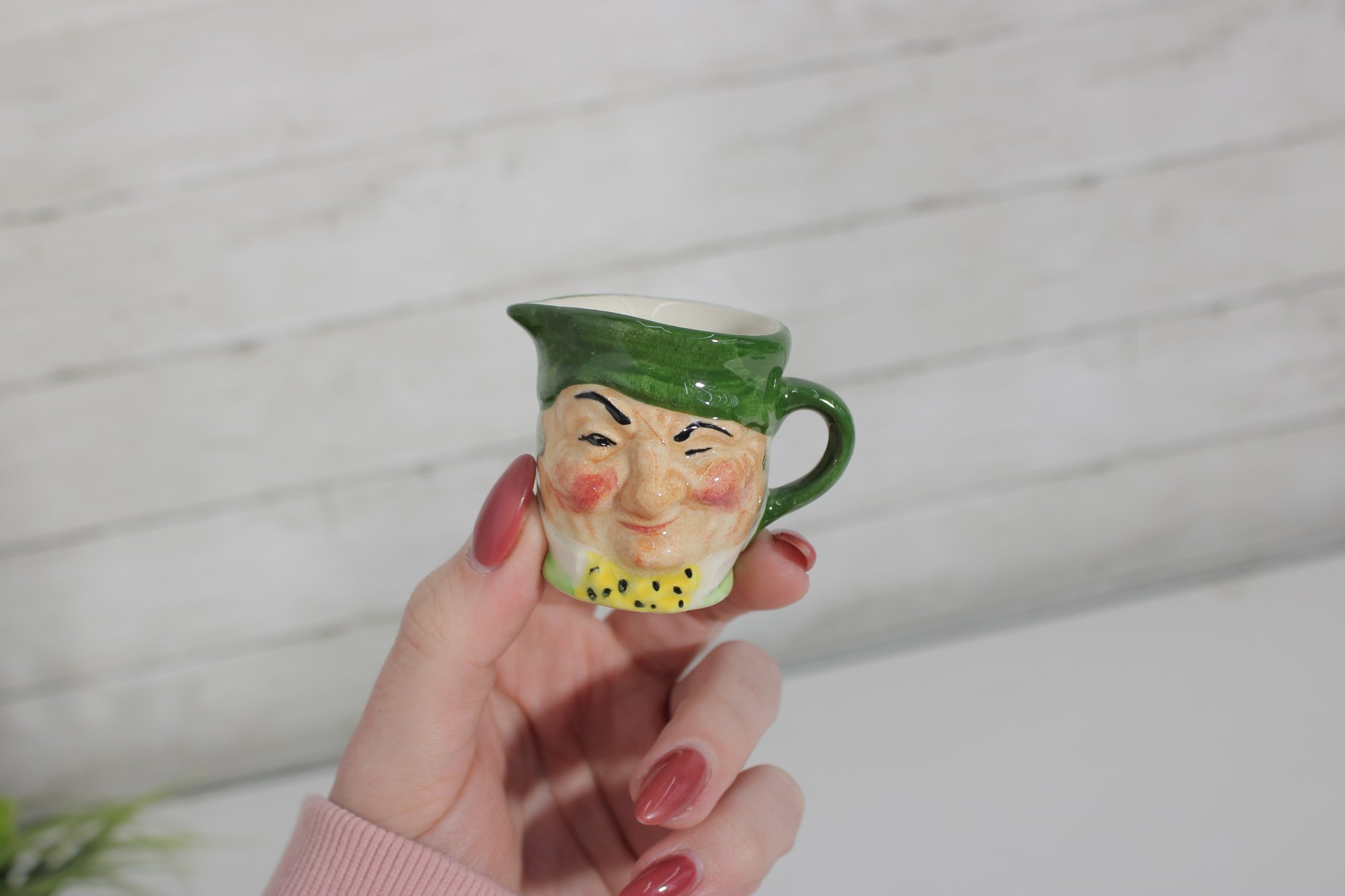 a charming set of nine hand-painted figural face mugs, each featuring a distinct character with expressive detail and personality. These miniature mugs are crafted in the classic Toby-style tradition, with raised facial features, period hats, and carefully applied paintwork that gives every piece its own unique character.