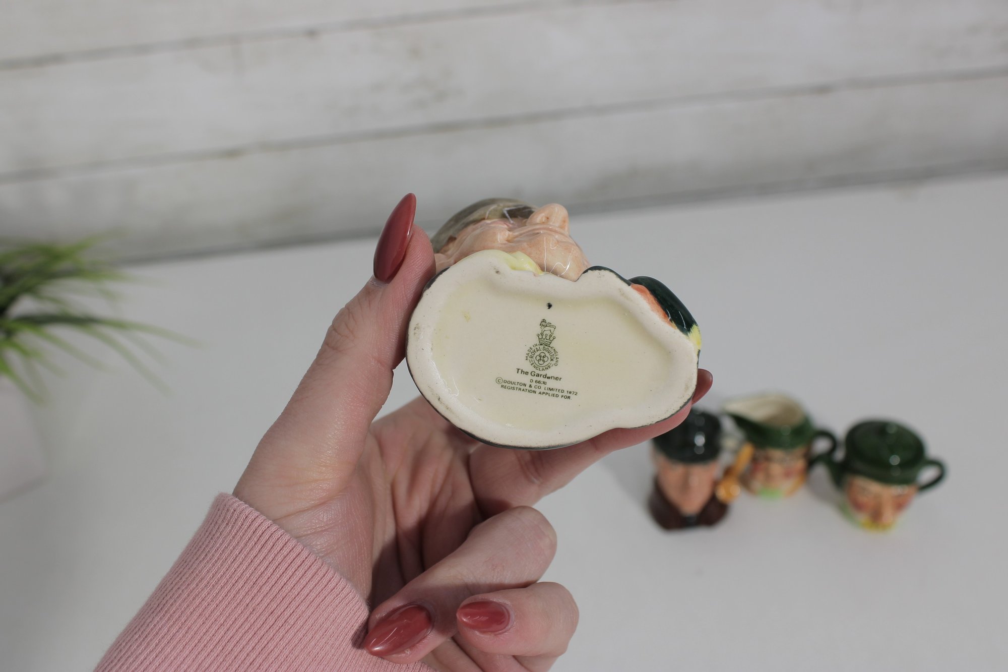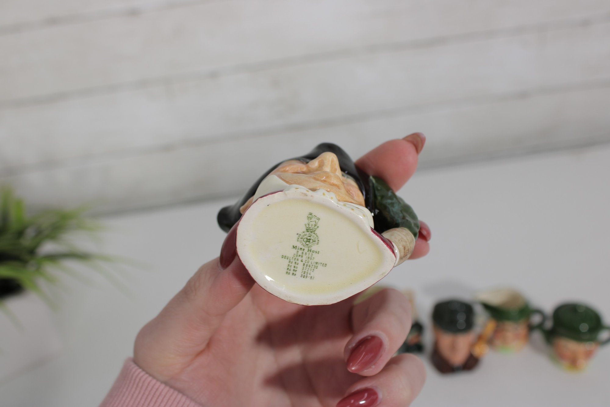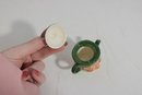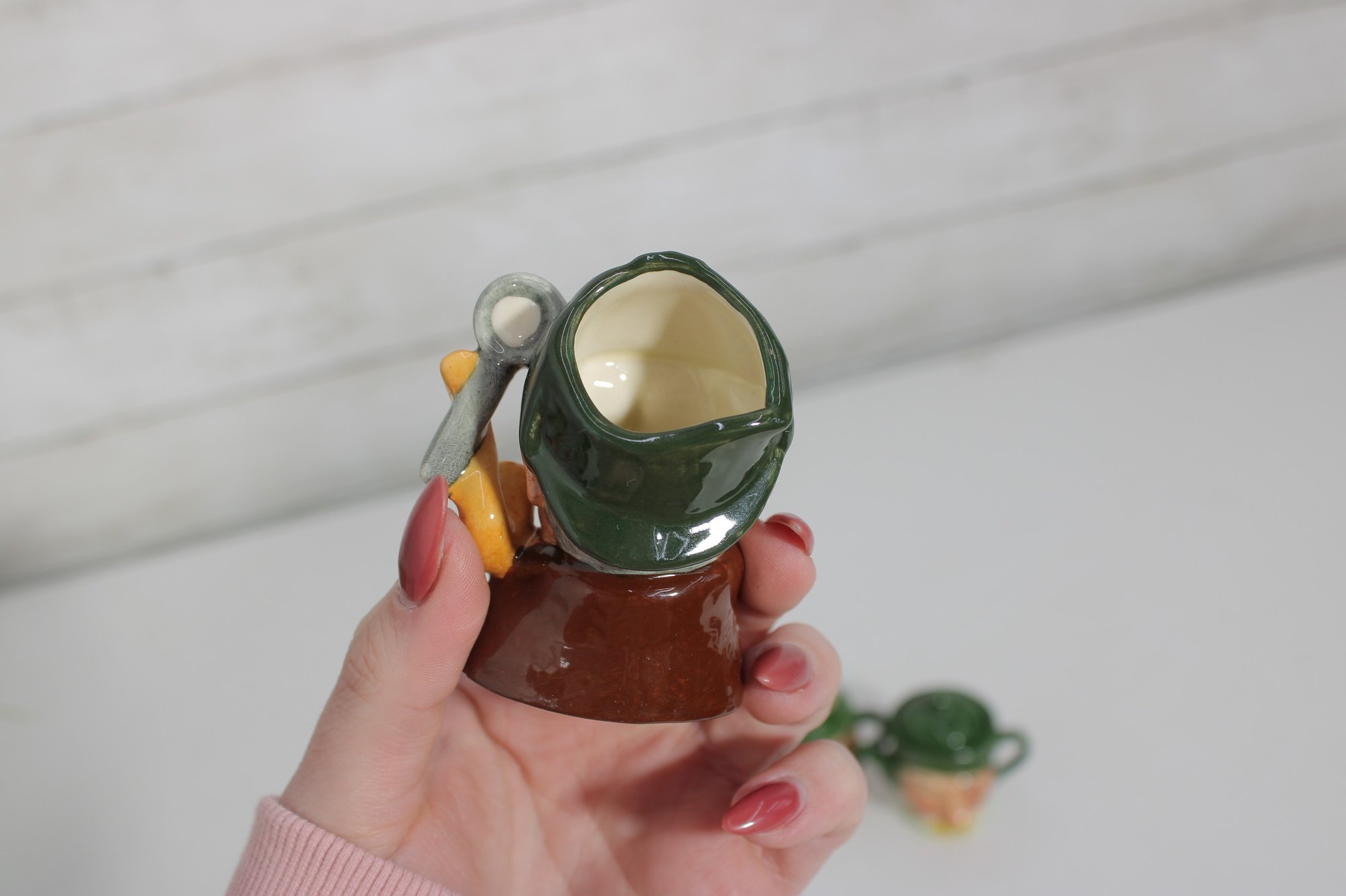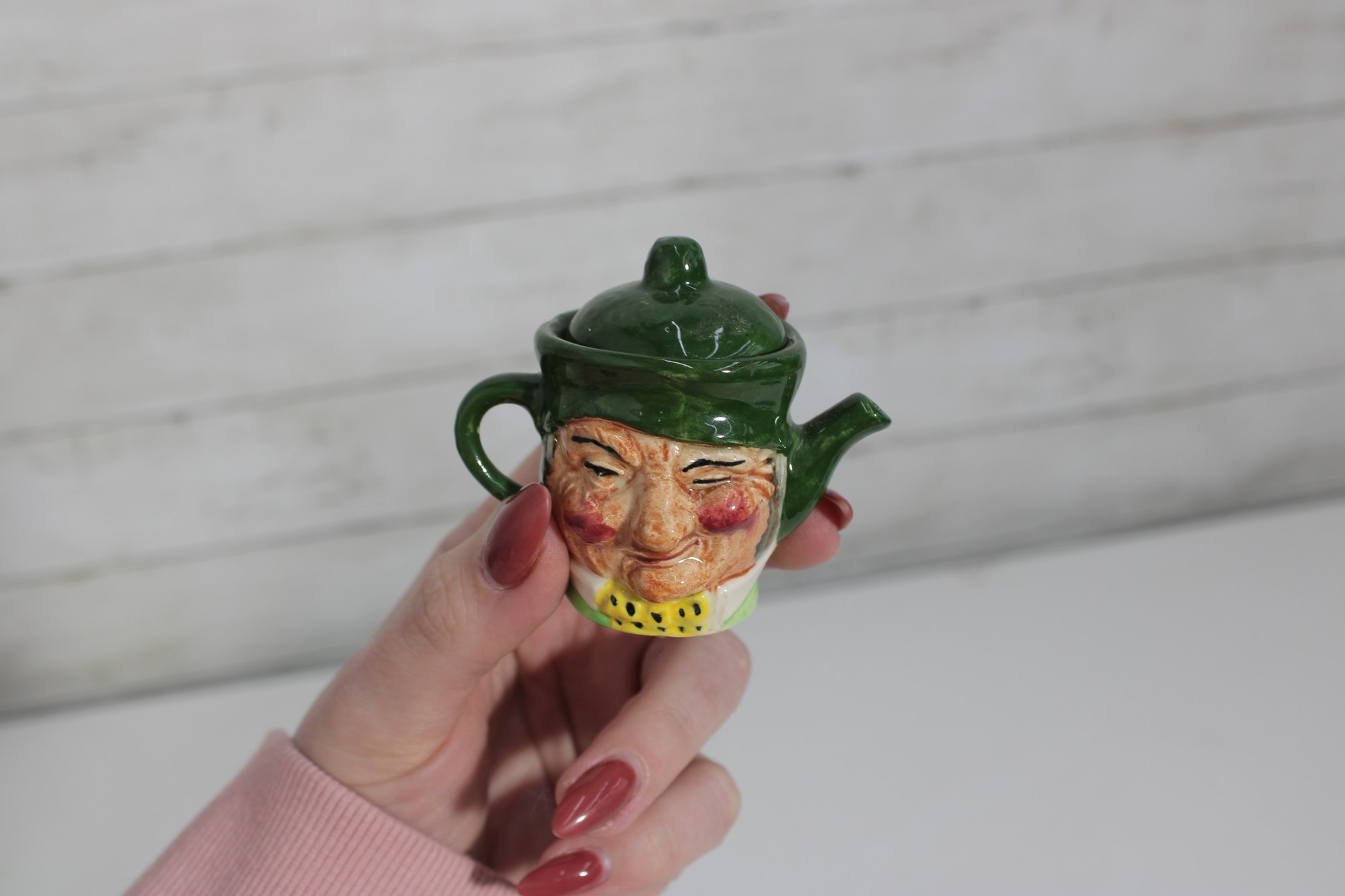 a charming set of nine hand-painted figural face mugs, each featuring a distinct character with expressive detail and personality. These miniature mugs are crafted in the classic Toby-style tradition, with raised facial features, period hats, and carefully applied paintwork that gives every piece its own unique character.