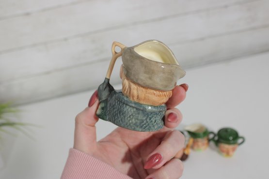 Each mug depicts a different gentleman, ranging from scholarly and whimsical to rugged and rustic. The hand-painted finish highlights fine details such as rosy cheeks, furrowed brows, and textured hats, making this set an eye-catching display for a shelf, bar, or curio cabinet.