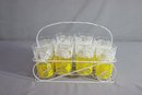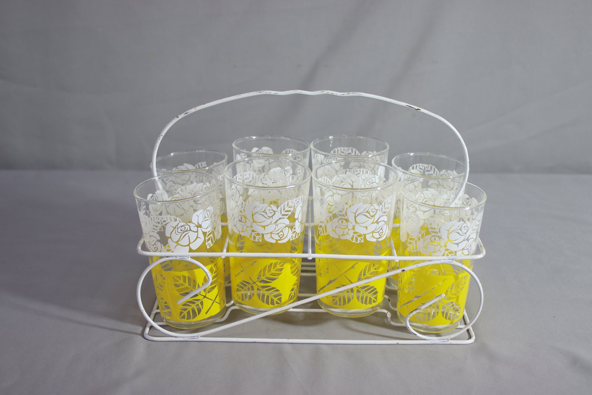 Set Of 8 Mid Century Tumbler Glasses, White Roses And Carrier