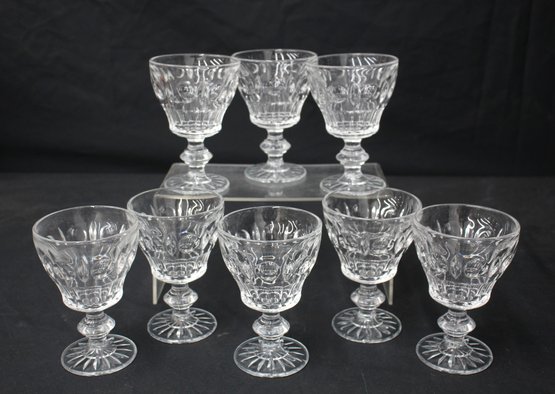 This elegant set of 8 vintage crystal goblets showcases exquisite craftsmanship with finely cut patterns and a sophisticated design. Each goblet features a detailed floral and geometric pattern around the bowl, leading down to a beautifully faceted stem. The base of each goblet has a radiant starburst design, adding a touch of elegance when viewed from below.