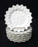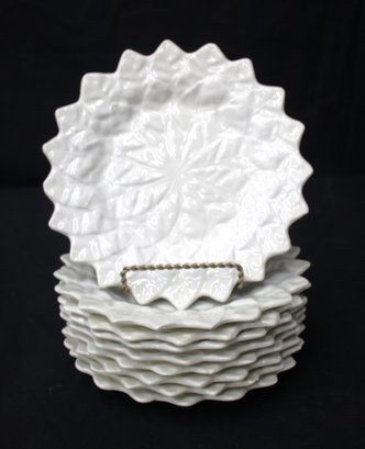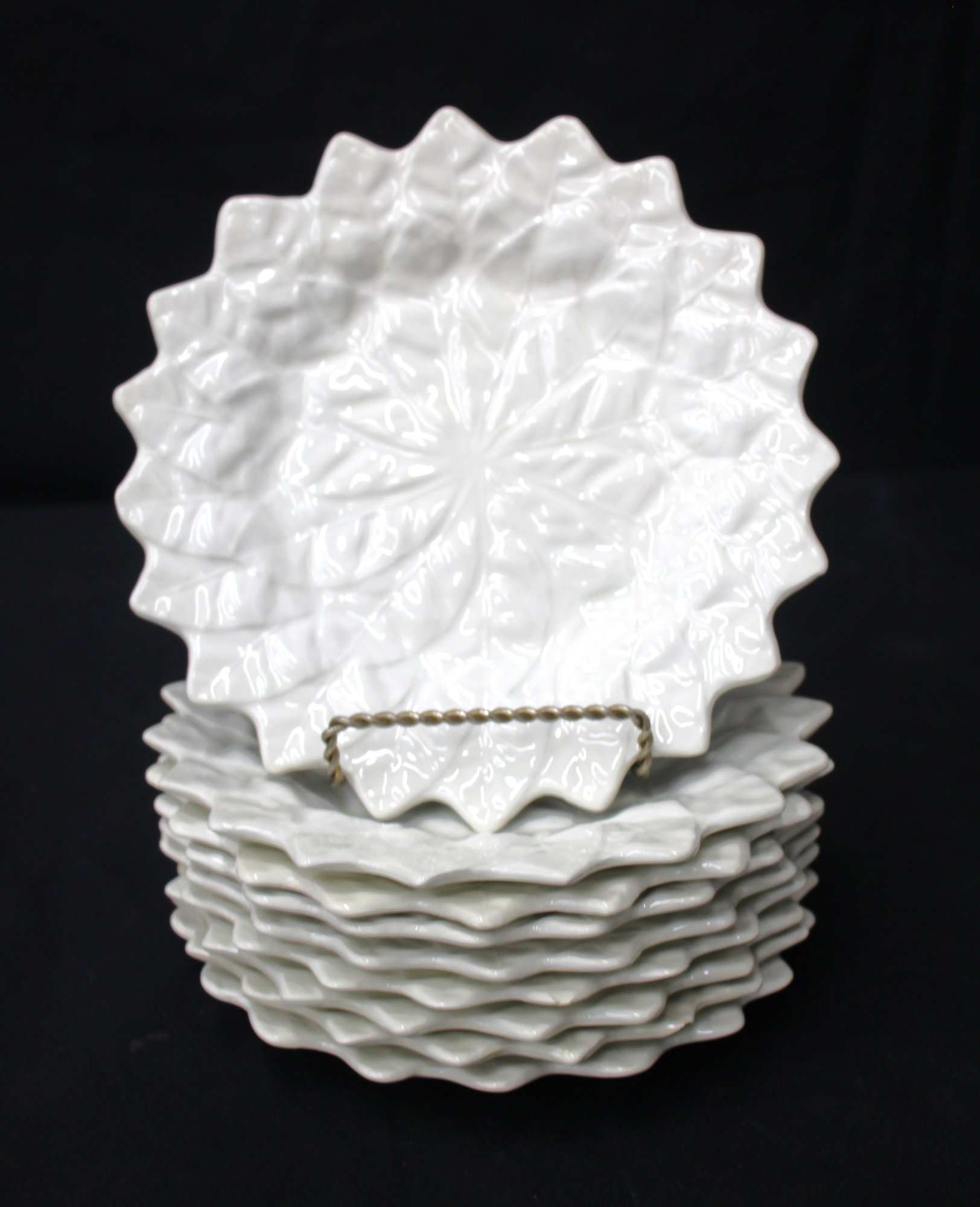 This beautiful set of 9 leaf-shaped plates is crafted by Secla of Portugal. The plates feature an intricate, textured leaf pattern in a glossy white glaze, perfect for adding a touch of nature to your dining table or decor. Each plate measures approximately [add size], and while they are in excellent condition, one plate shows a minor chip on the rim (as shown in the photos). These plates would make a lovely addition to any collection of vintage Portuguese ceramics.