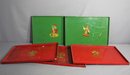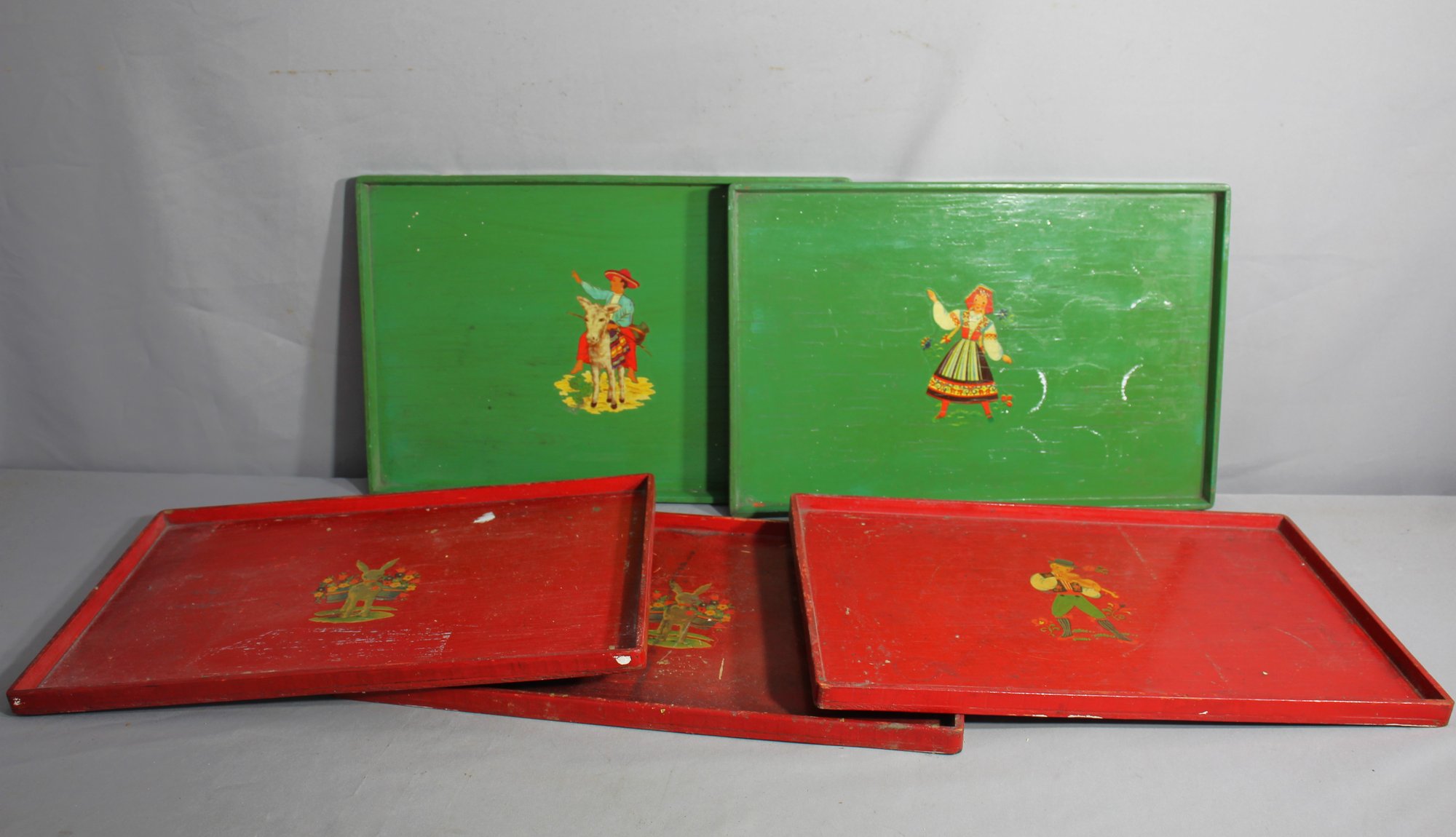 This set includes four trays: two in a vibrant green and two in a bold red, each adorned with traditional folk-style figures engaged in dance and play. The whimsical artwork, featuring figures in period dress, adds a playful touch of nostalgia to any setting.