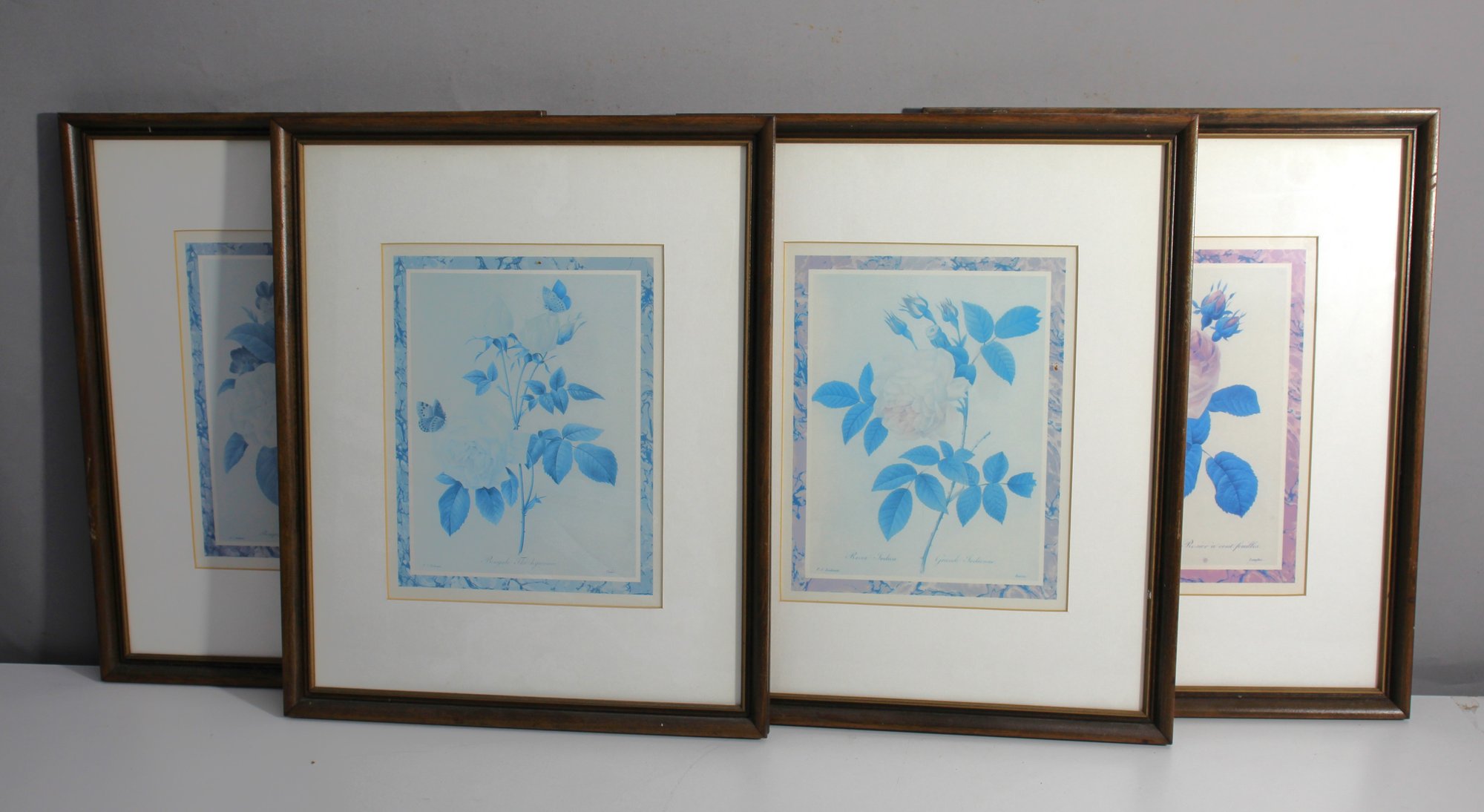 This charming set of four botanical prints features delicate, monochromatic floral illustrations, each in a soothing blue hue with unique pastel borders. Each print showcases a different botanical specimen, rendered with exquisite detail, capturing the subtle beauty and elegance of flowers. The soft colors and intricate framing bring a touch of timeless style, making these prints a perfect addition to a vintage-inspired or nature-themed decor.