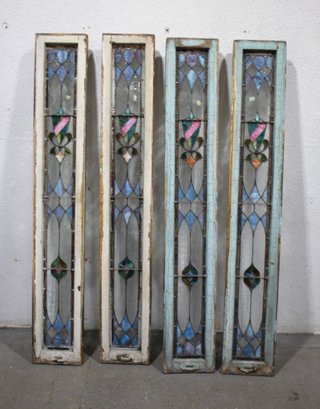 Each panel is a tapestry of vibrant colors and textures, framed in its original weathered wooden frames that tell a story of their age and authenticity.The windows are designed with a harmonious blend of geometric and floral patterns
