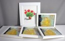 A stunning collection of framed artwork featuring one vibrant watercolor floral piece and four textured abstract prints. The floral artwork showcases bright red geraniums in a terracotta pot, signed and dated by the artist (2020). The abstract pieces display a mix of bold, modern brushstrokes in a vibrant color palette, perfect for adding a pop of artistic flair to your home or office. Each piece is elegantly presented in a white frame, ready to hang or display. A versatile and unique addition for art lovers and collectors alike!