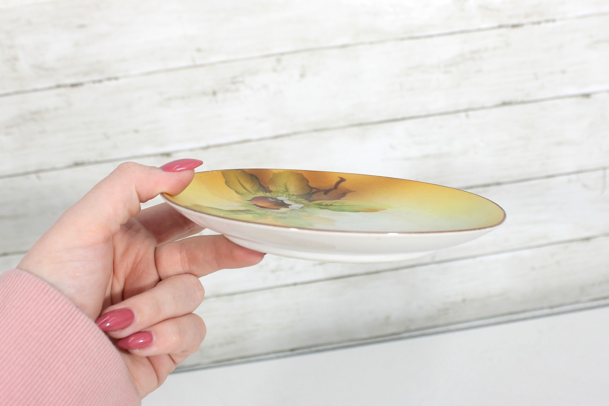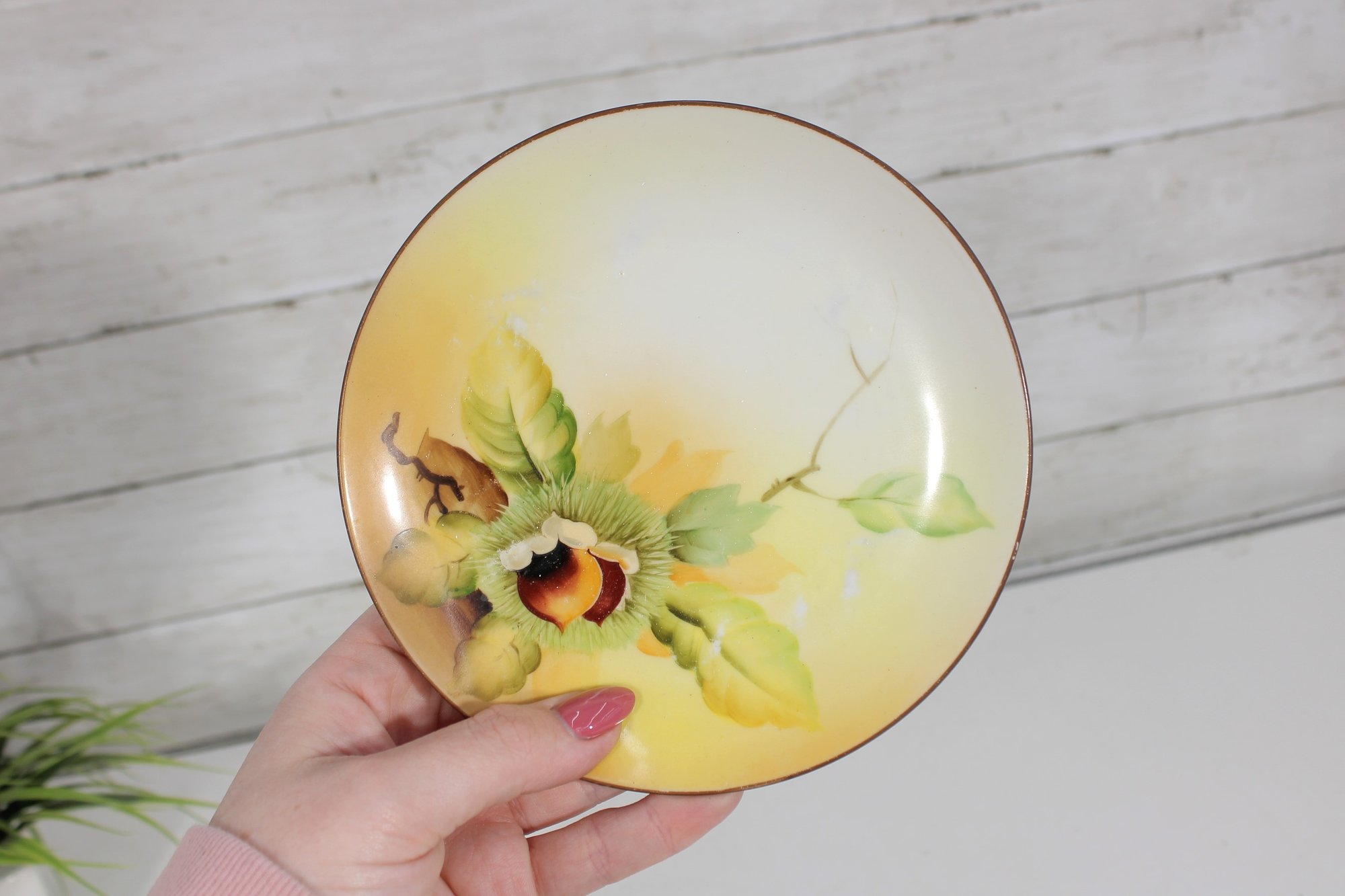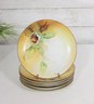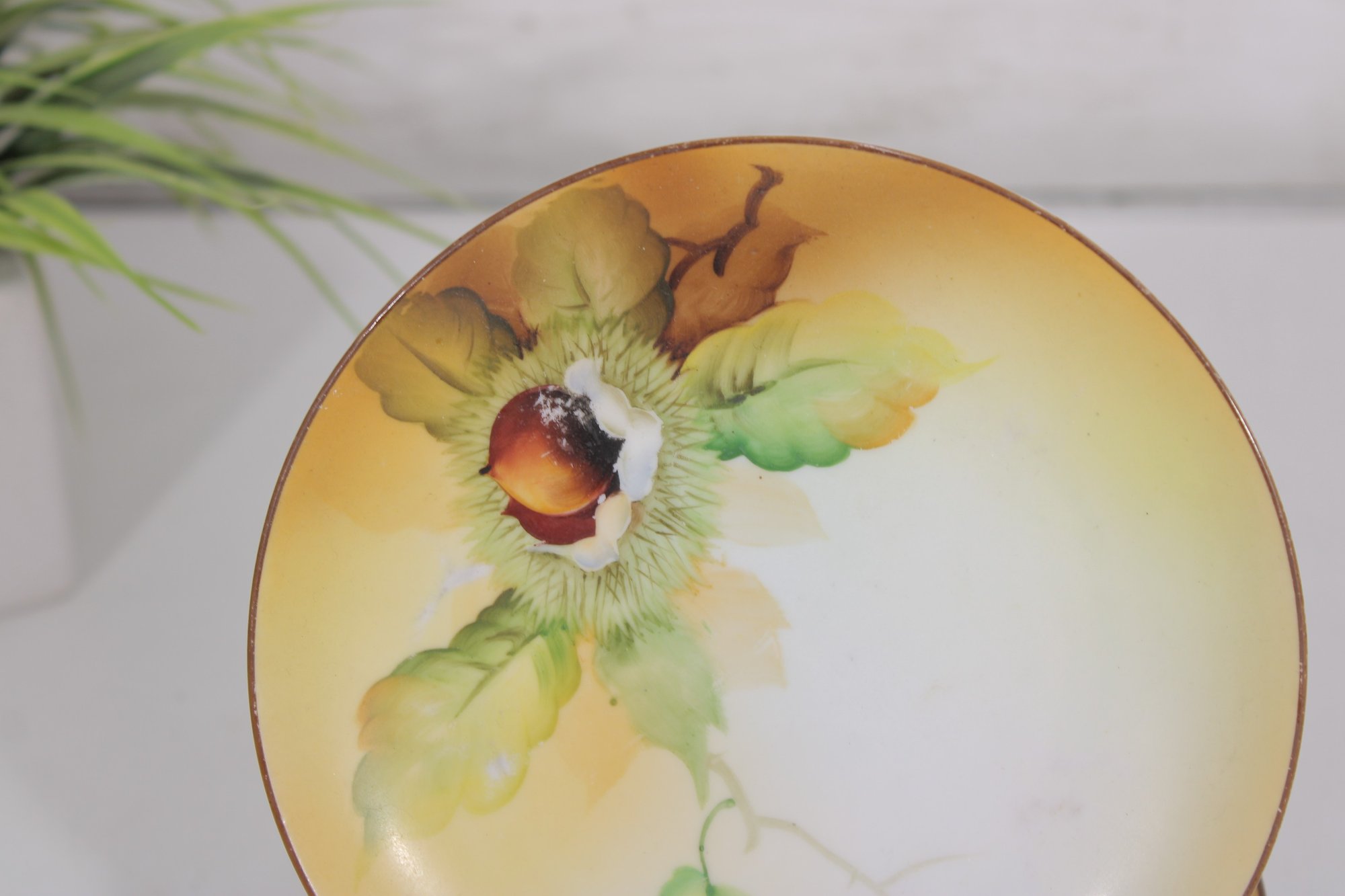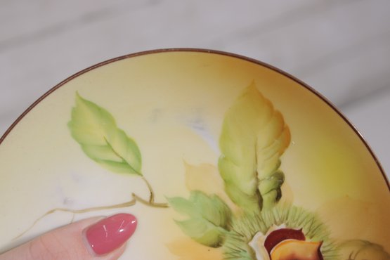 Lovely set of hand-painted Nippon porcelain plates, featuring a delicate floral and chestnut motif in warm, natural tones. Each plate showcases soft shading with green leaves and a richly detailed central design, framed by a subtle golden-yellow wash and fine gold rim.
