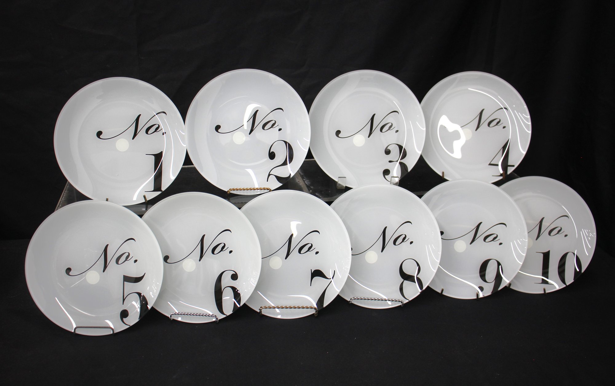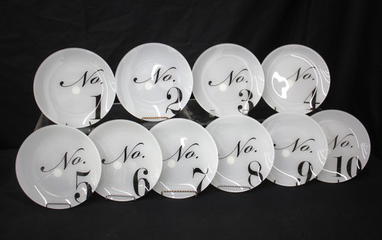 This unique set of ten decorative plates from Shiraleah blends modern style with a touch of whimsy, each plate boldly numbered from 1 to 10. Crafted with a sleek, minimalist design, these plates feature a crisp white background contrasted by elegant black numerals and decorative flourishes, making them an eye-catching addition to any dinnerware collection.