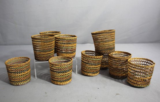 Add a touch of rustic charm to your home or event with this delightful set of ten vintage rattan glass holders. Each holder is intricately woven, featuring a vibrant blend of natural and dyed rattan, creating a stunning visual appeal that complements any decor style.