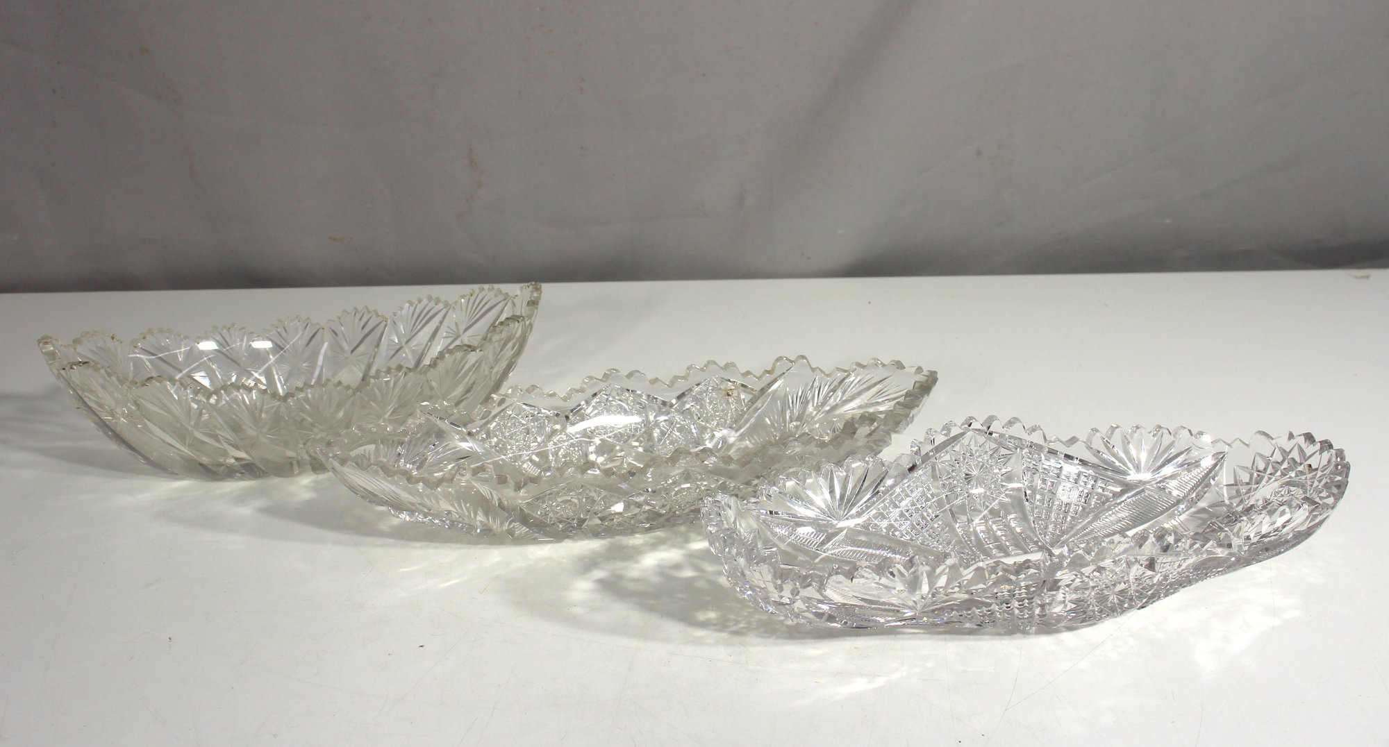 set of three antique cut glass serving bowls, each featuring intricate geometric and starburst patterns that brilliantly reflect light. These elegant dishes are perfect for serving relishes, fruits, or as decorative centerpieces in a fine glass collection.