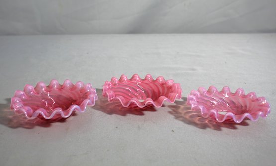a stunning set of three cranberry pink glass bobeche, each boasting a unique ruffled edge design that captures and refracts light beautifully. These delicate pieces measure approximately 4 inches in diameter and are perfect for enhancing the elegance of any candlestick or chandelier. The vibrant pink color adds a touch of warmth and sophistication, making them ideal for adding a decorative accent to any setting.