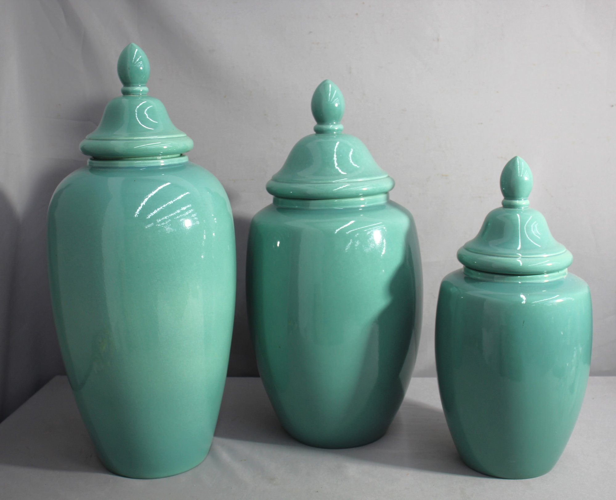 Presenting a charming set of three G. Vaz green ceramic ginger jars, each featuring a sleek and glossy finish that adds a vibrant splash of color to any room. These jars vary in size and are adorned with beautifully detailed lids, making them perfect as standalone pieces or as part of a unified display. Noteworthy for collectors, these jars have undergone some repairs,