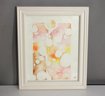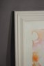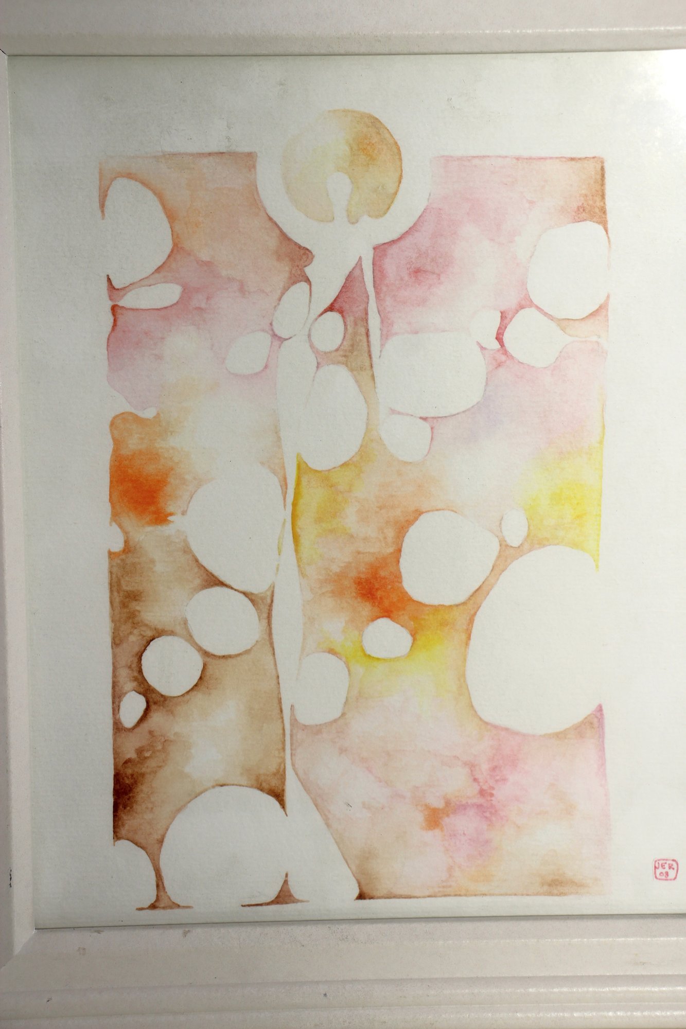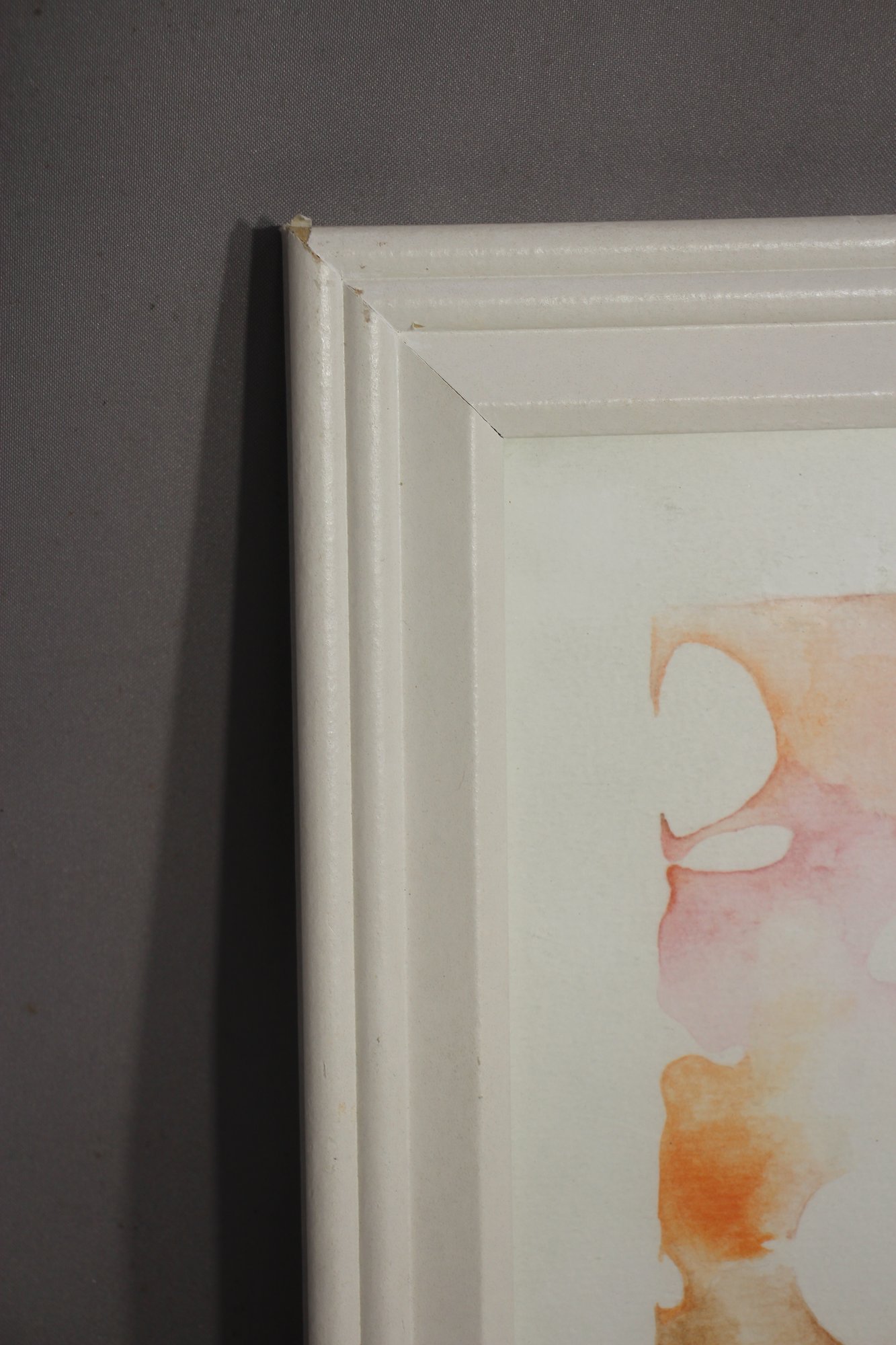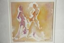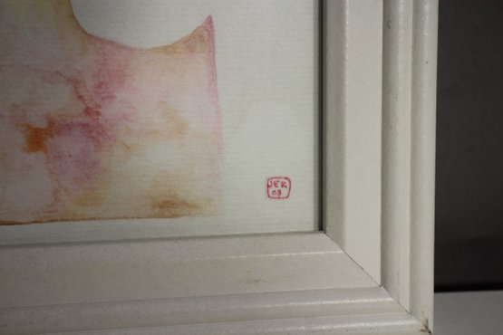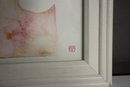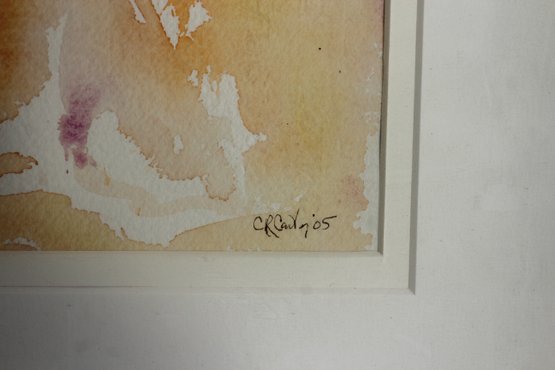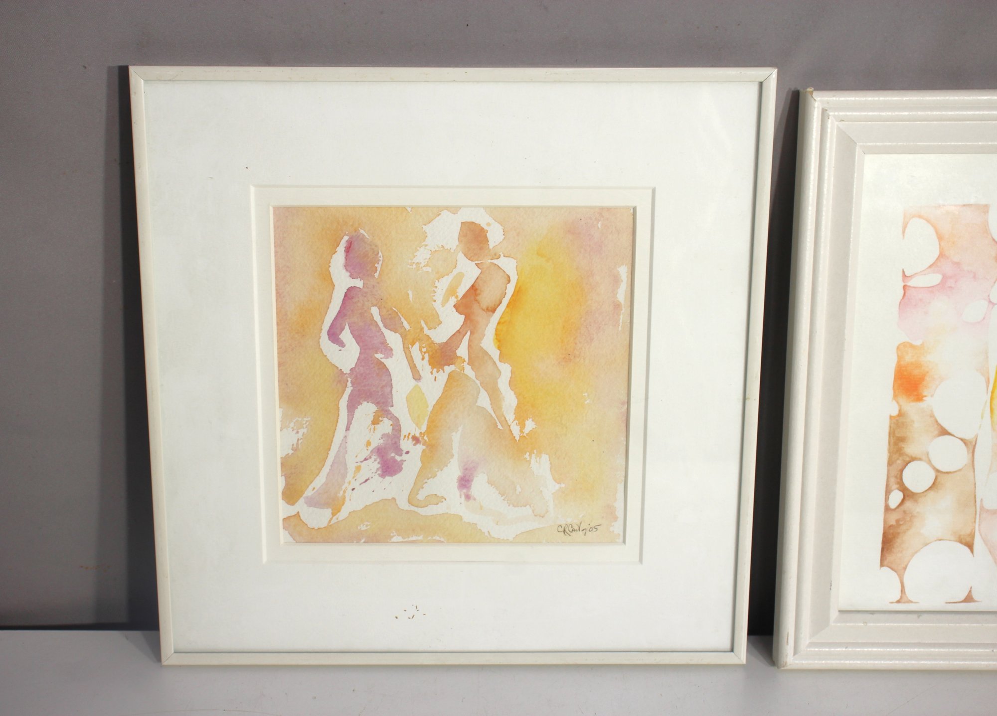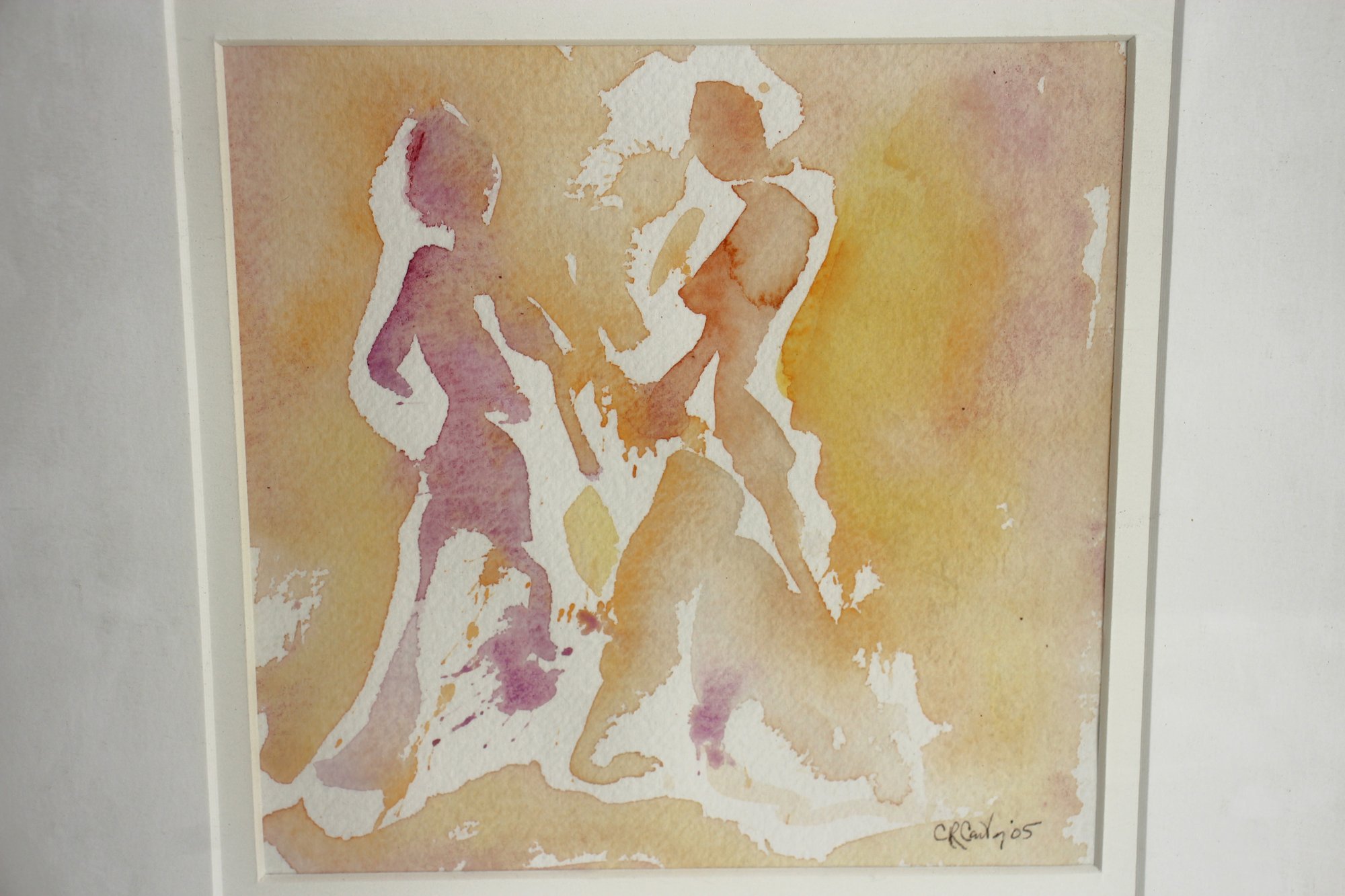 set of two framed abstract watercolor paintings features soft, flowing forms in warm pastel tones of peach, yellow, and pink. The first artwork (12" x 12") showcases two fluid, ethereal figures in motion, blending seamlessly into the warm-toned background. Signed "C. Raligos 05," this piece conveys a sense of movement and harmony. The second piece (12" x 10") presents an abstract arrangement of organic circular forms, evoking a sense of balance and tranquility, marked with a red artist's stamp. Both artworks are framed in white wooden frames that enhance their delicate, dreamlike quality. A perfect pair for collectors of contemporary abstract or minimalist art.