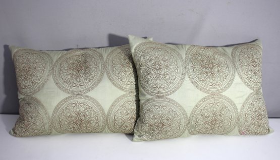 A pair of 14" x 20" decorative pillows featuring an intricate medallion embroidery pattern in neutral tones, perfect for adding a touch of sophistication to any room. These rectangular pillows have a soft sheen finish and a zippered closure for easy maintenance. Ideal for use on sofas, beds, or accent chairs to enhance your home décor.