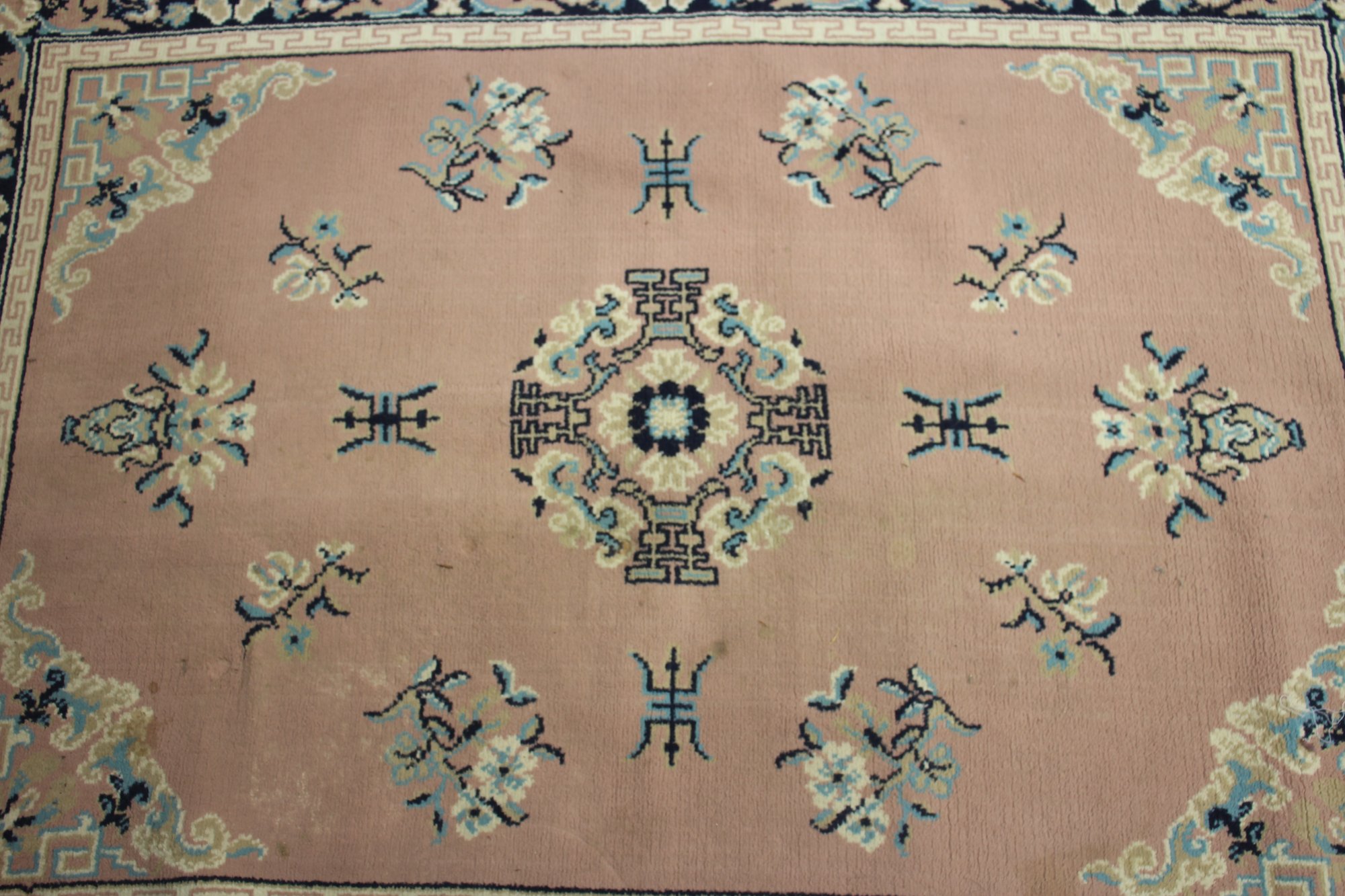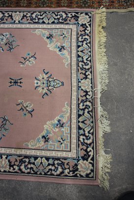 The Vintage Chinese Wool Rug has a striking pink field with a central medallion surrounded by floral motifs and intricate corner designs.
