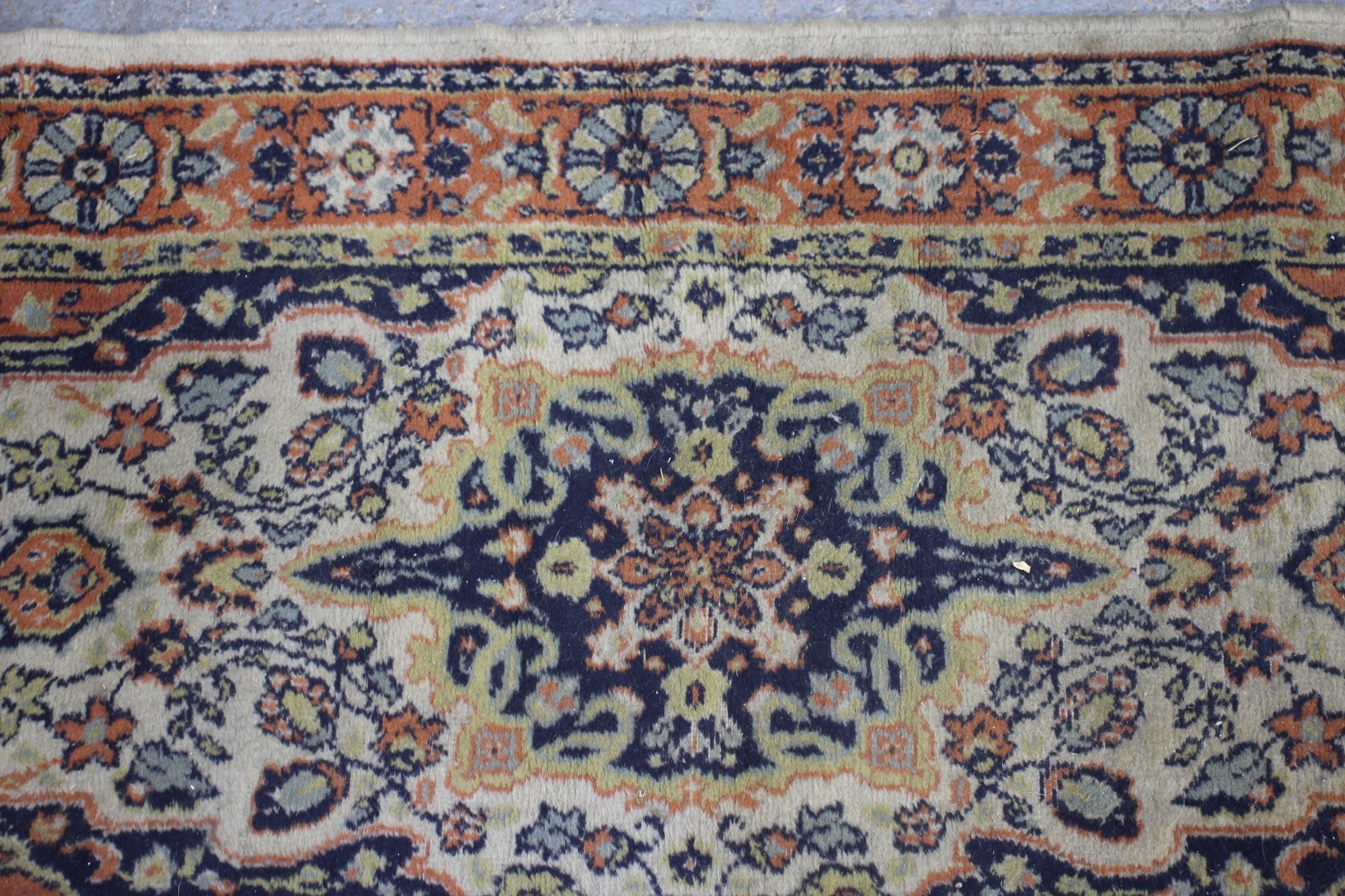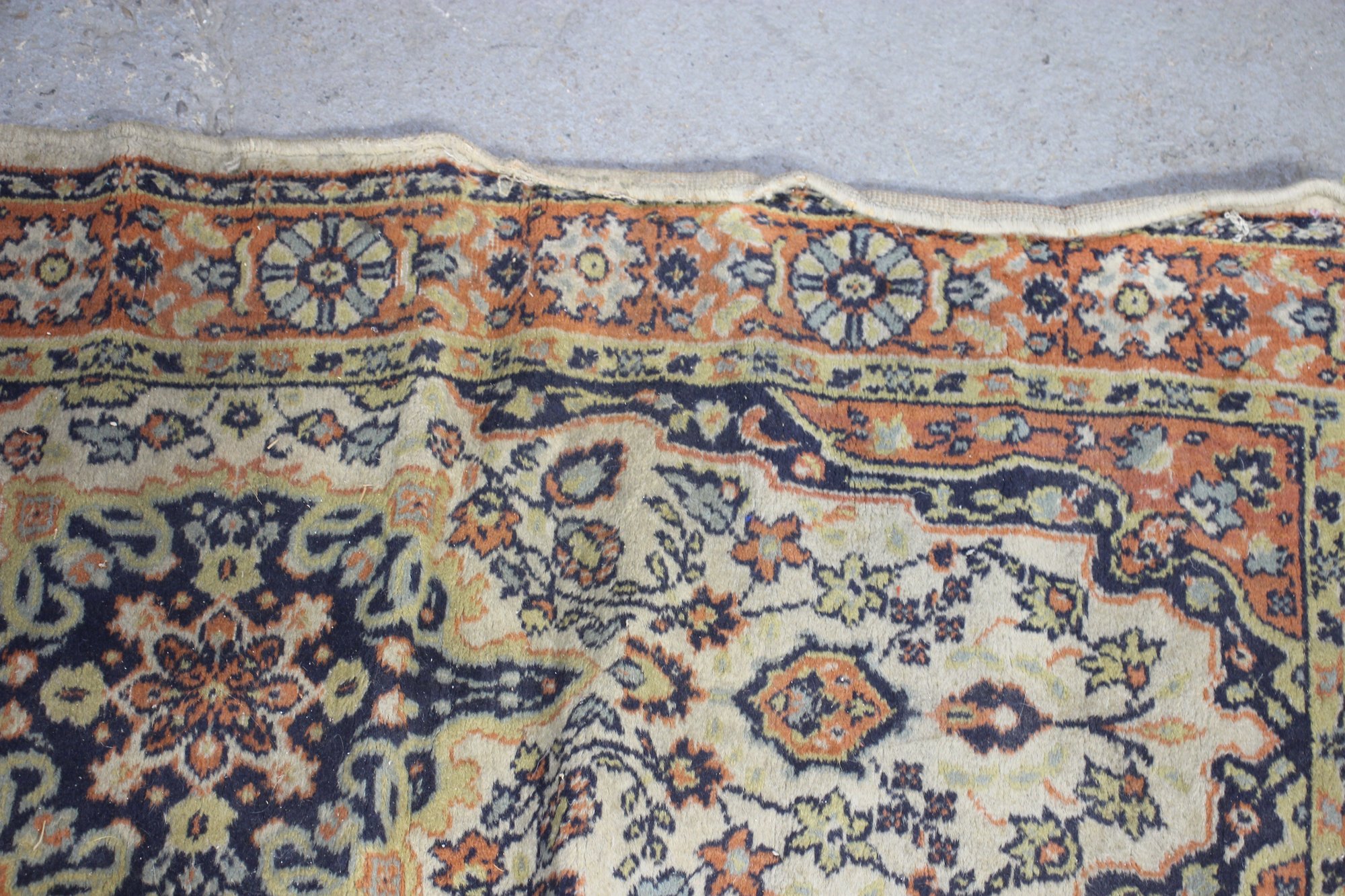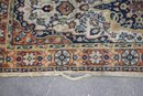 It's bordered by a deep blue and cream floral frame, with delicate fringed edges that add a refined touch.
