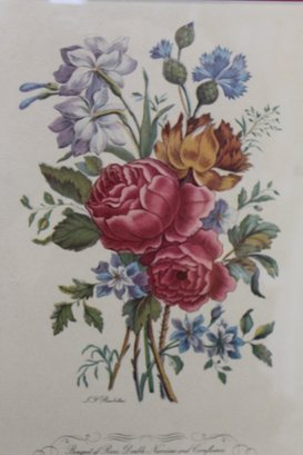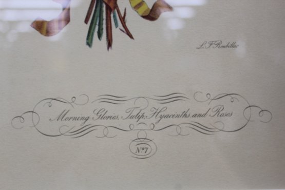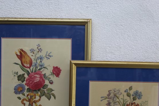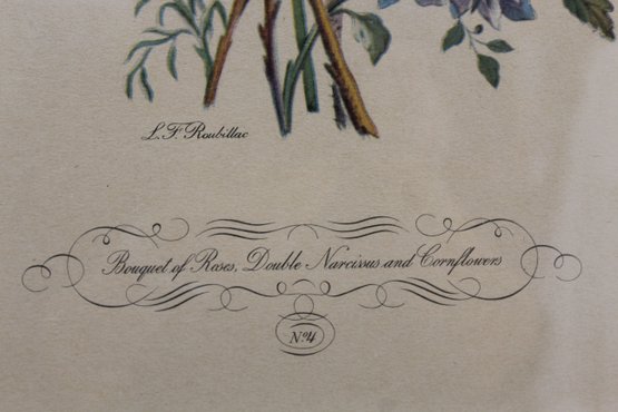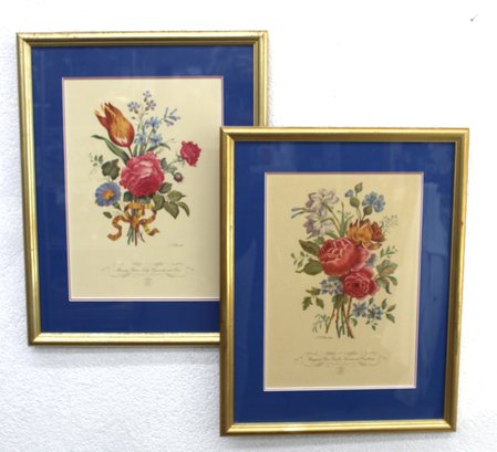 This auction features a stunning pair of vintage floral prints by renowned artist L.F. Rouillac, titled "Morning Glories, Tulip, Hyacinths and Roses" (No. 7) and "Bouquet of Roses, Double Narcissus and Cornflowers" (No. 4). These prints are beautifully framed with elegant gold-tone frames and blue matting, accentuating the vibrant floral arrangements depicted.