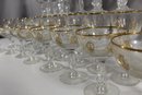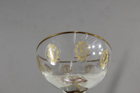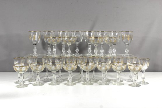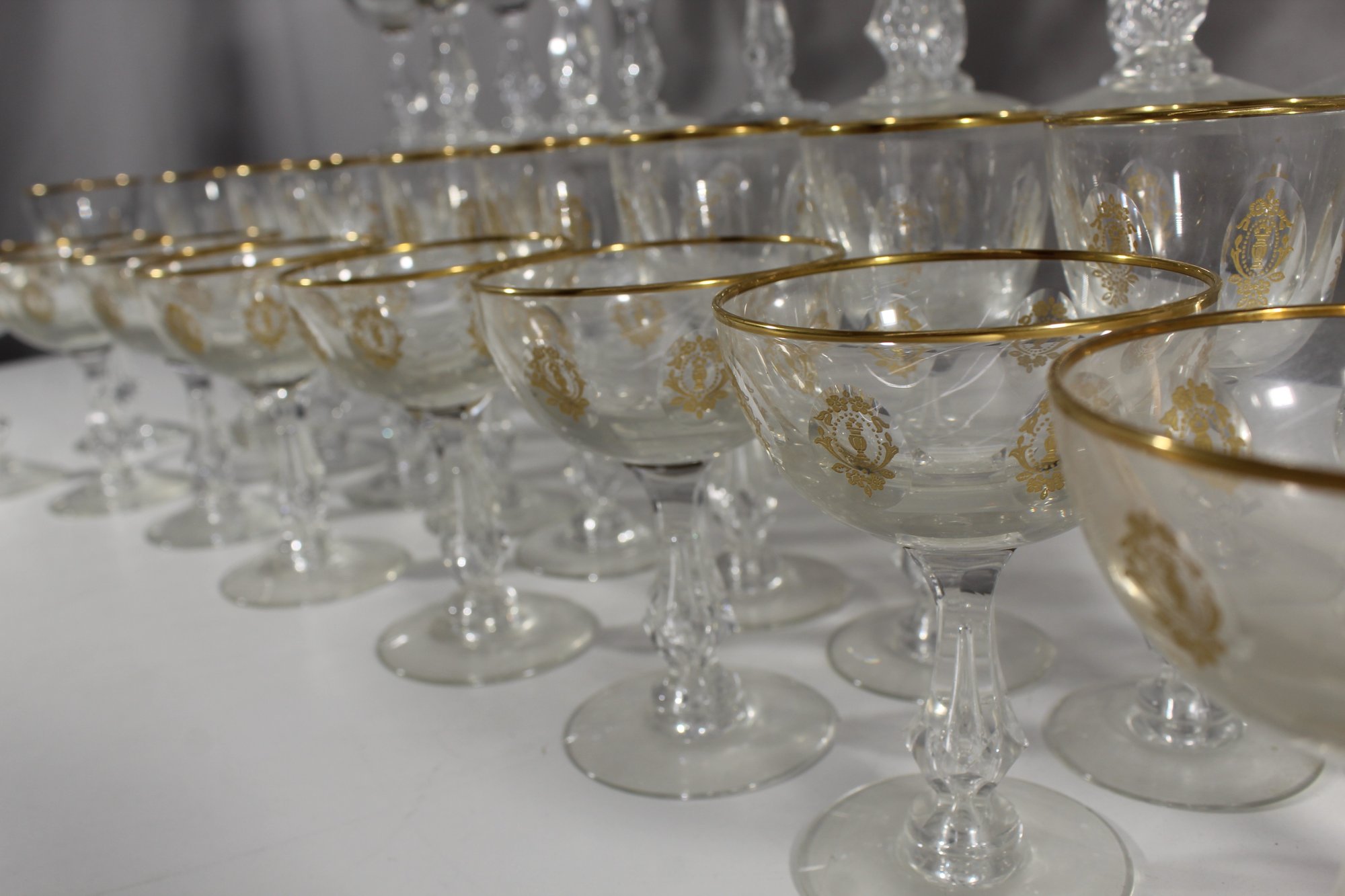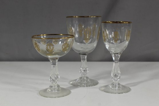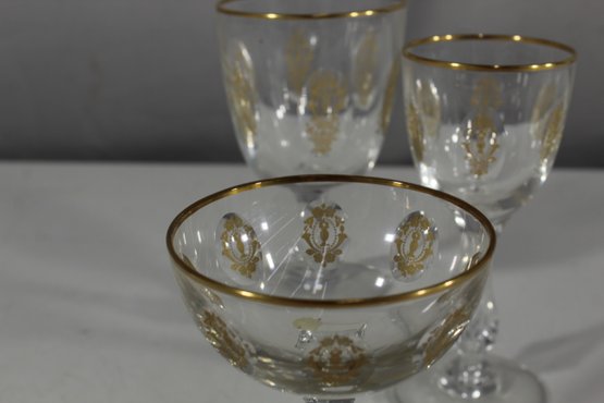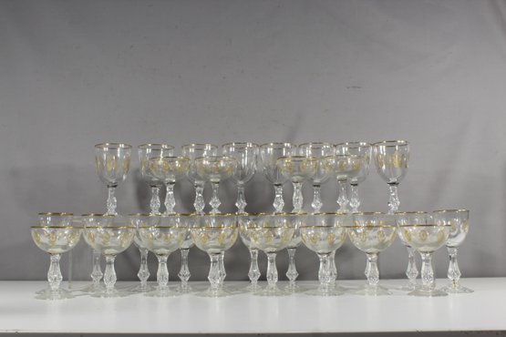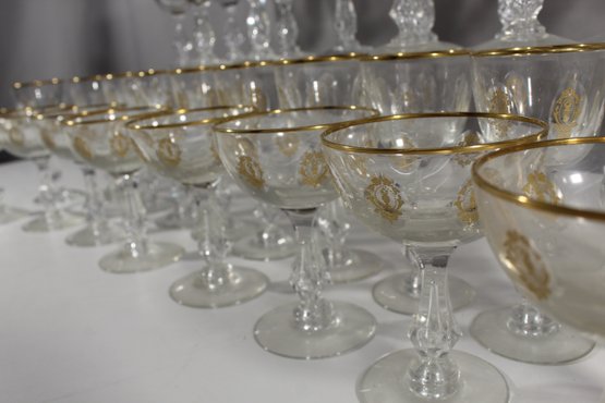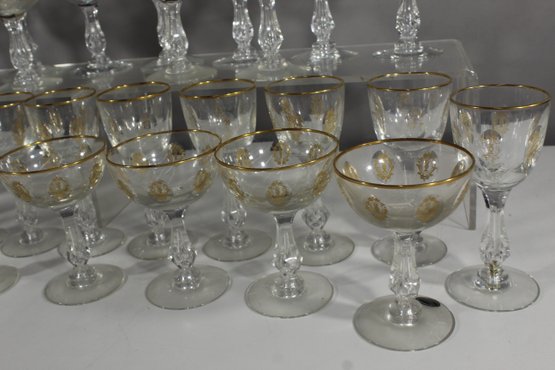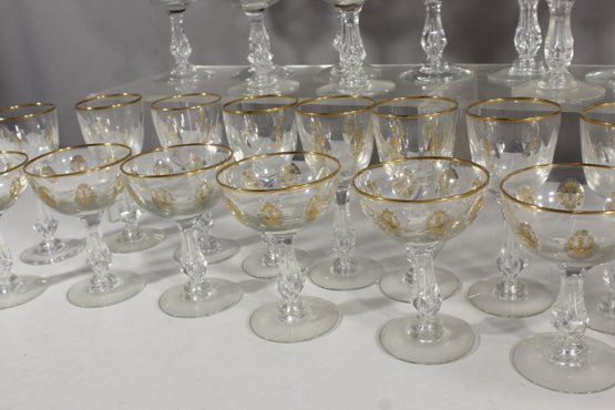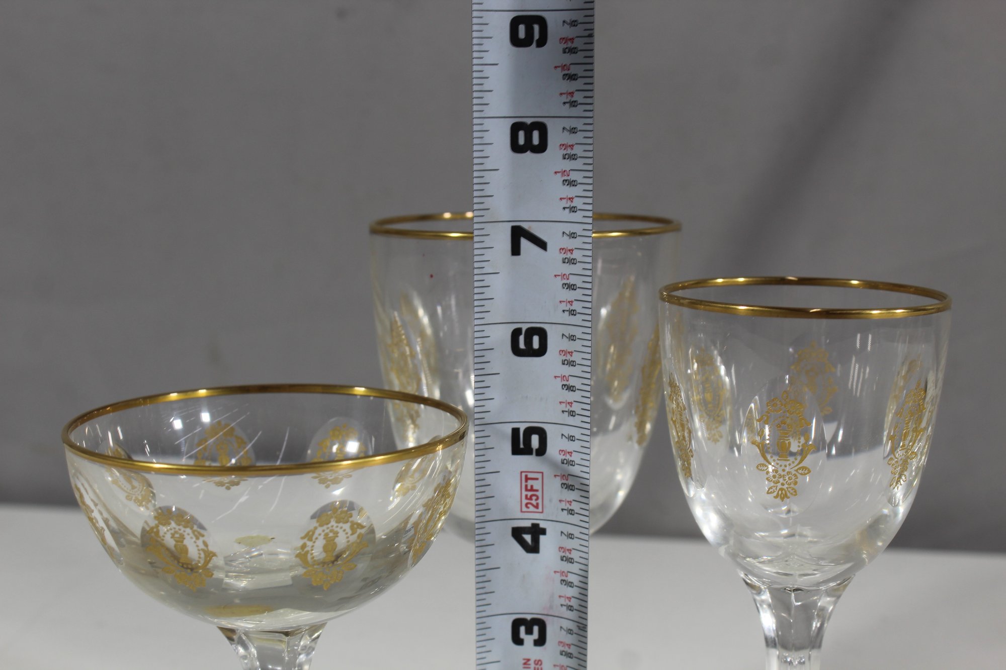 stunning 24-piece vintage crystal stemware set combines classic elegance with intricate detailing. Each glass is adorned with a gold rim and decorative gold medallions, adding a touch of sophistication to any occasion. The set includes a variety of stemware styles, making it versatile for serving wine, champagne, or cocktails.