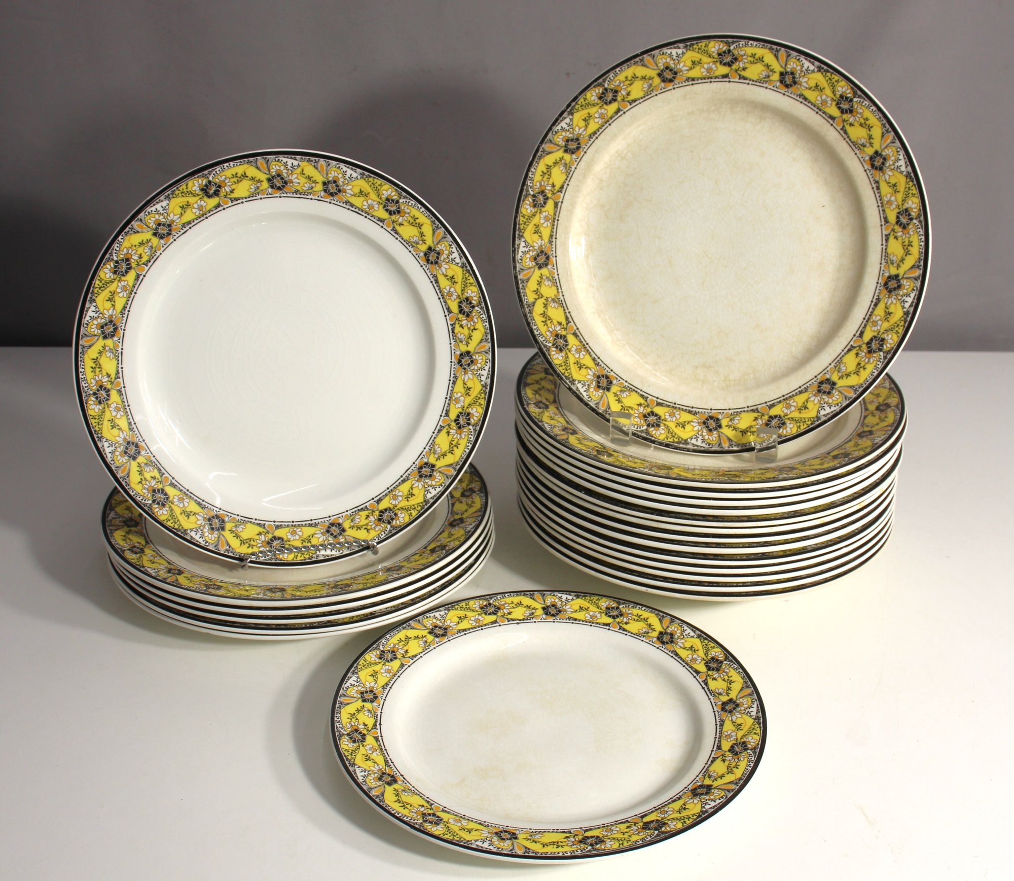 vintage Wedgwood dinner plates in the "Paisley" pattern. Each plate features a striking yellow and black floral border with intricate details. The set is a mix of well-preserved and naturally aged plates, with some showing patina and crazing typical of antique porcelain. These plates are perfect for collectors of vintage English china or for adding a touch of history to your table setting.