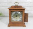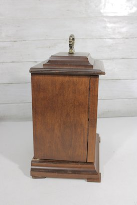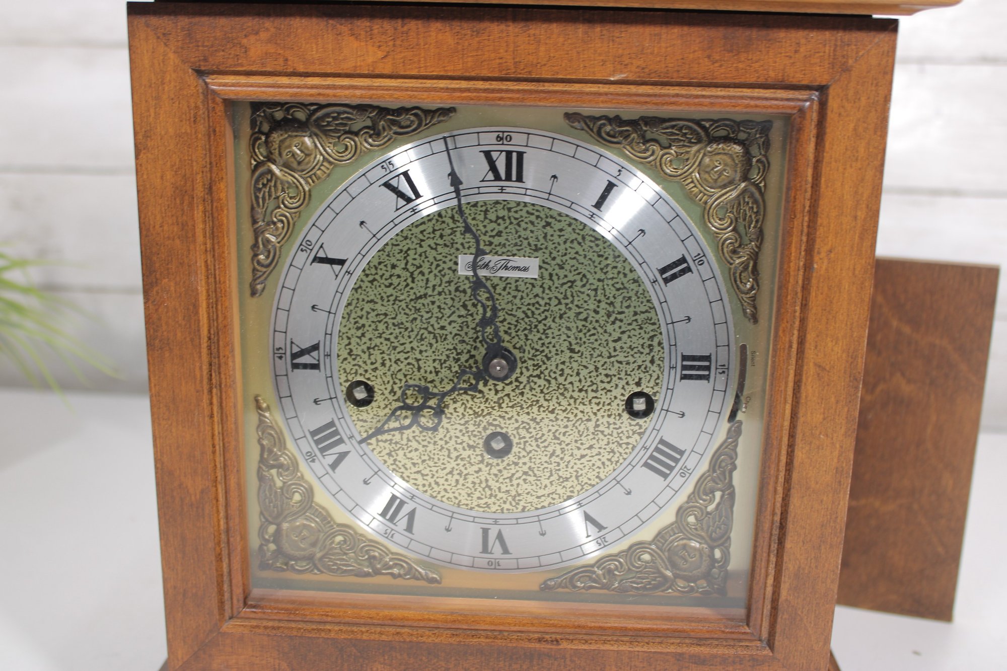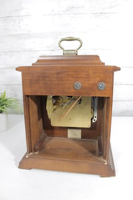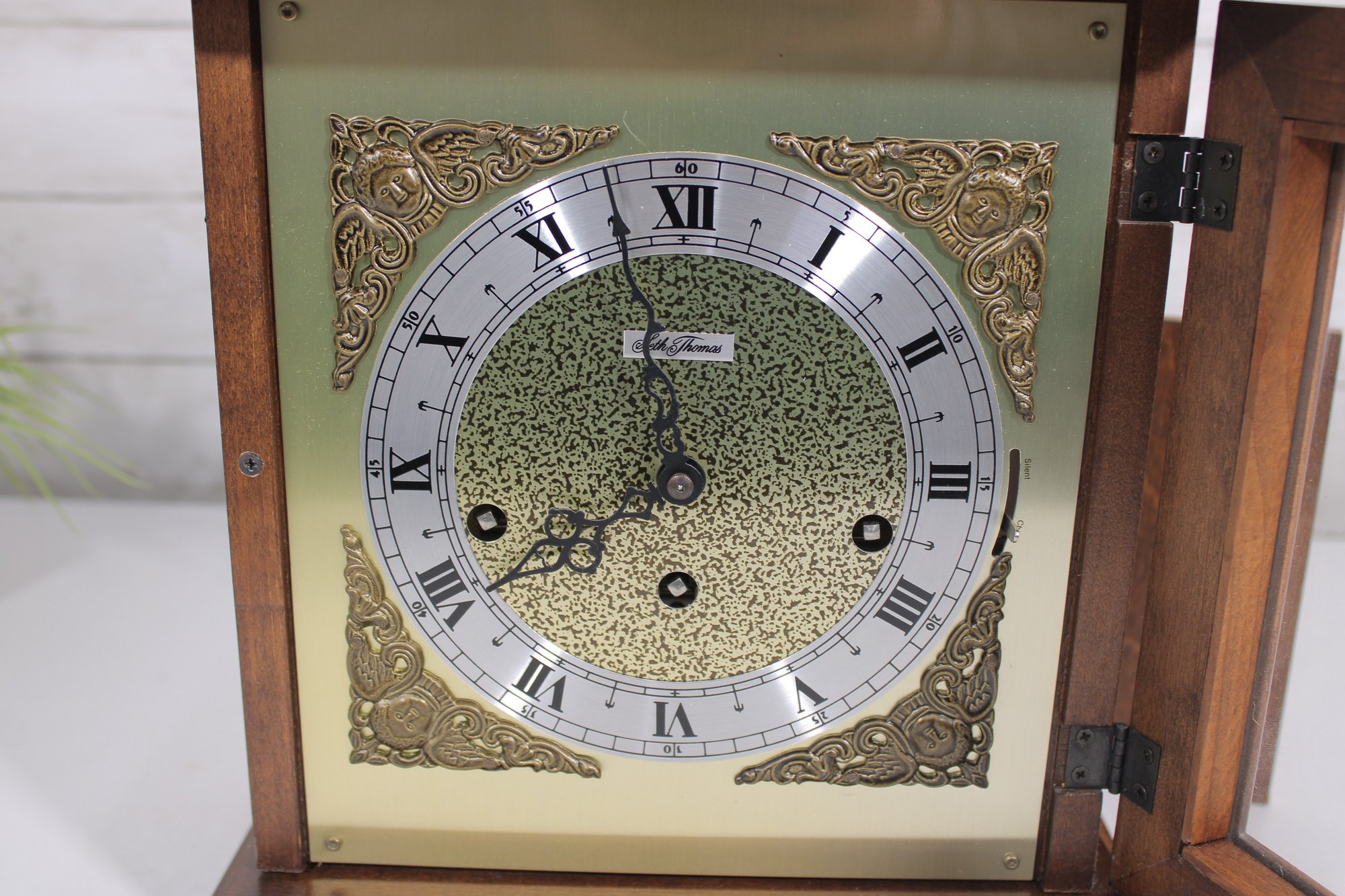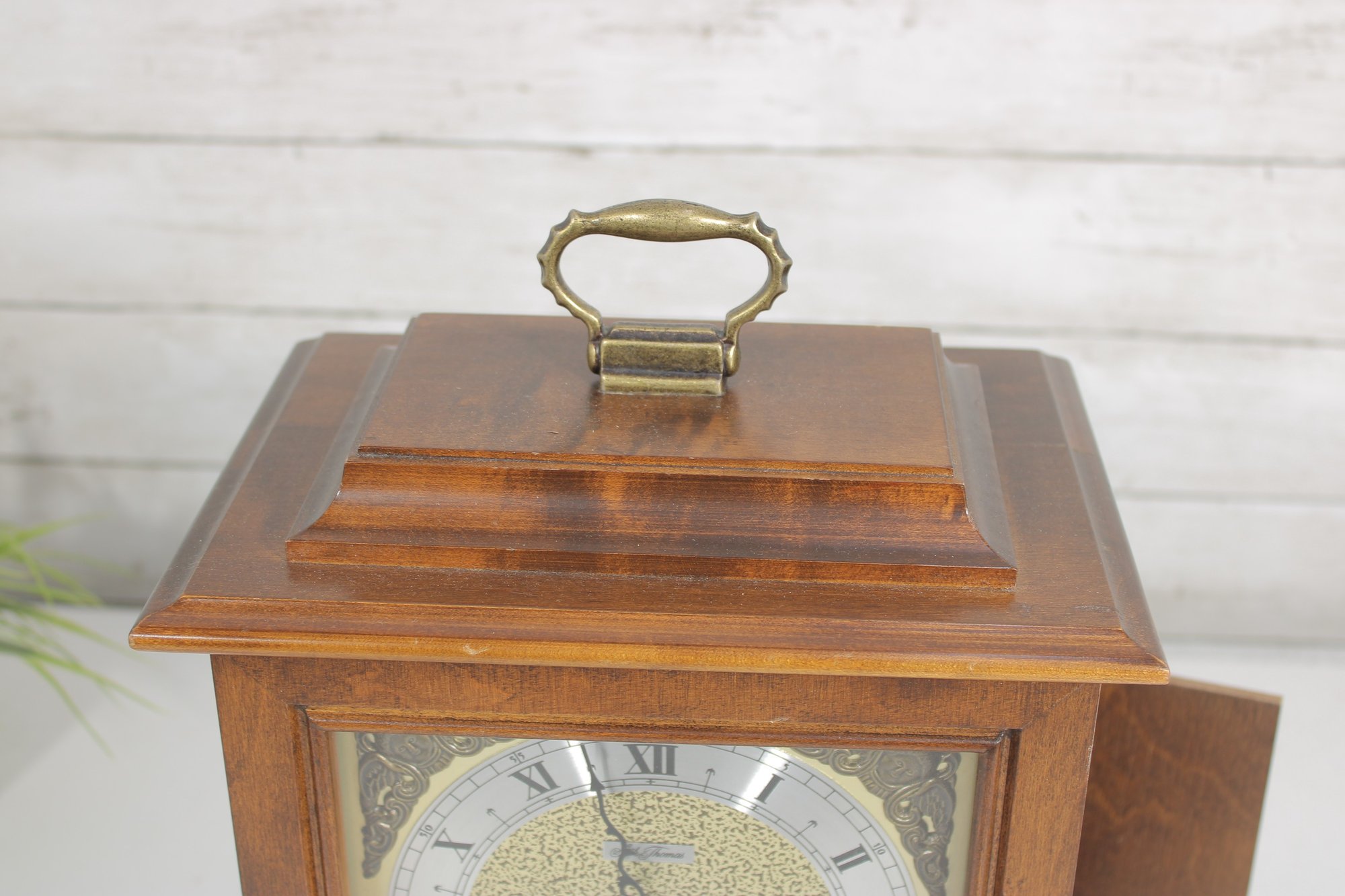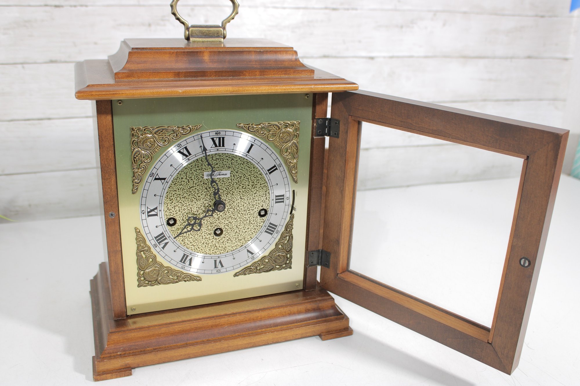 a classic Seth Thomas mantel clock, combining traditional craftsmanship with timeless design. This elegant timepiece features a beautifully finished wooden case with a brass carrying handle and a hinged glass front door for easy access to the dial.