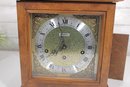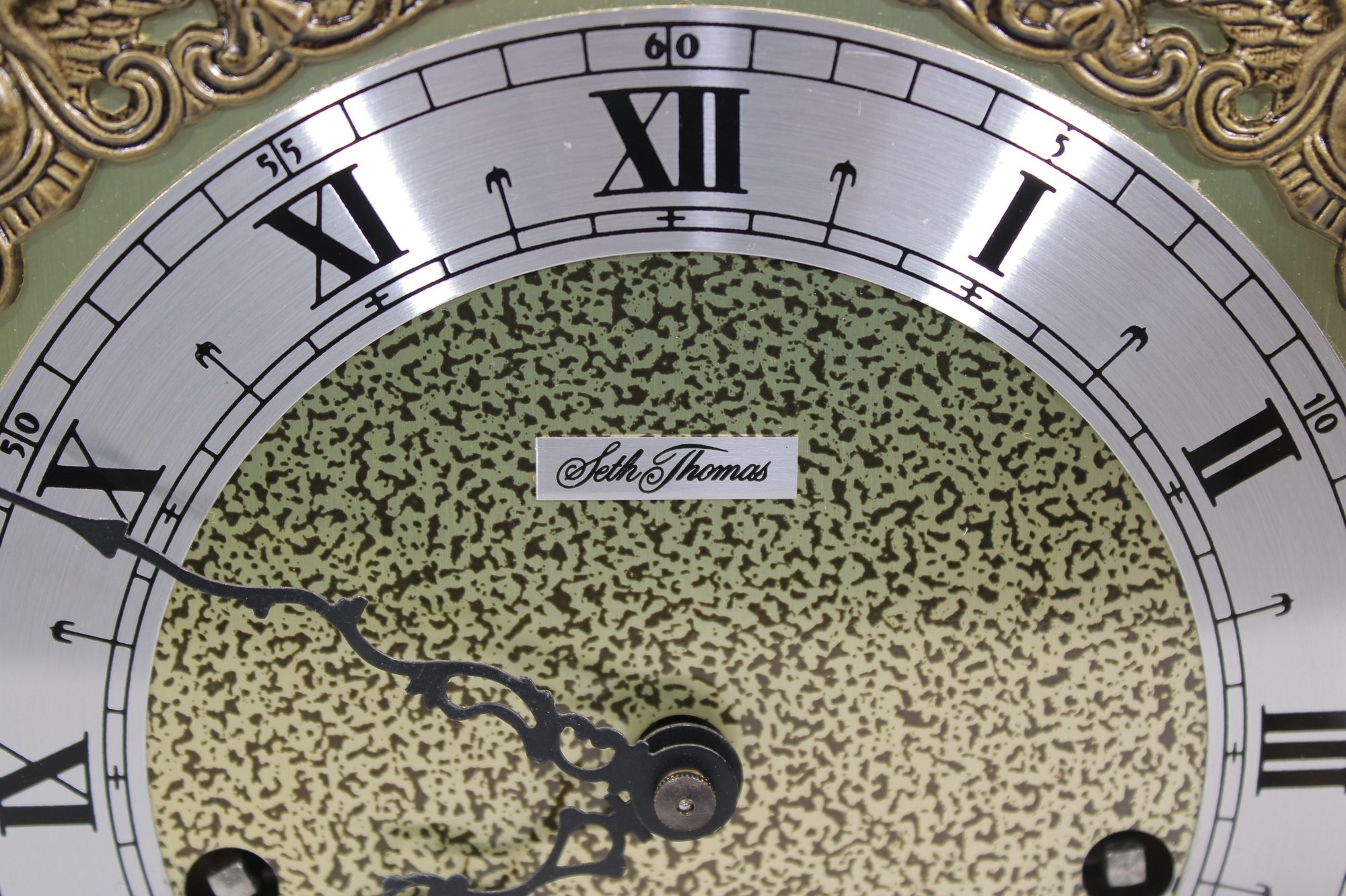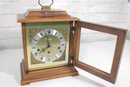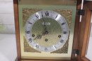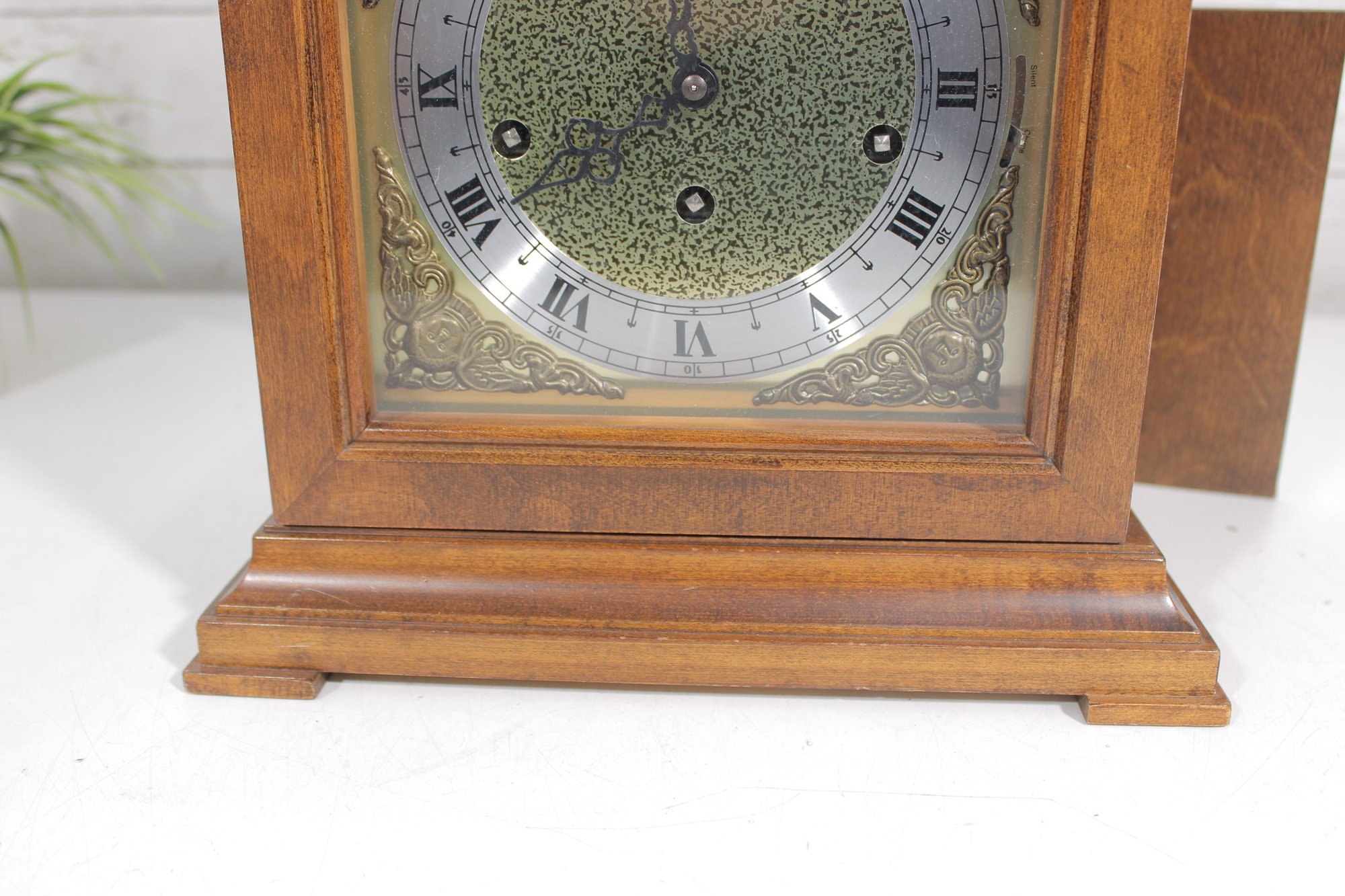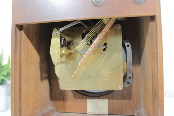 The ornate dial showcases a detailed brass-tone center with a silver chapter ring, Roman numerals, and decorative black hands. The clock is powered by a mechanical key-wind movement and features a Westminster chime, adding both visual and auditory charm.
