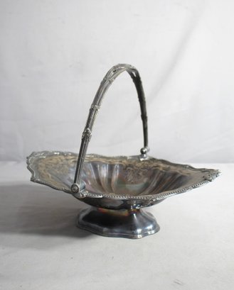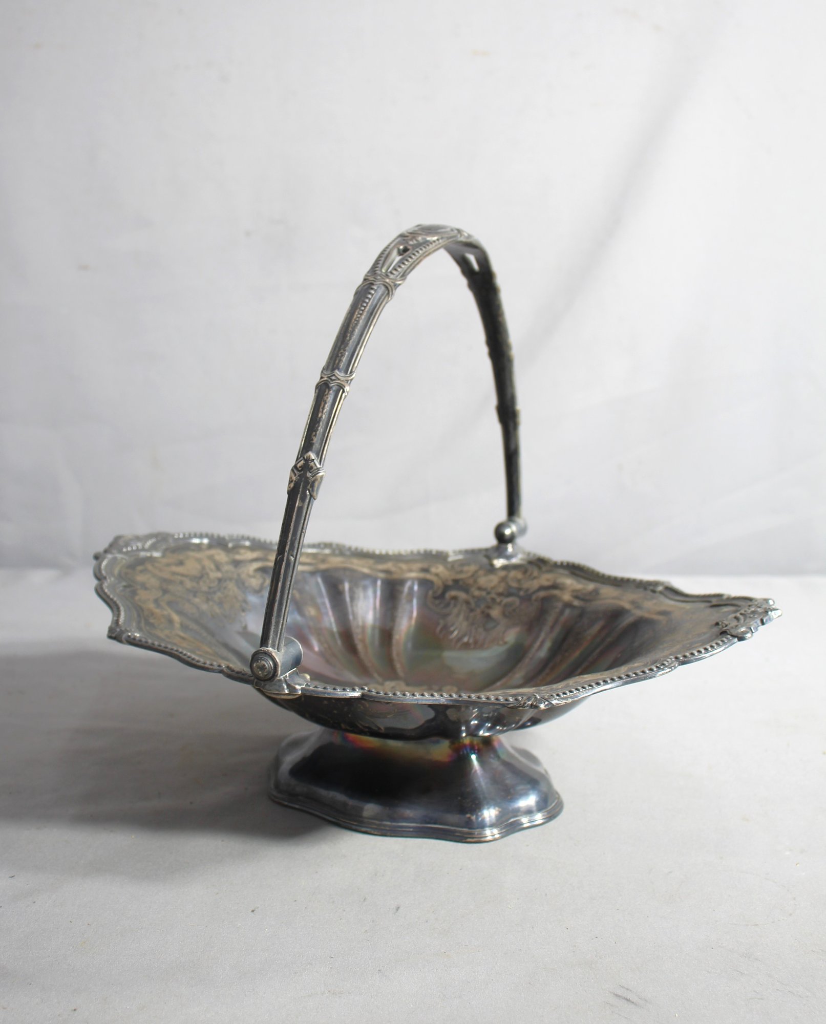 A central handle, affixed with ornamental mounts, allows for easy carrying and adds to the functional elegance of the piece. This feature also allows the basket to be used for a variety of purposes, from serving bread or fruit to displaying as a centerpiece.