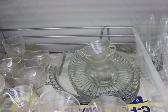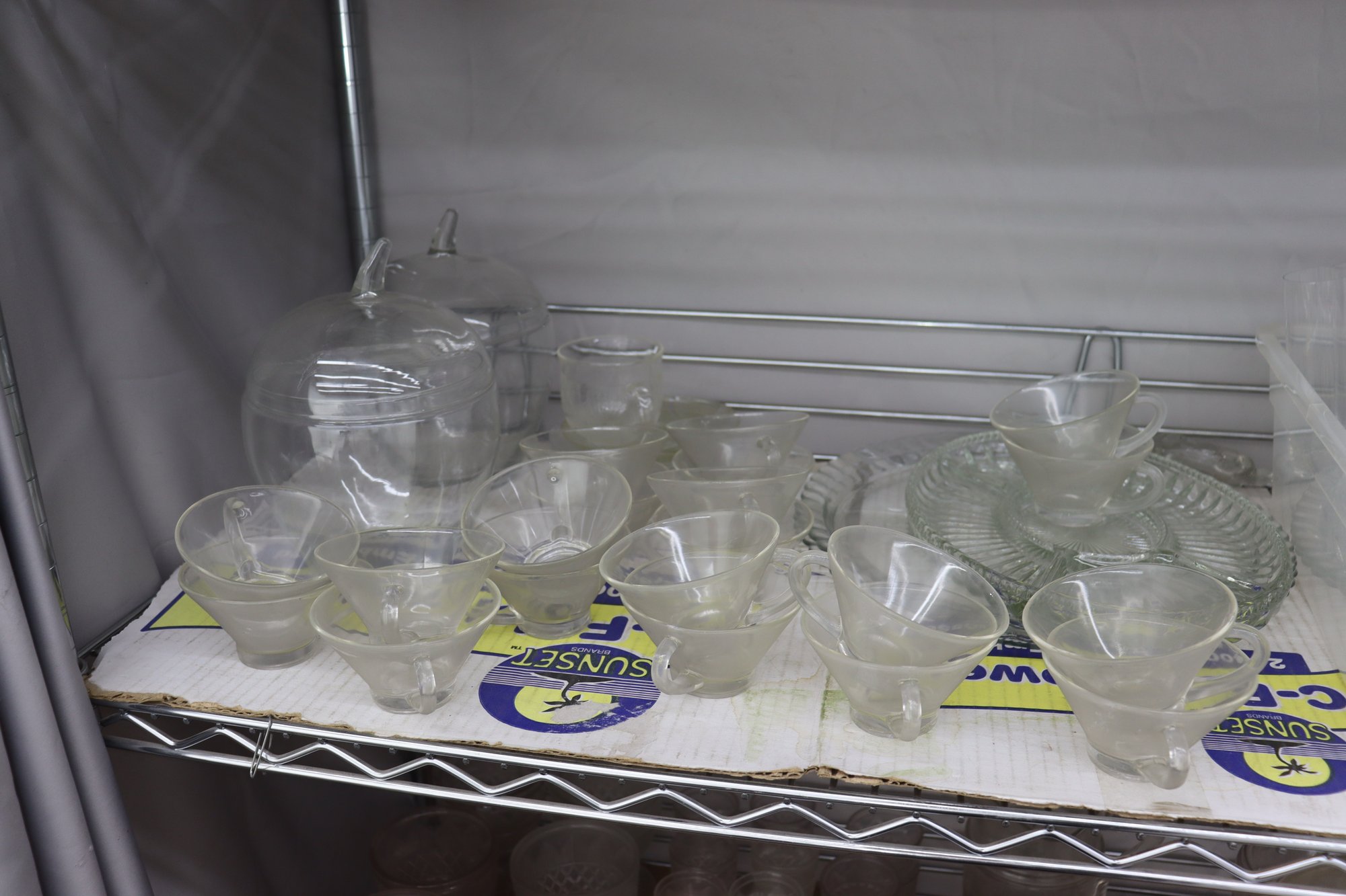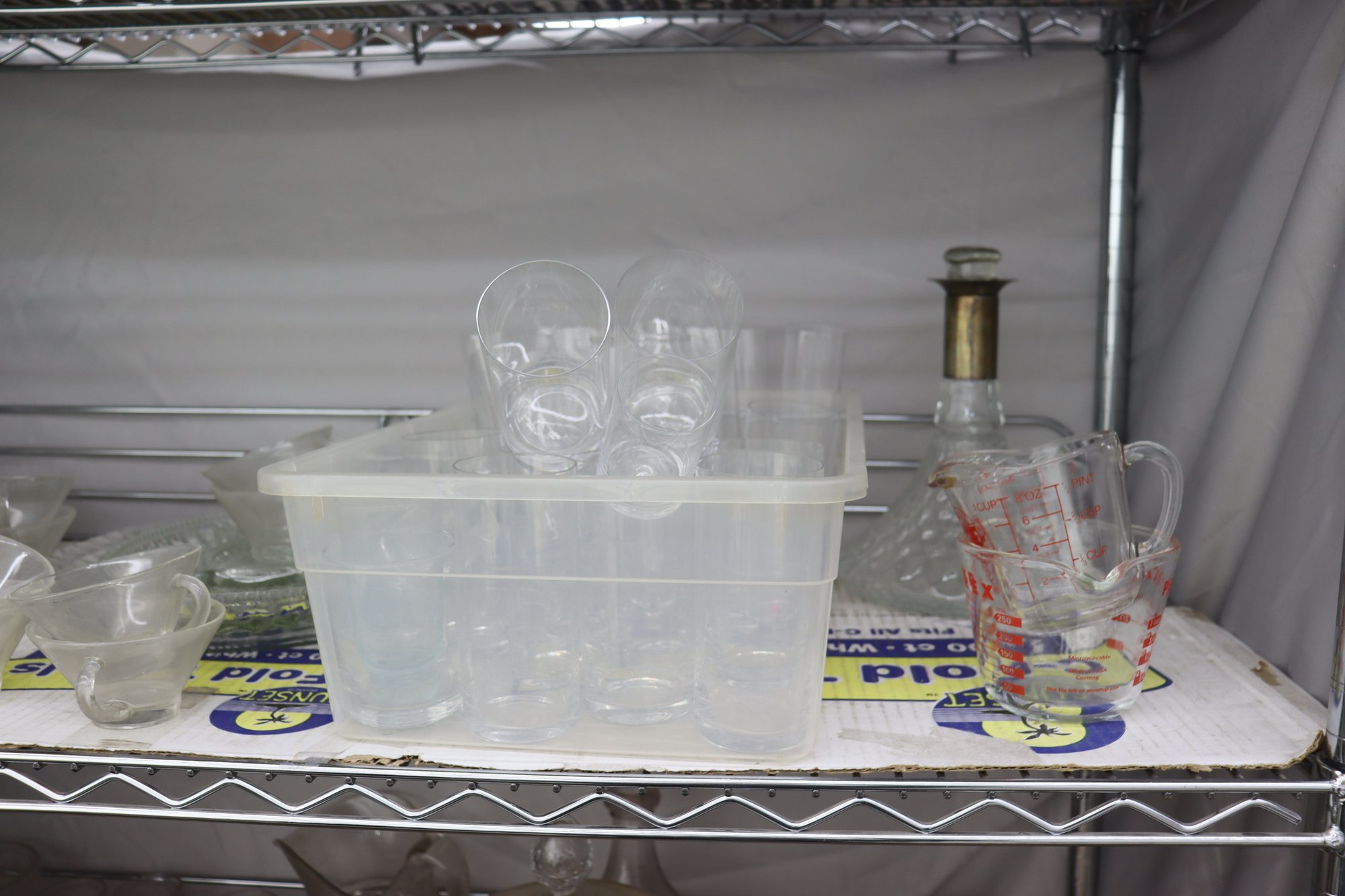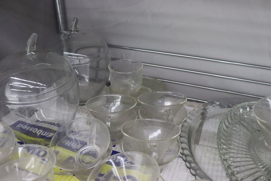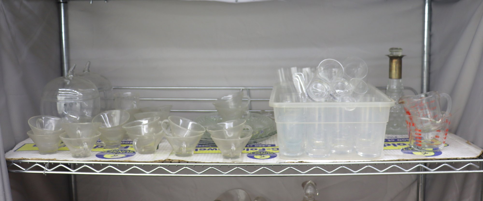 a full shelf lot of clear glassware, sold exactly as shown. This assortment includes a variety of bowls, cups, small dishes, serving pieces, and glass accessories in multiple shapes and sizes.